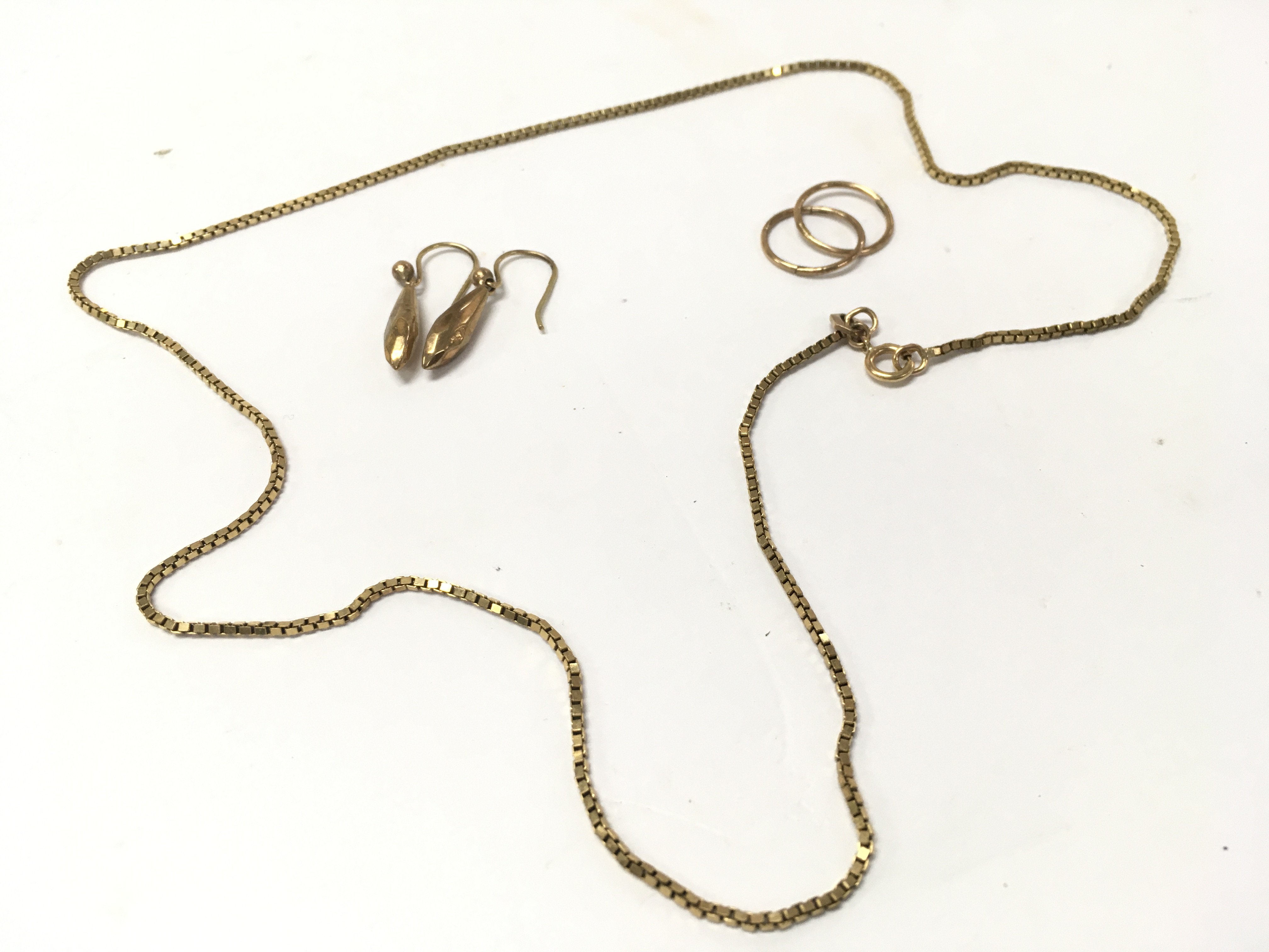 A 9ct gold box chain with two pairs of 9ct gold earrings.
