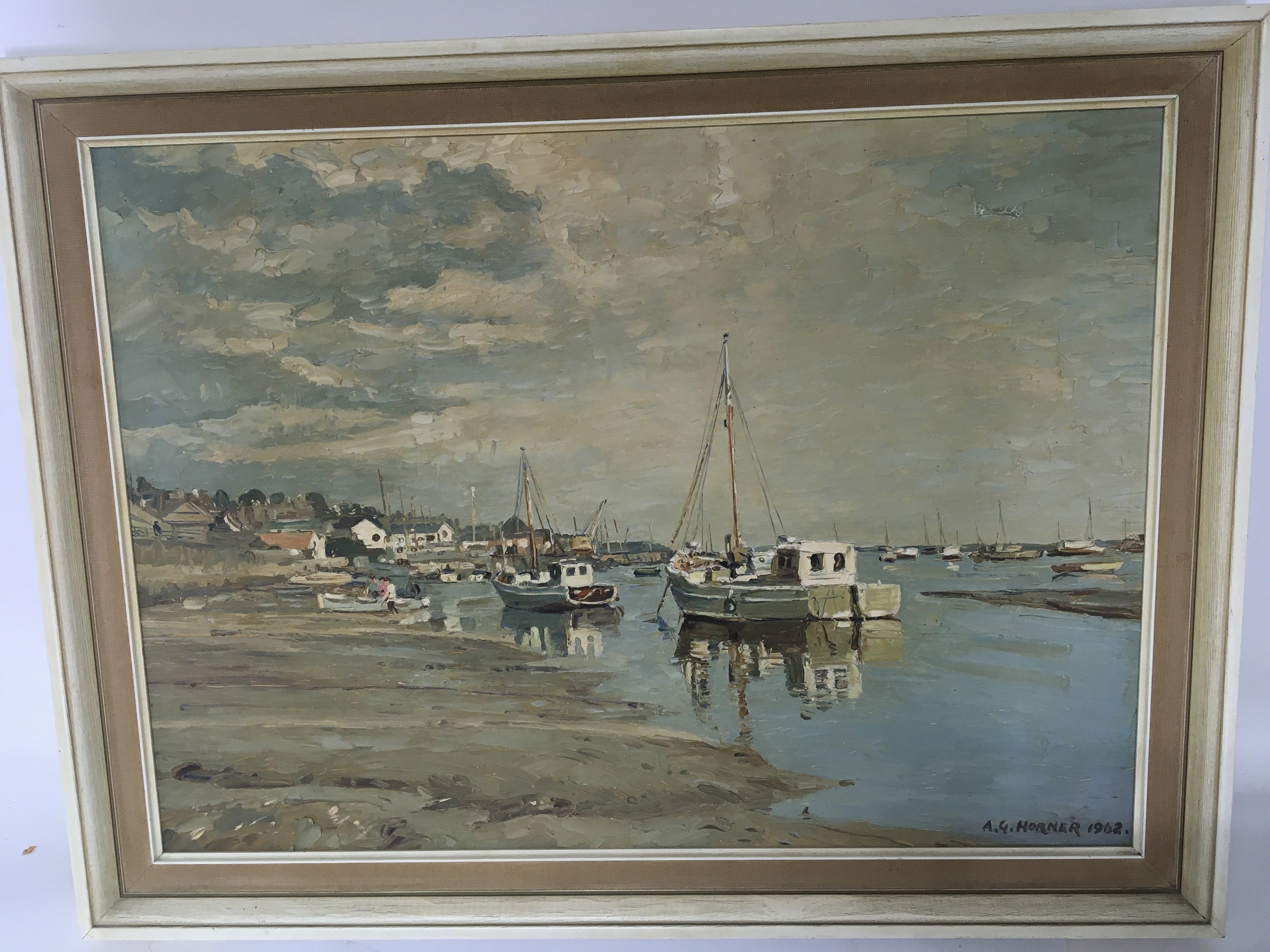 A framed oil painting local marine view with cockle boats signed by A G Horner 1962. 66x52cm