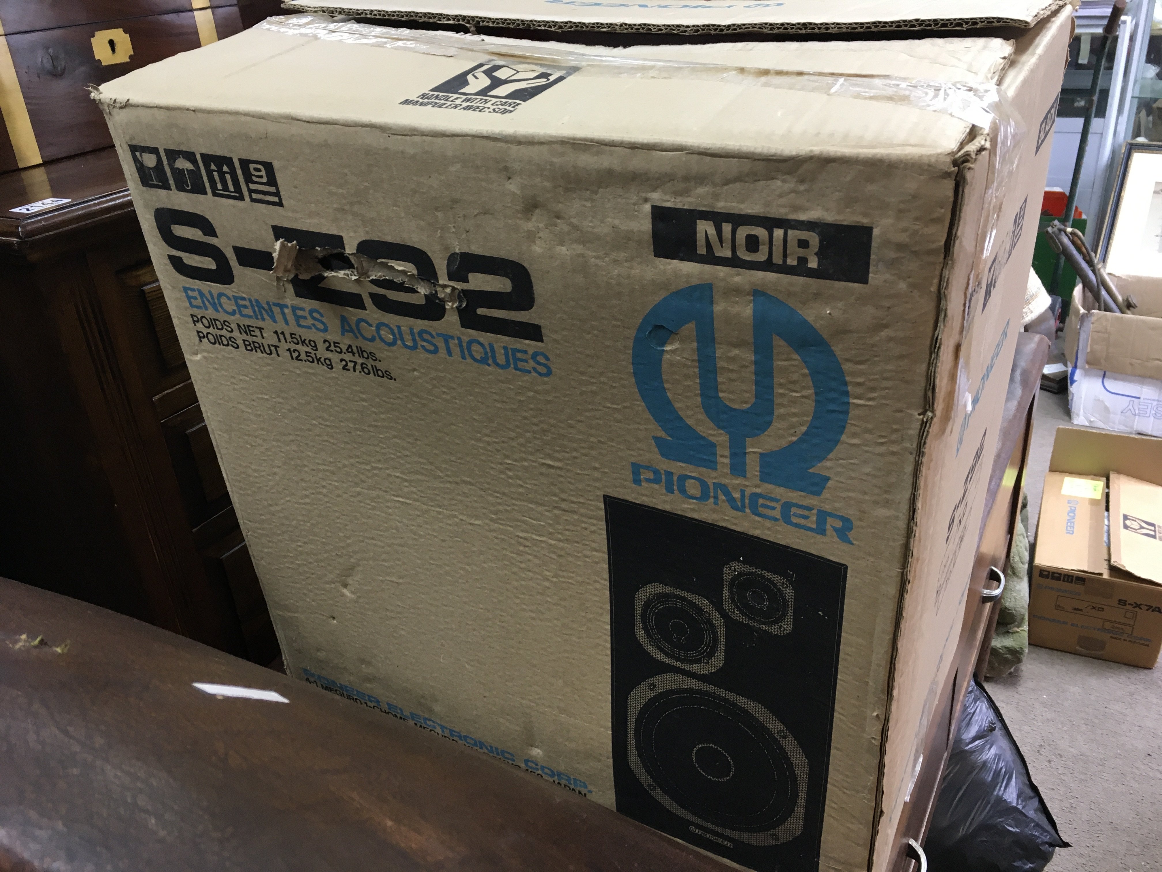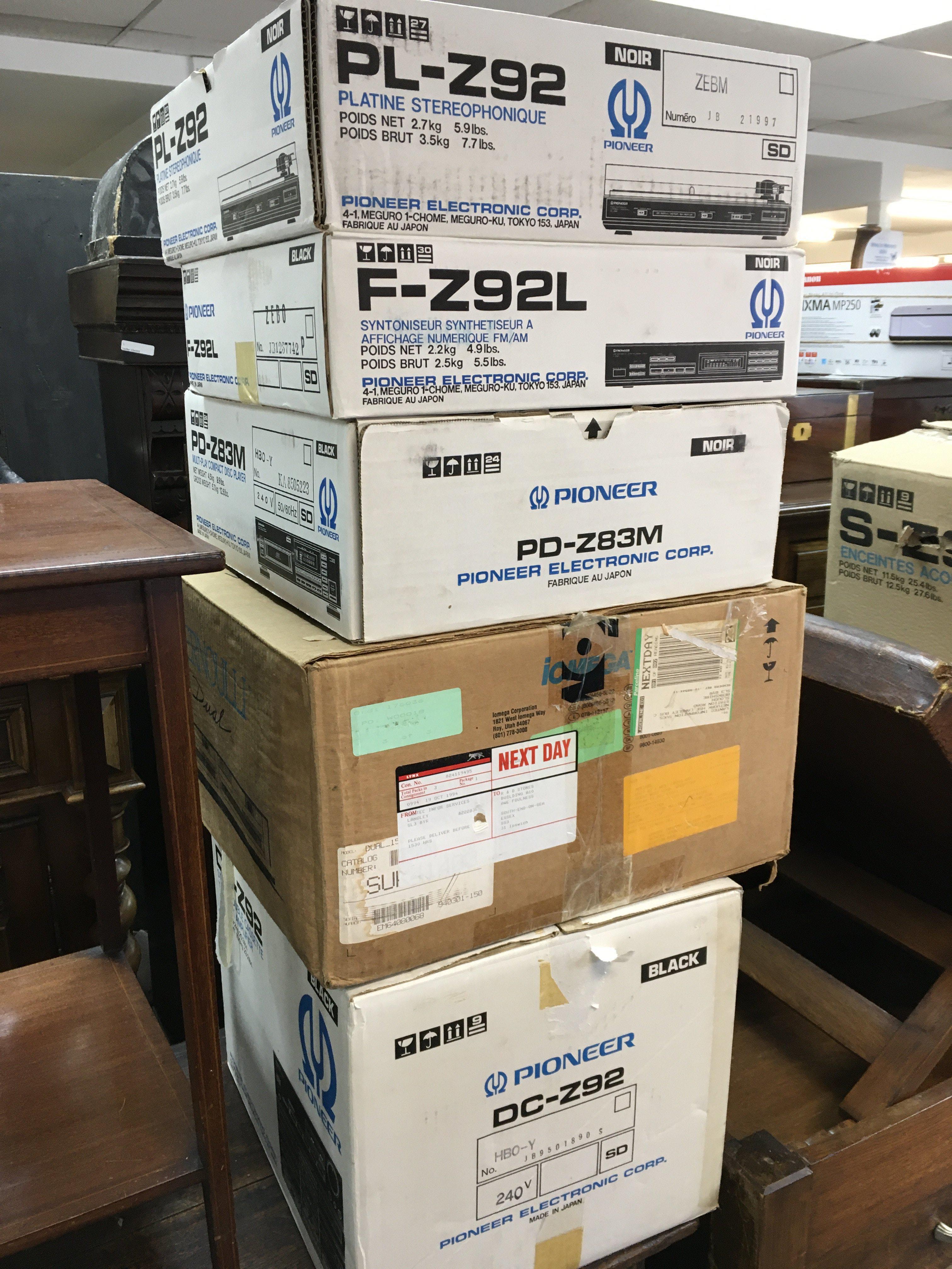 Boxed Hi-Fi equipment including Pioneer S-Z92 Speaker system, PL-Z92 Stereo turntable, F-Z92L FM/AM digital Synthesiser, DC-Z92 Ampli-Cassette stereo, PD-Z83M Multi Play compact disc player ,PL-55X direct drive turntable, S-X7A speakers. This lot cannot be posted
