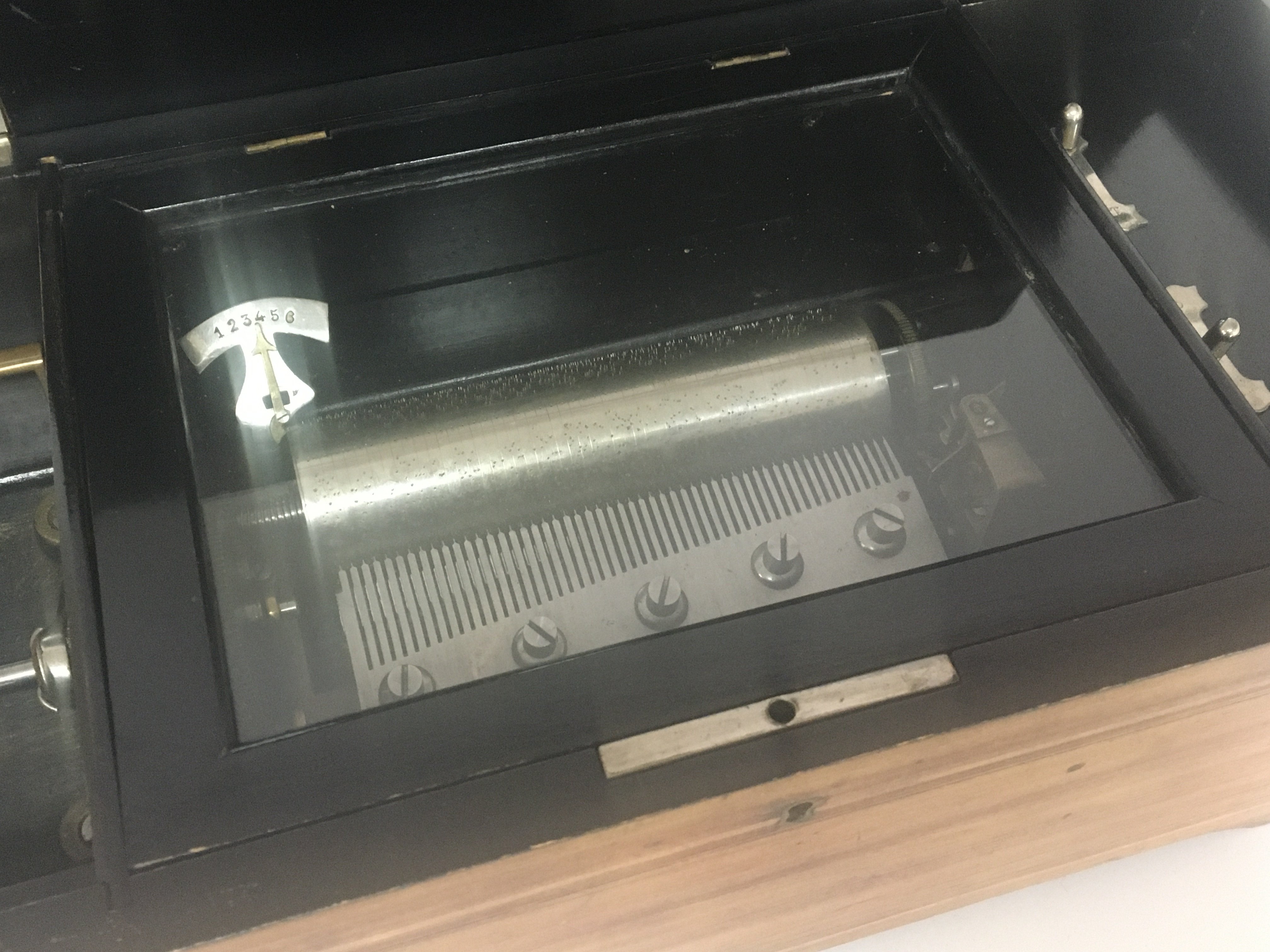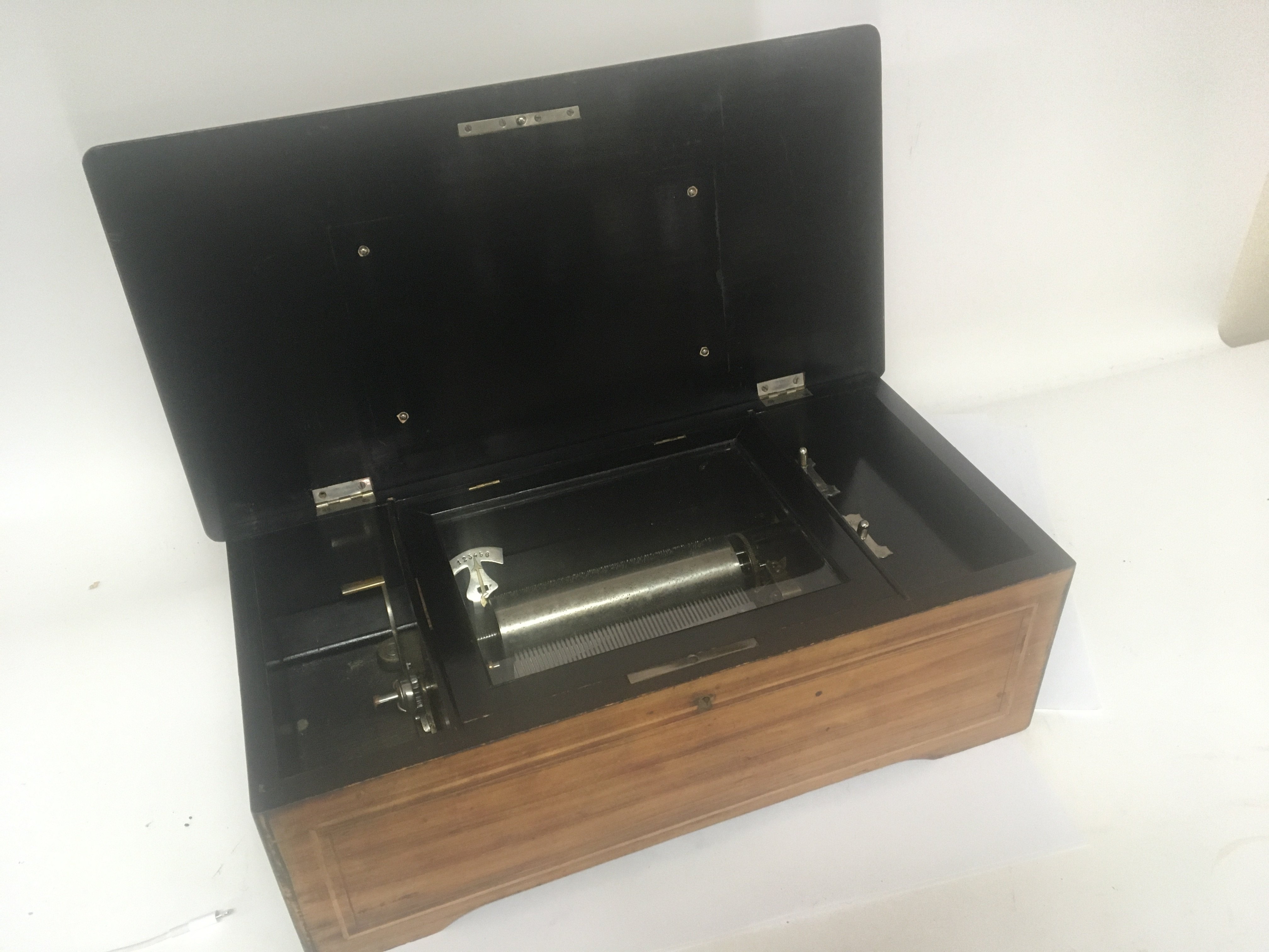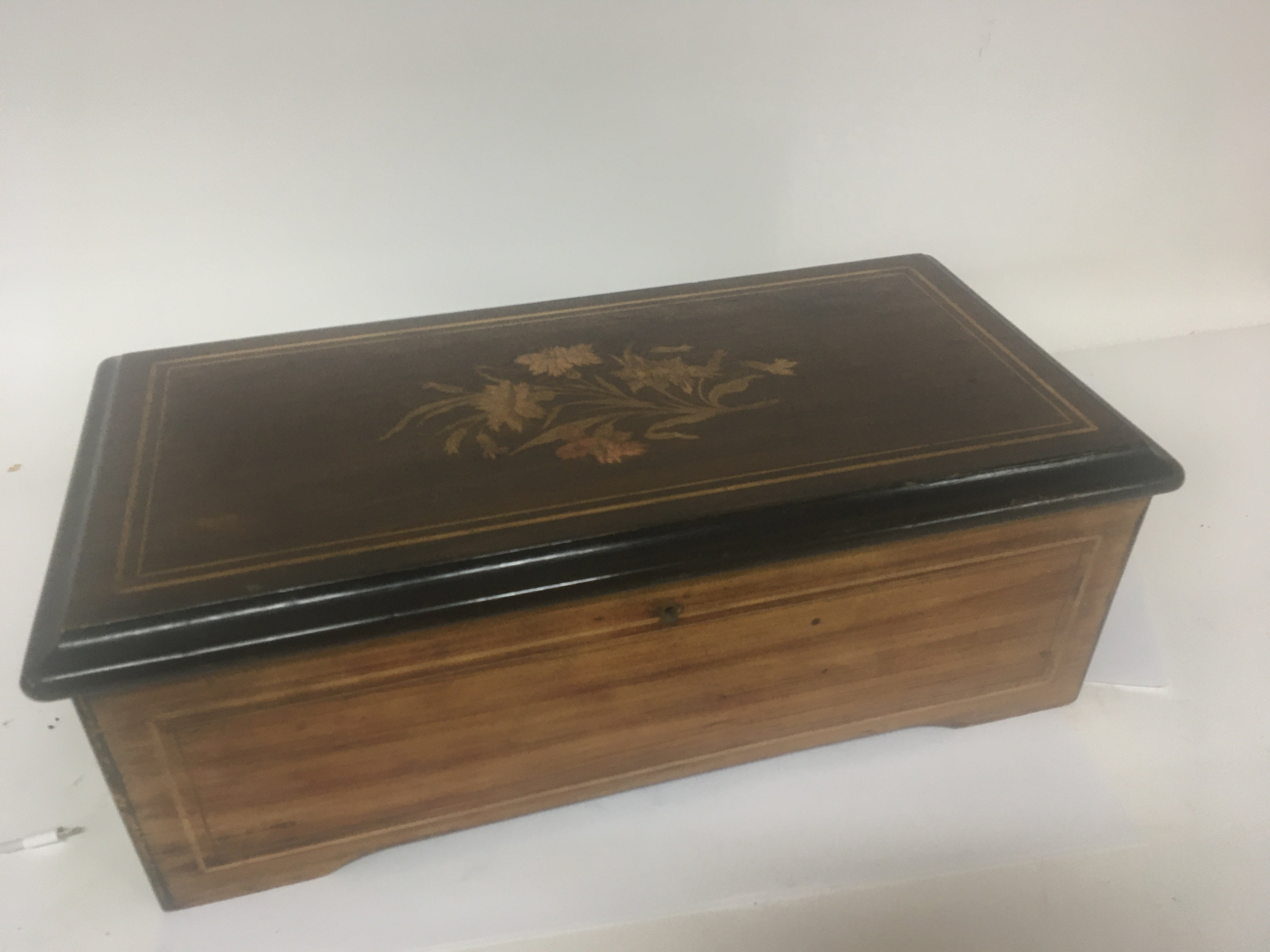 A Victorian Musical box in an inlaid walnut case playing six Airs. Working and with no broken comb prongs. Case 46cm long x 23cm wide