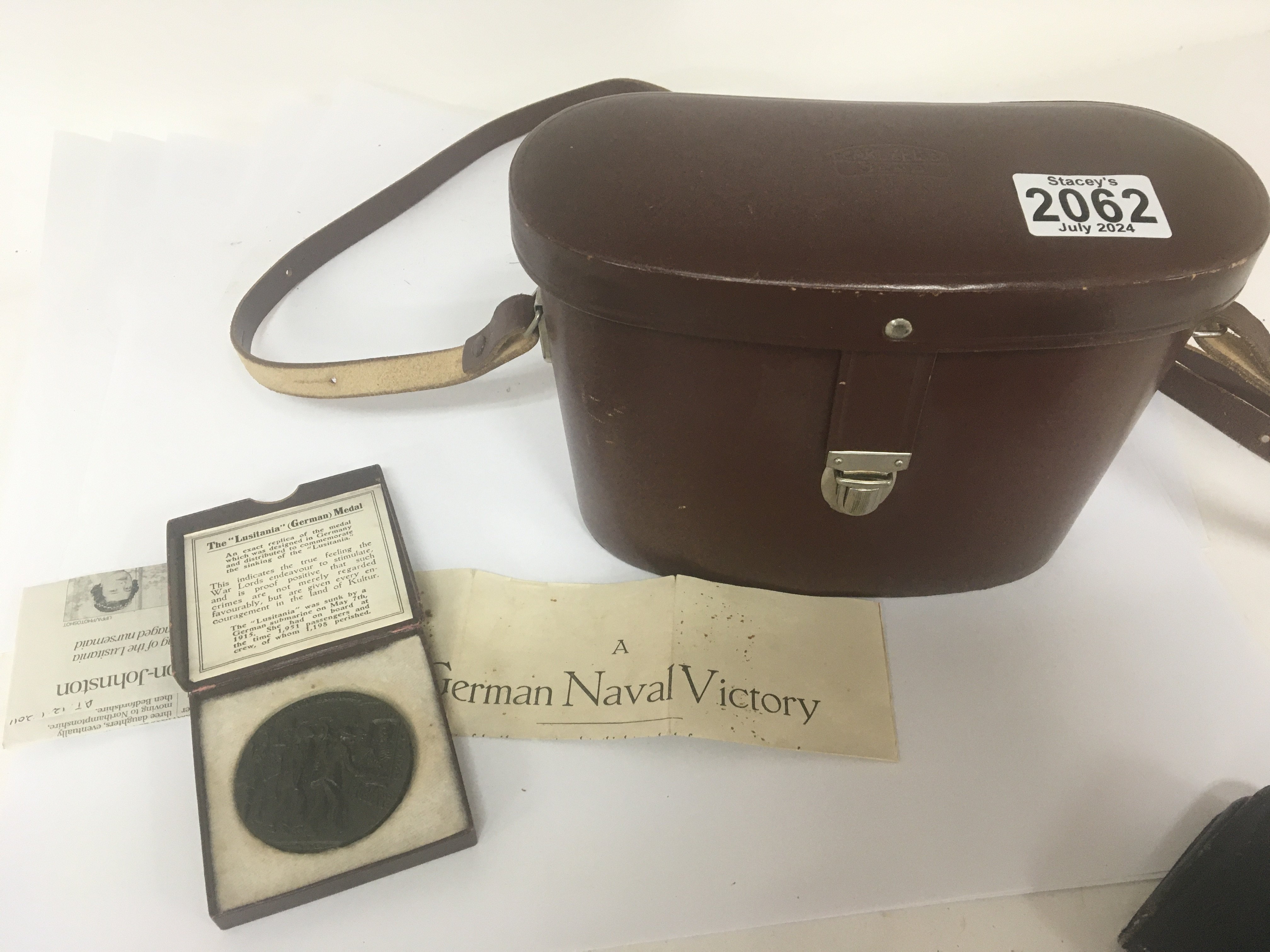 A pair of Carl Zeiss Binoculars and a RMS Lusitania medallion in a fitted box (2)