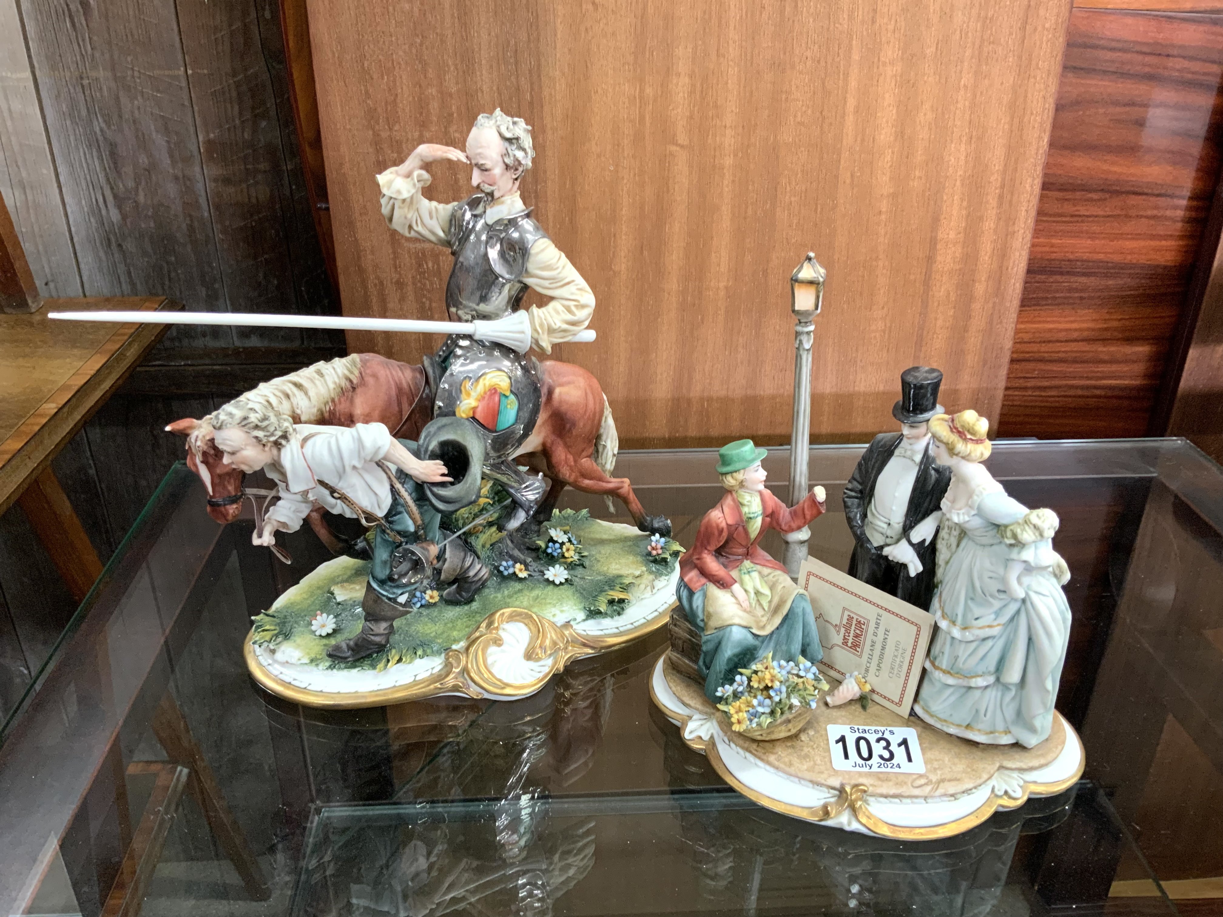A Capodimonte figure of Don Quixote on horseback together with 2 additional Capodimonte porcelain figurine. (D)