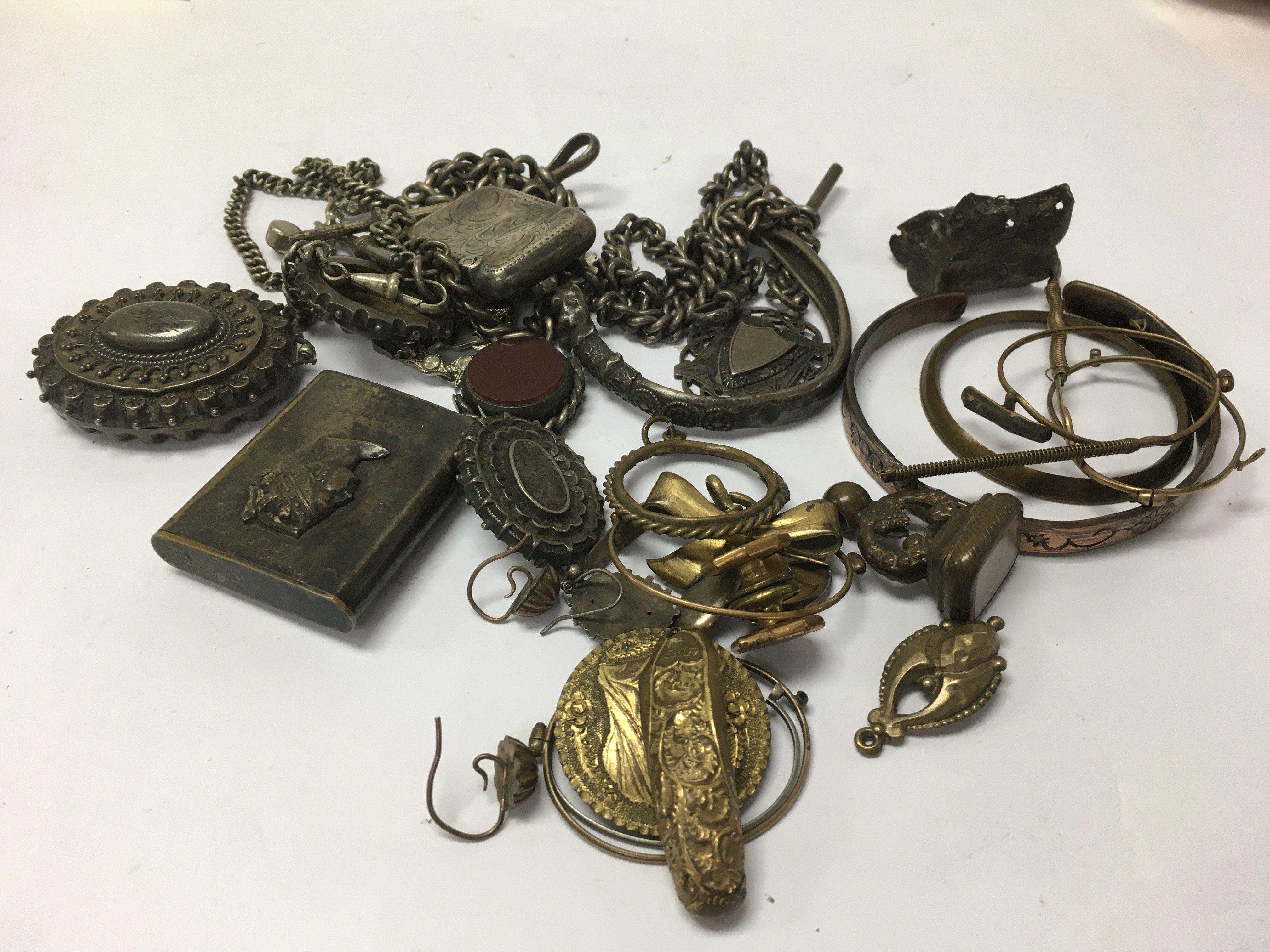 A mixed collection of silver items including Albert chains Vesta cases and other gold plated items.