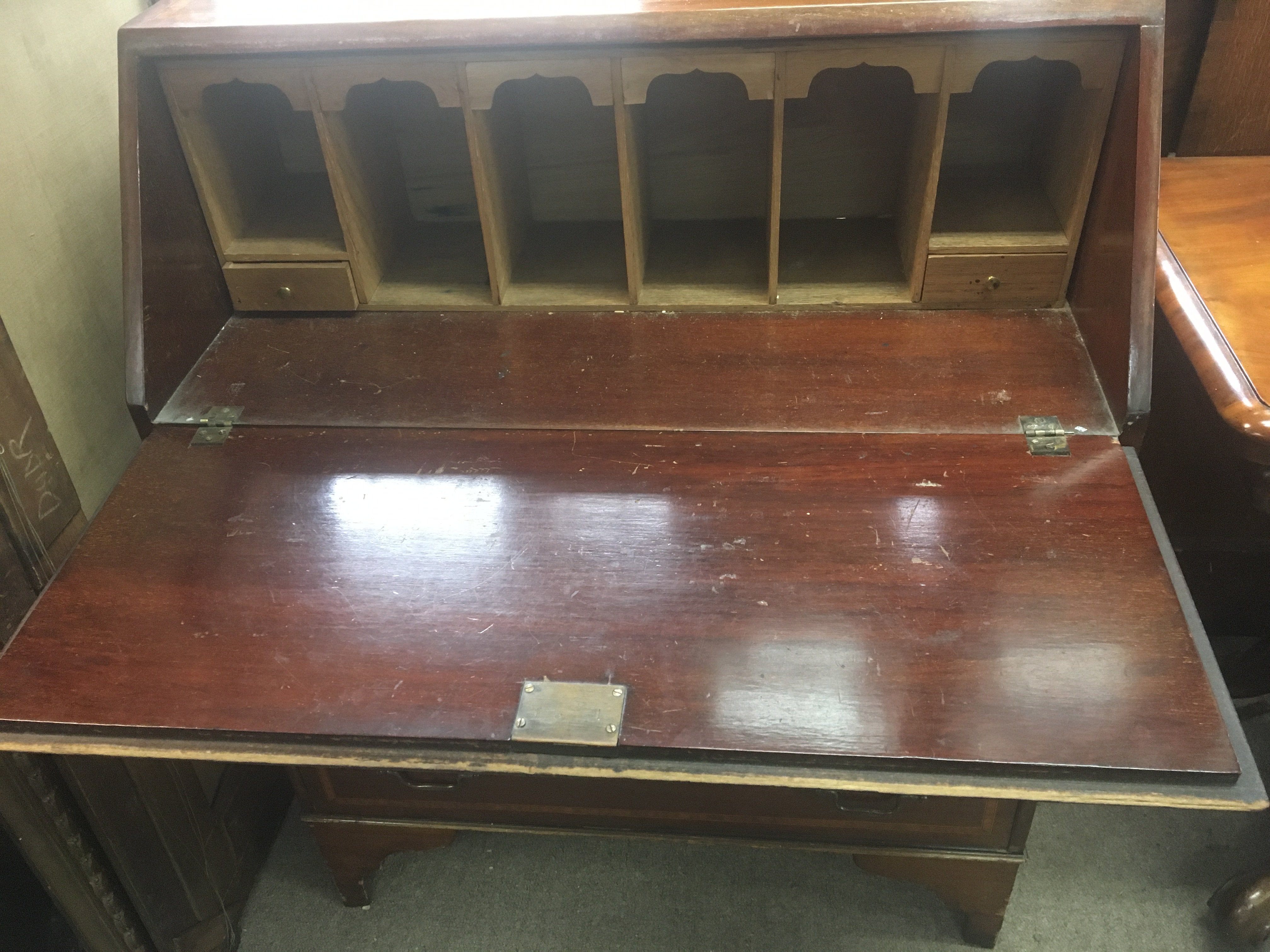 An Edwardian inlaid Mahogany bureau with a well fitted interior above three drawers.