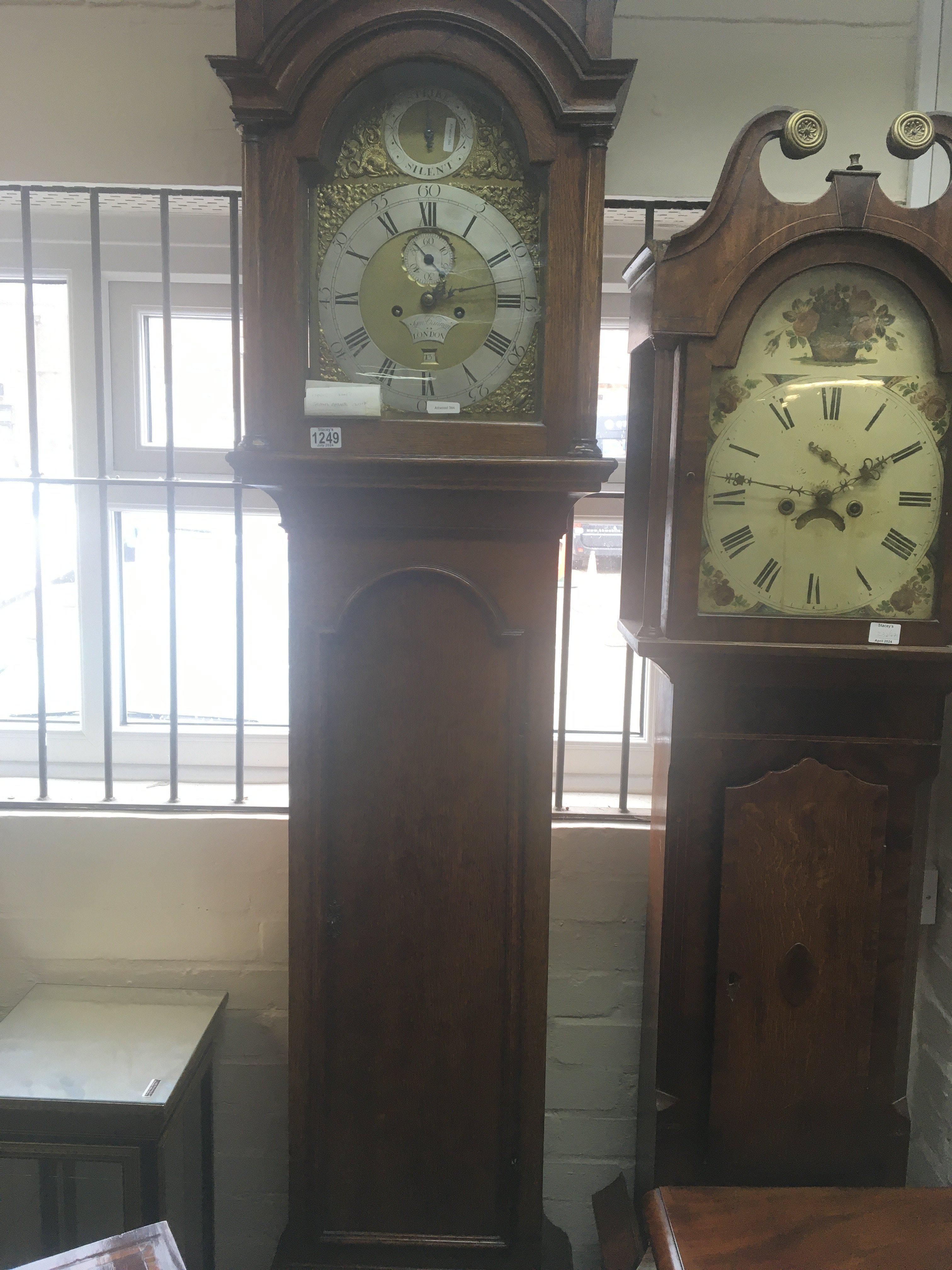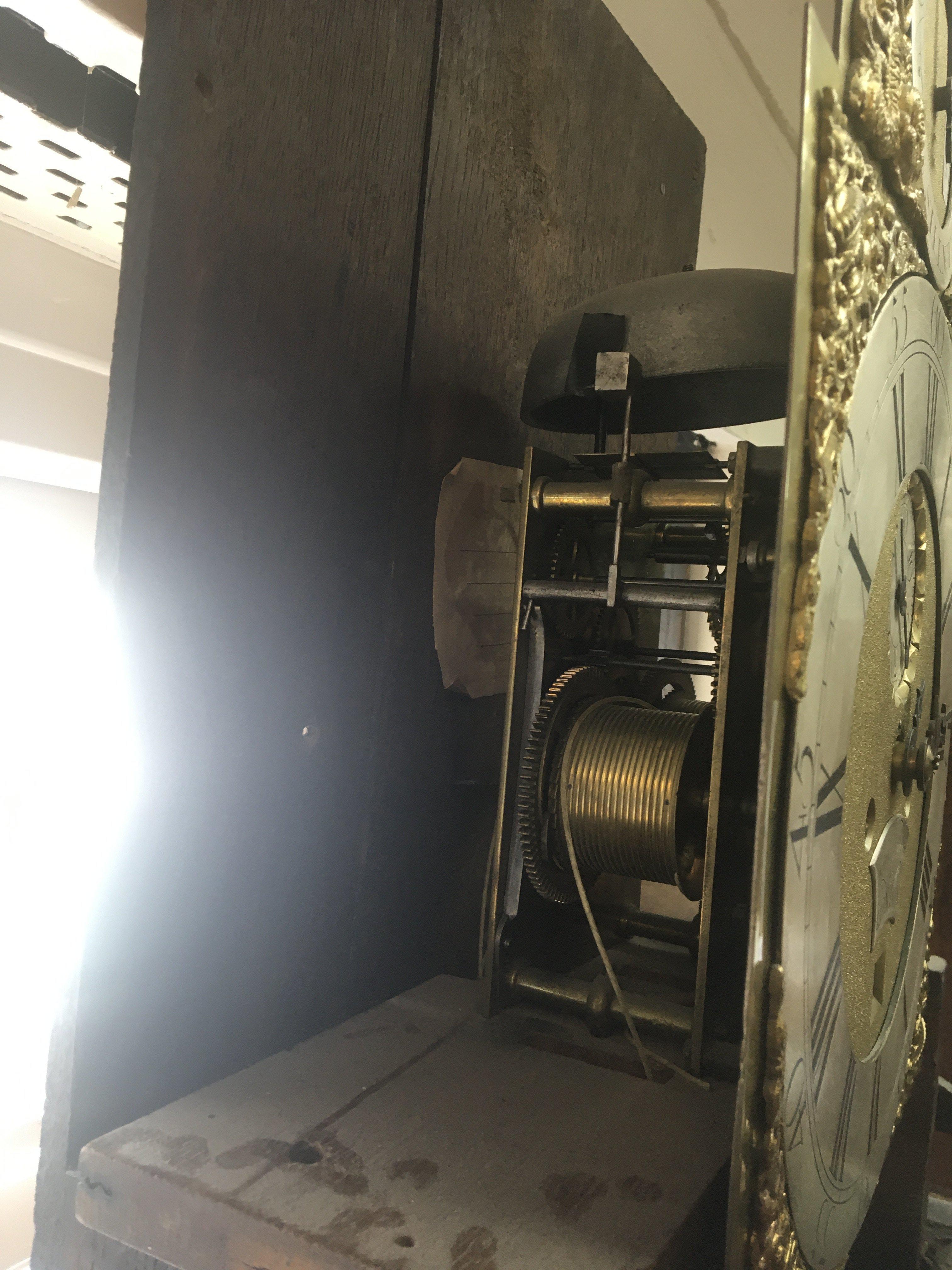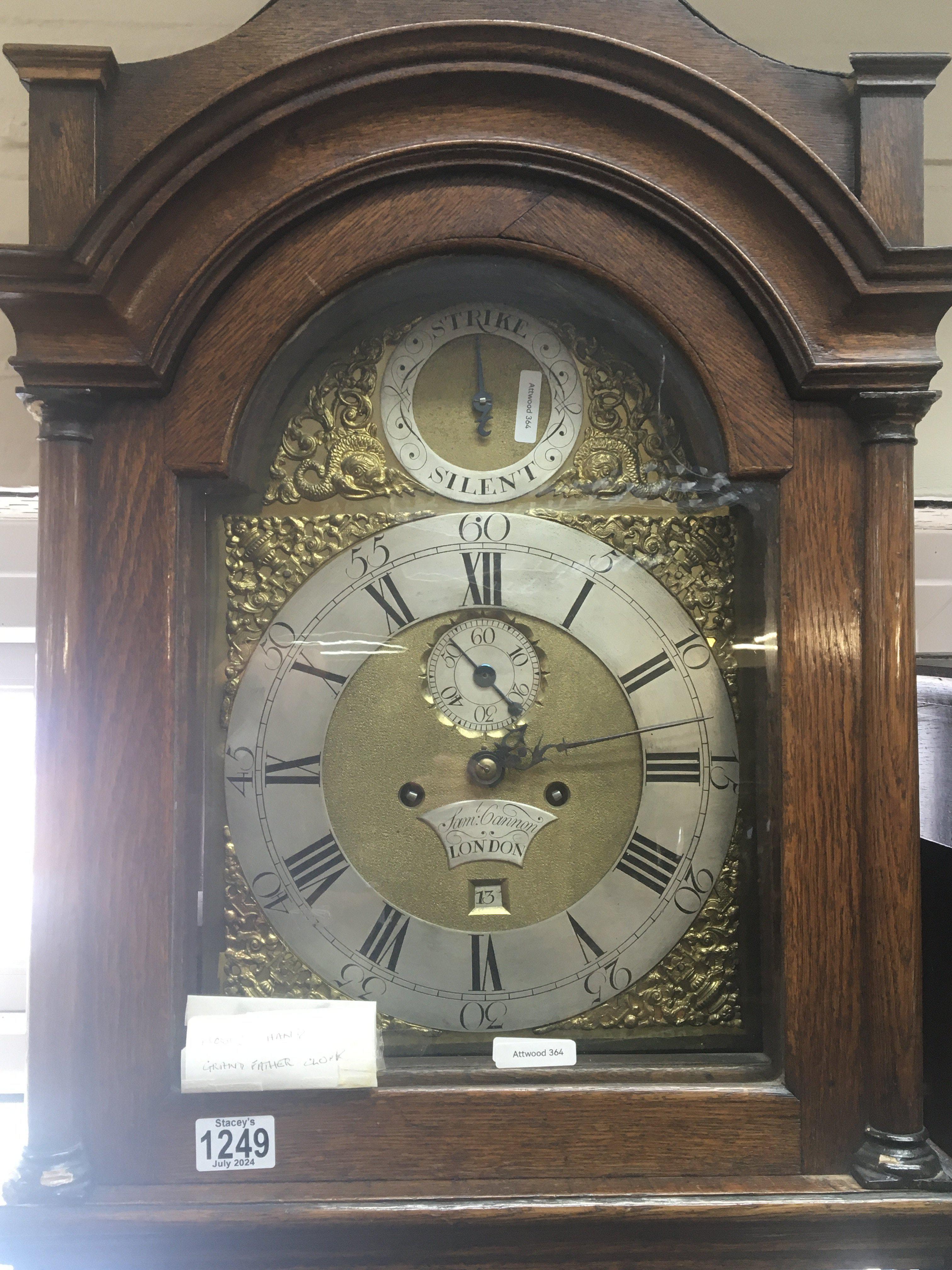 An oak longcase clock the brass dial with silvered chapter ring maker Sam Cannon London eight day going with pendulum and weights.