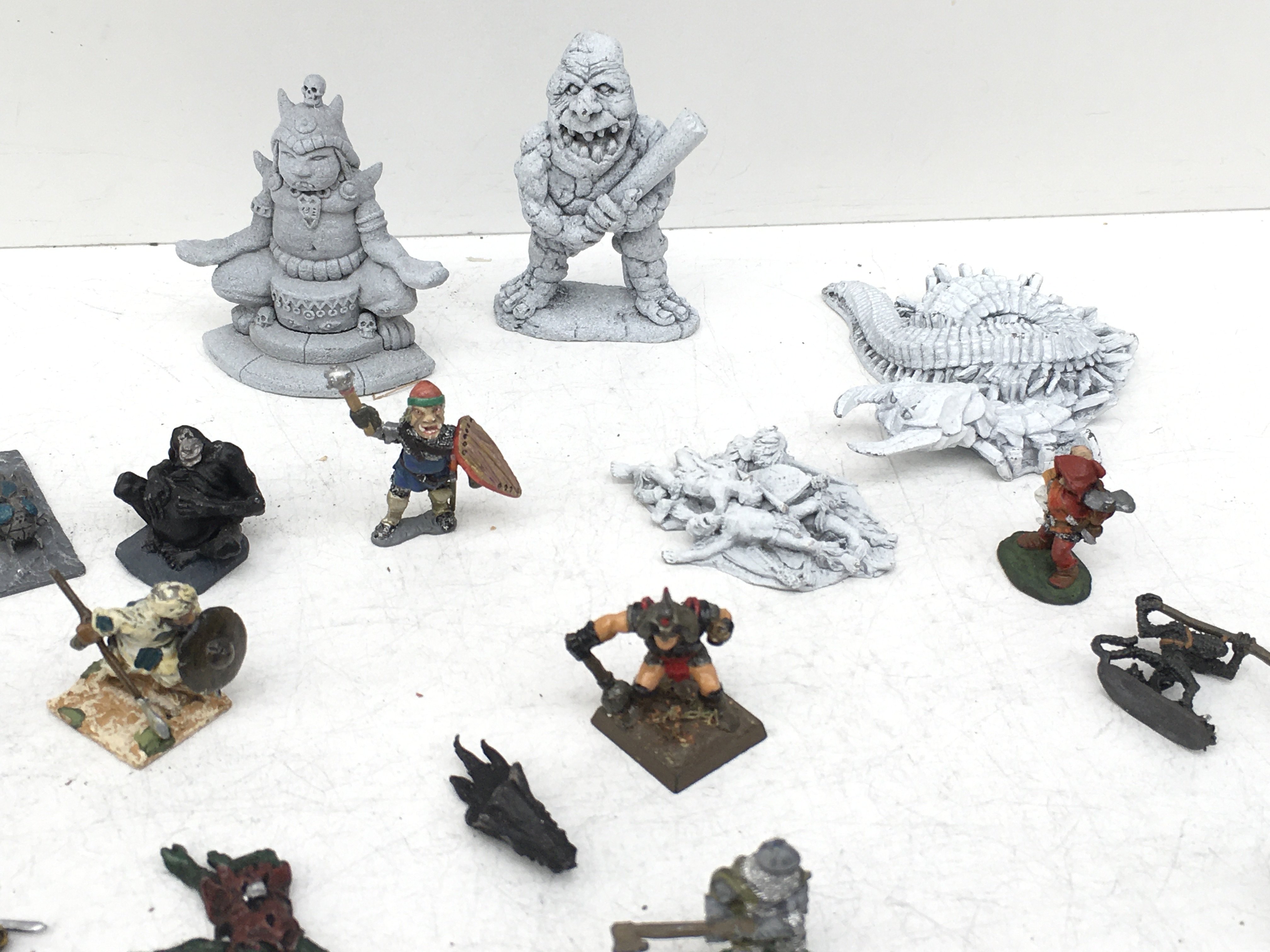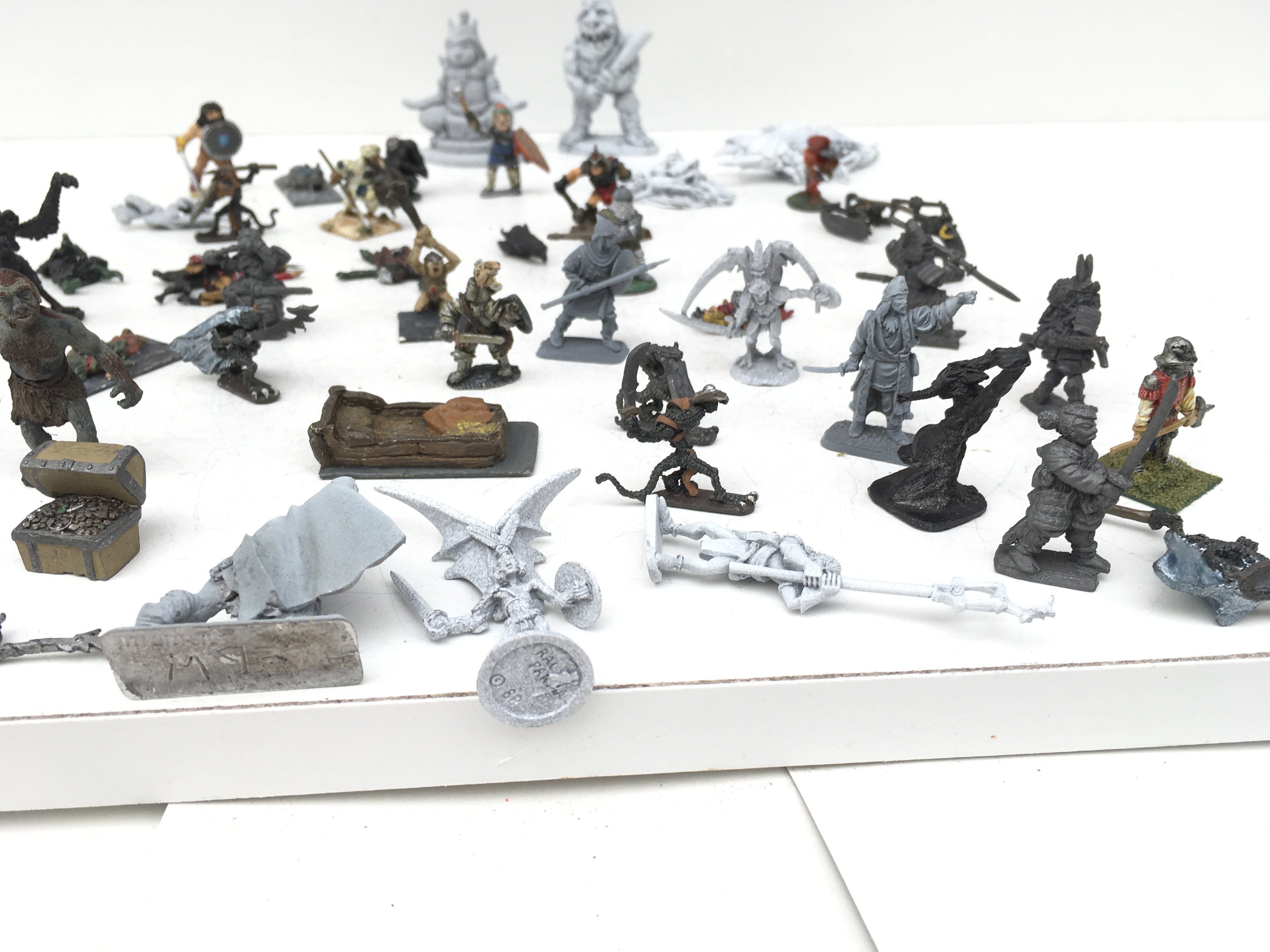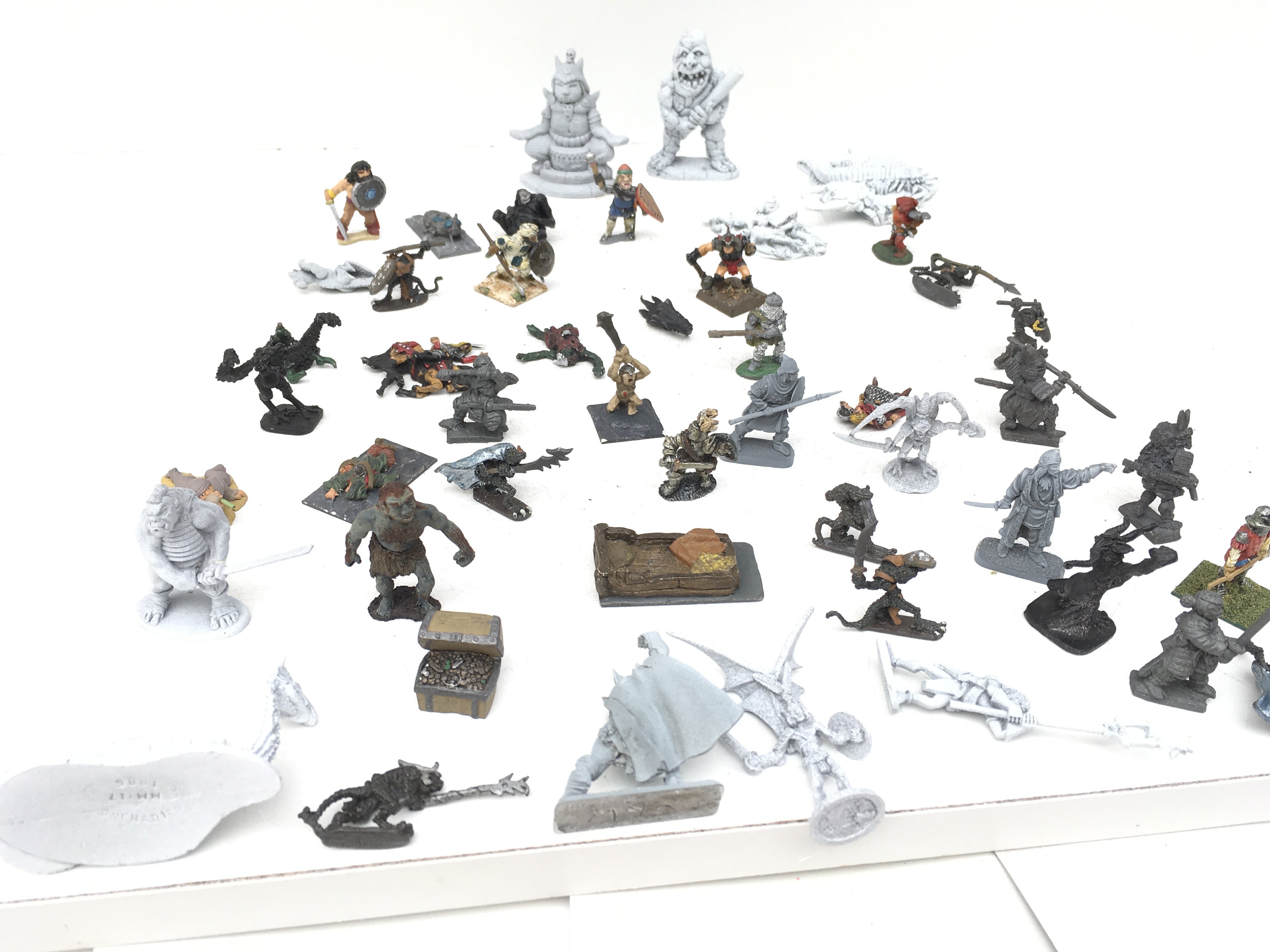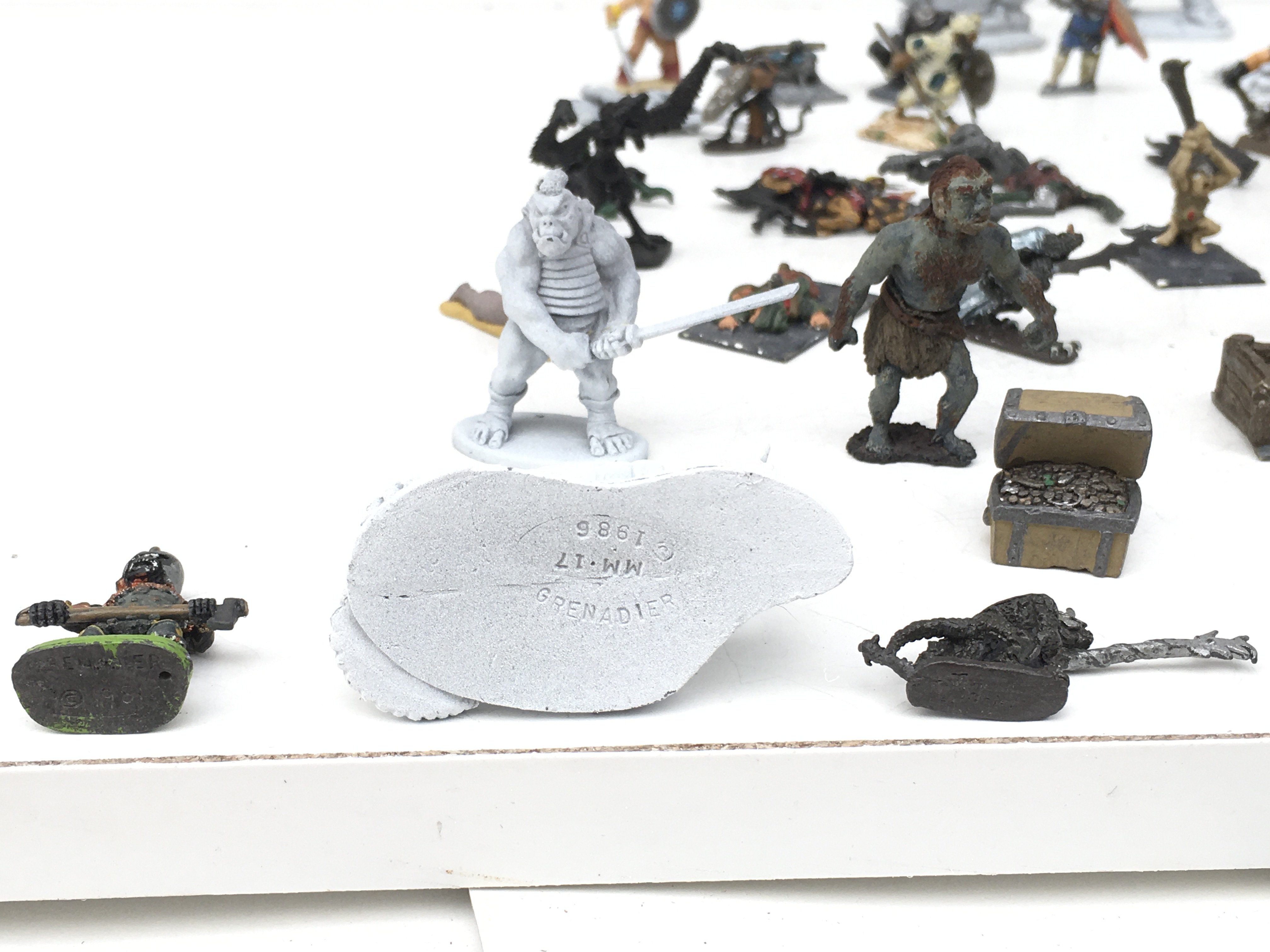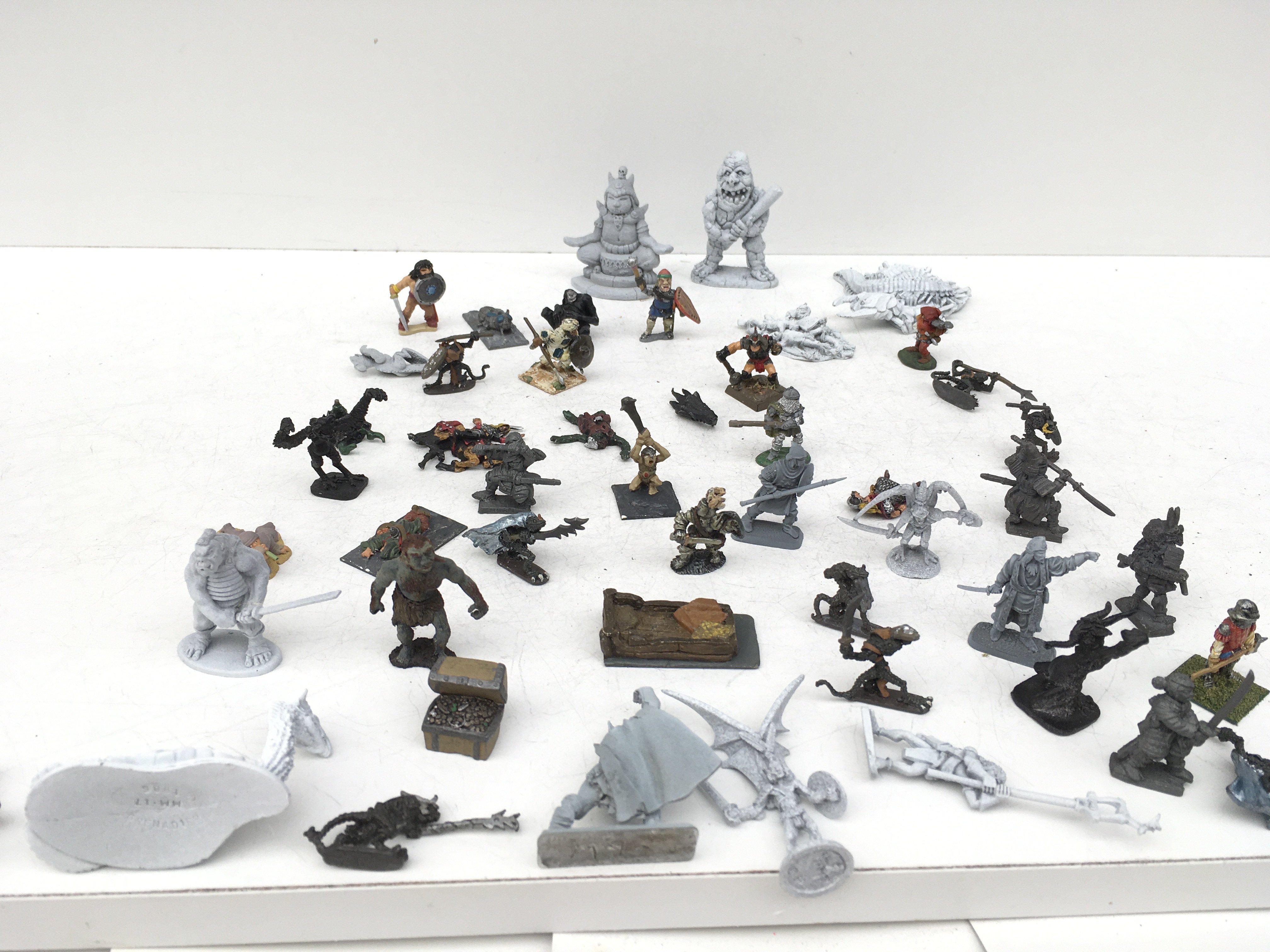 A box containing approximately 50 metal model figures and accessories from a Warhammer collection. Mostly painted. Made by GRENADIER..RAL PARTHA and others.
