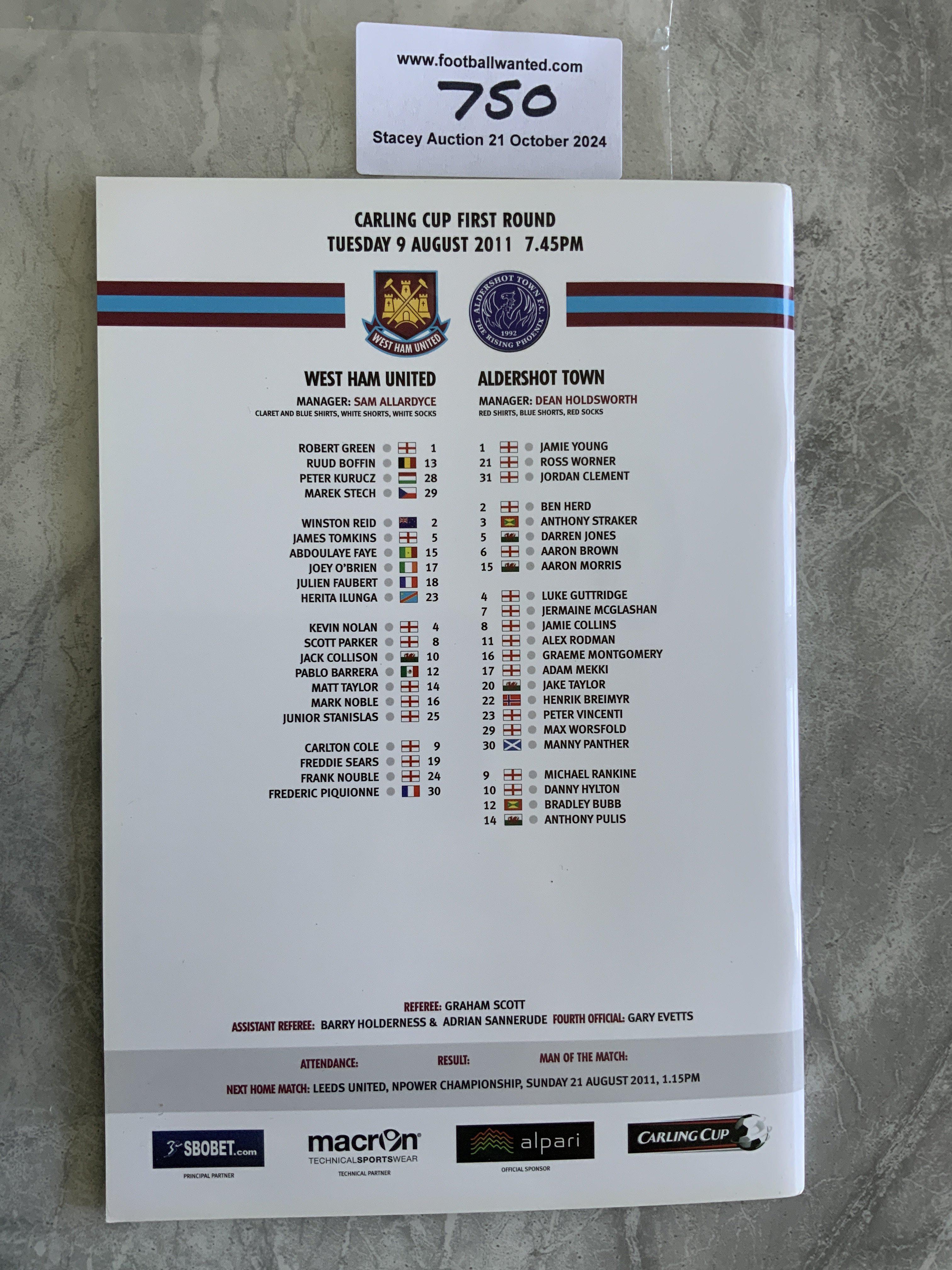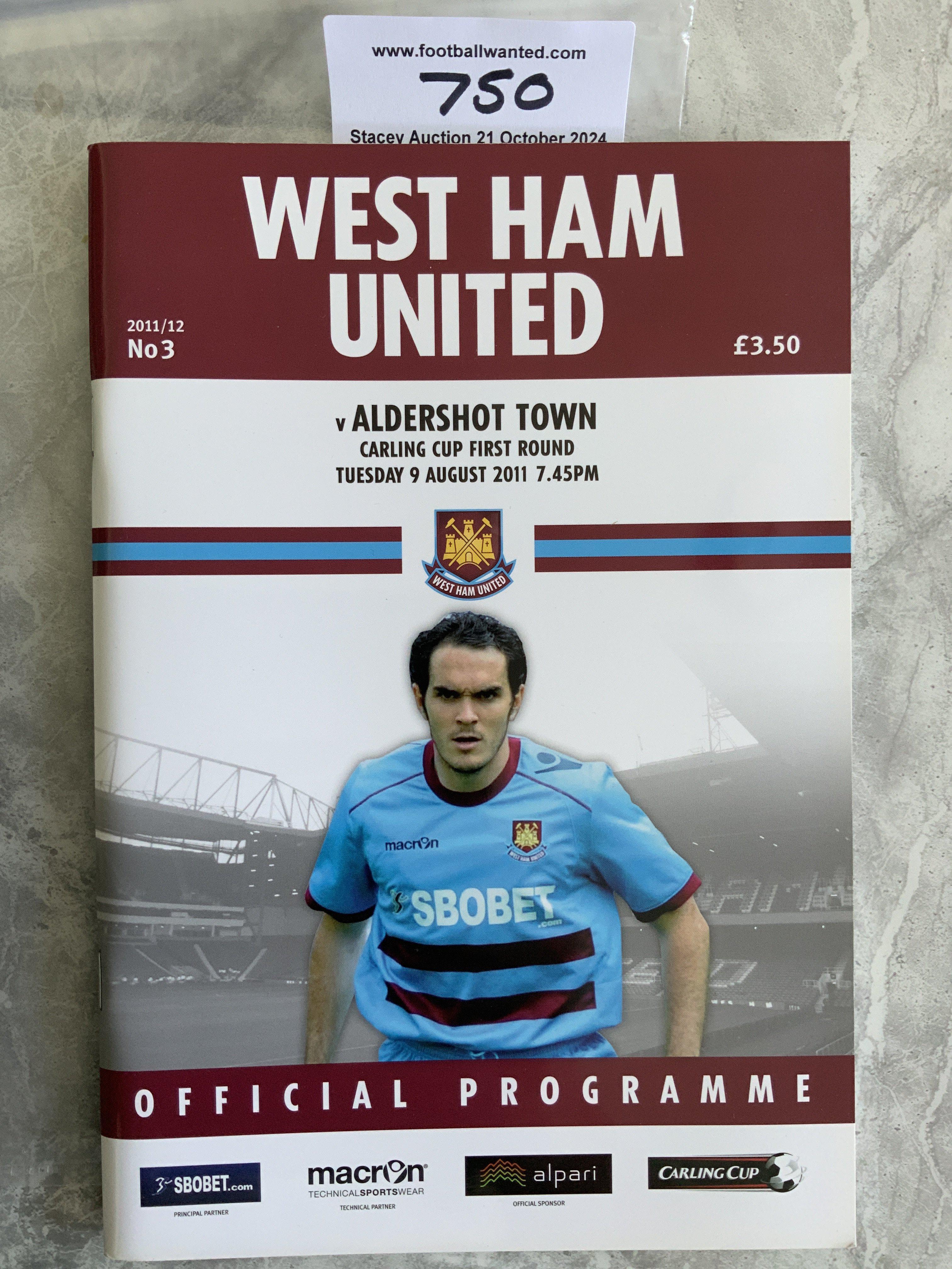 2011 - 2012 West Ham v Aldershot Postponed Football Programme: Mint condition dated 9 8 2011 for the Carling Cup match that was postponed due to the London Riots.