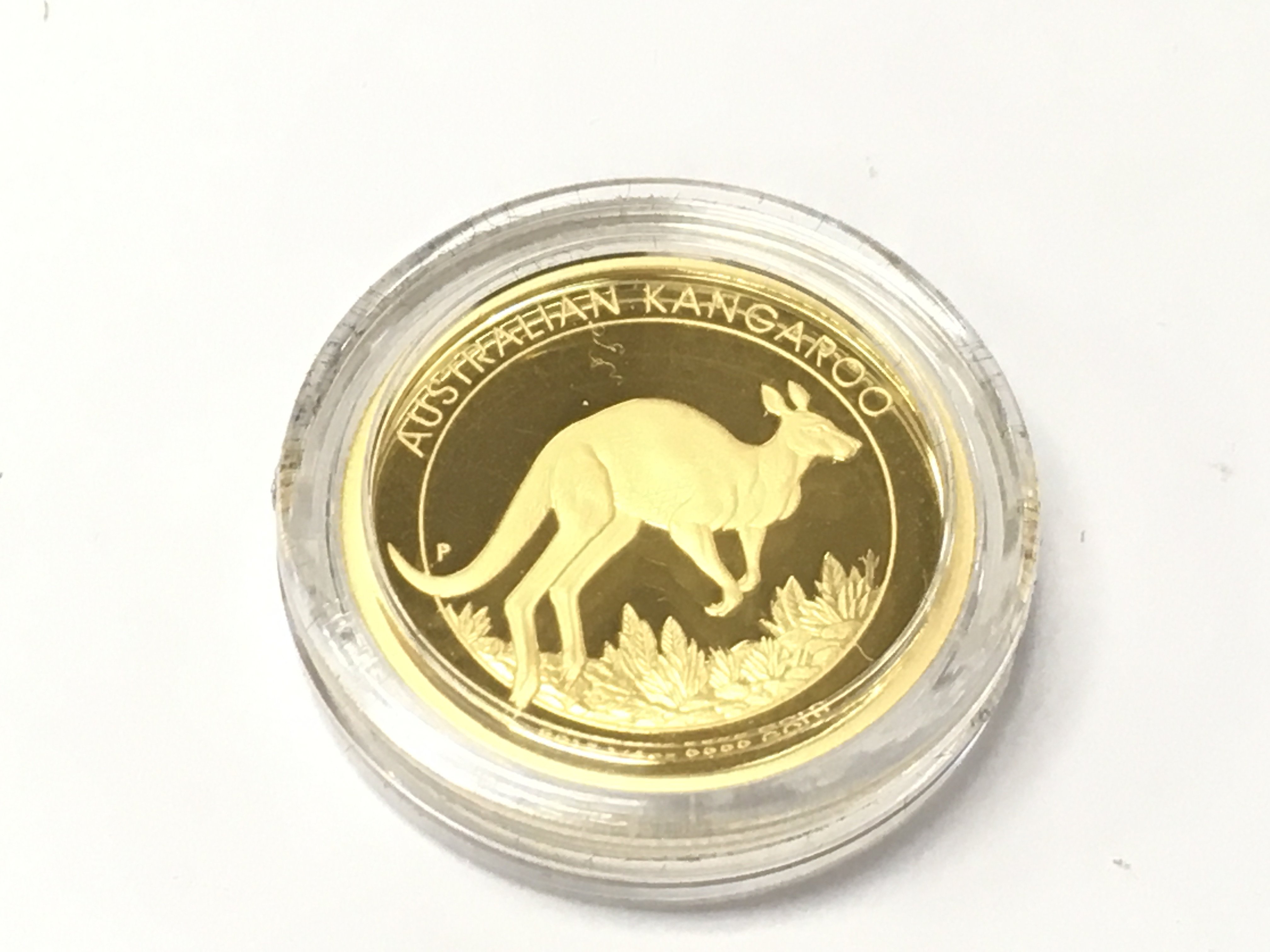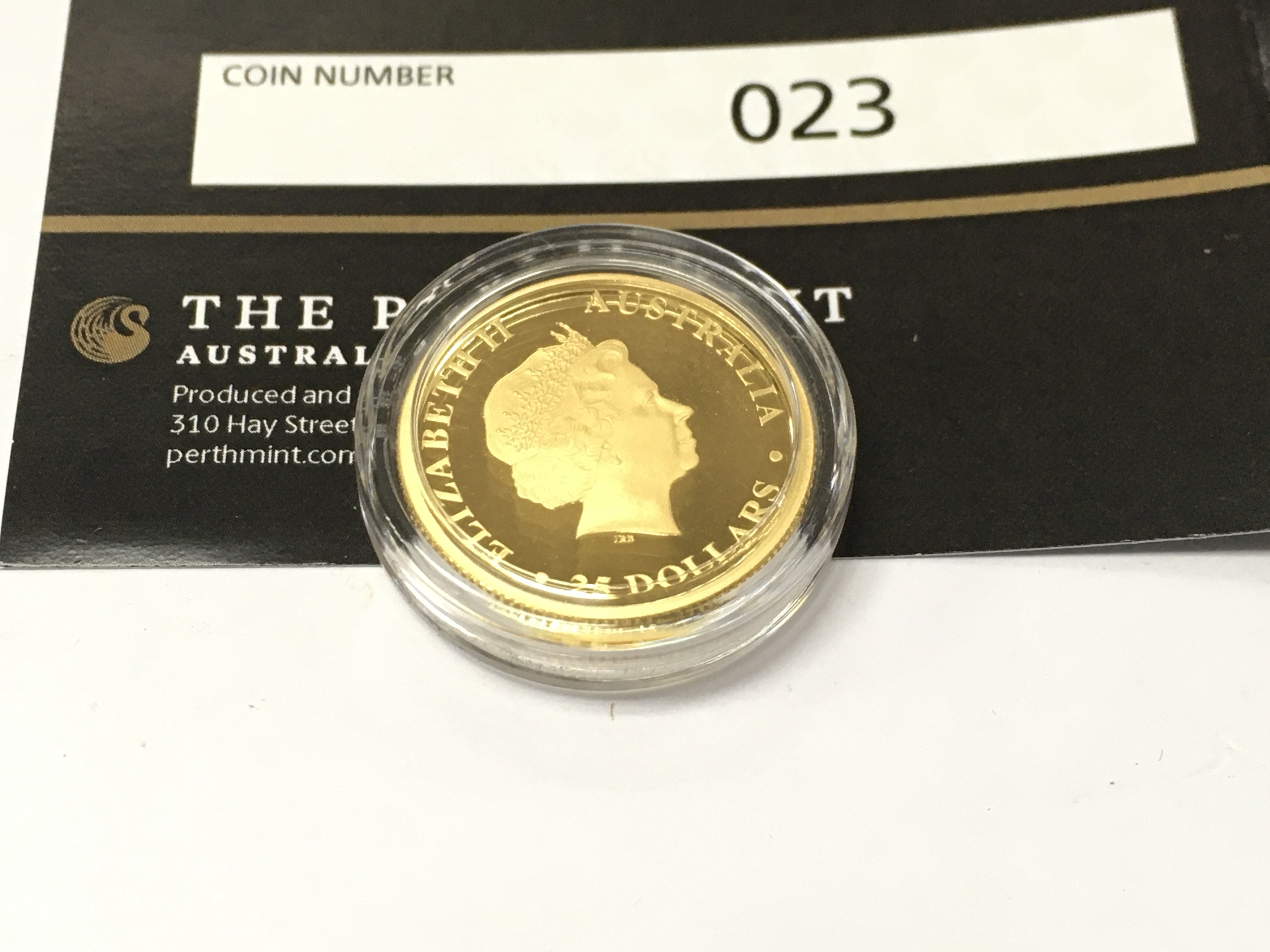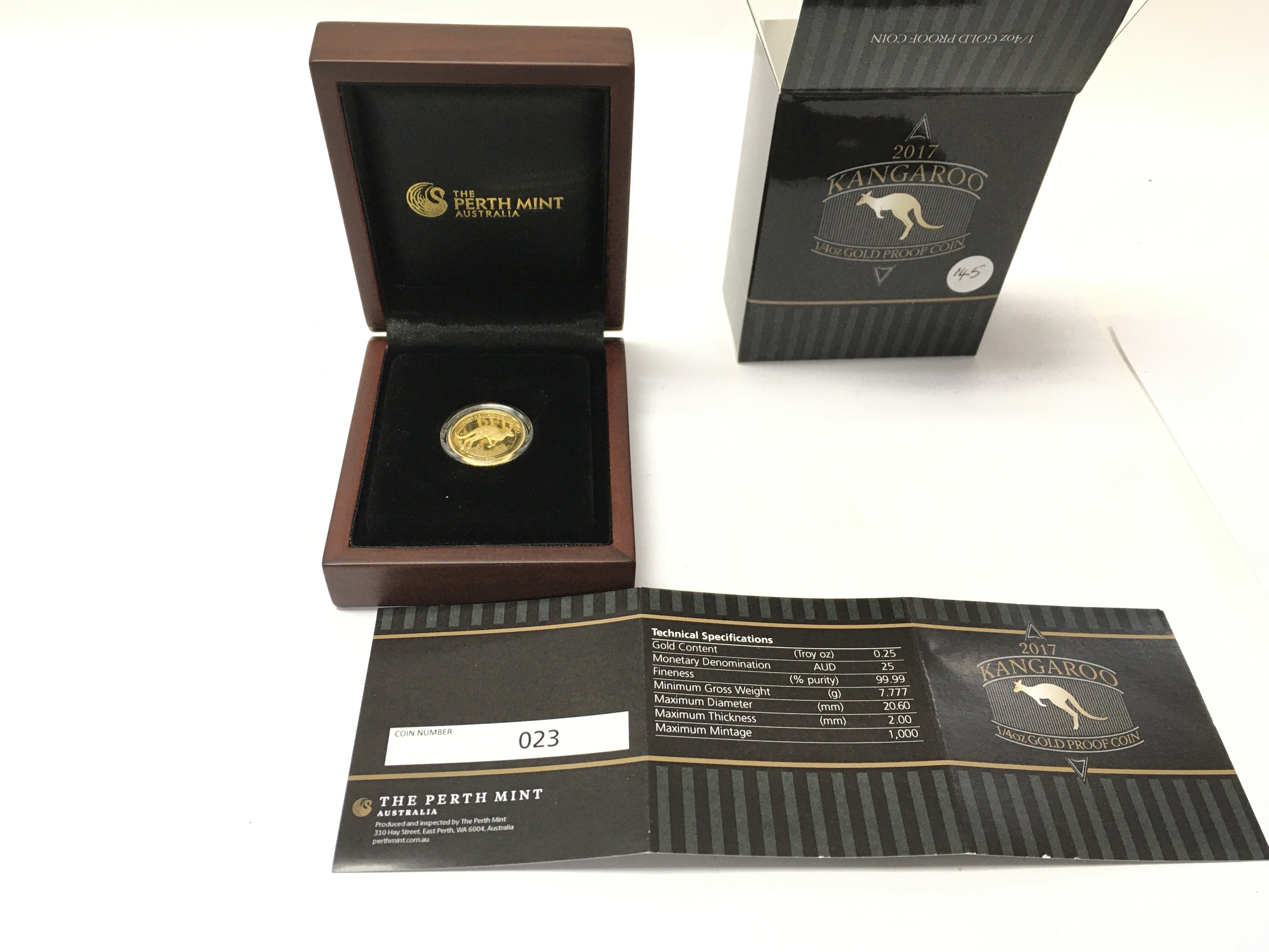 A 2017 1/4oz gold proof Kangaroo coin from Perth Mint with COA. Low coin number 23. Postage B