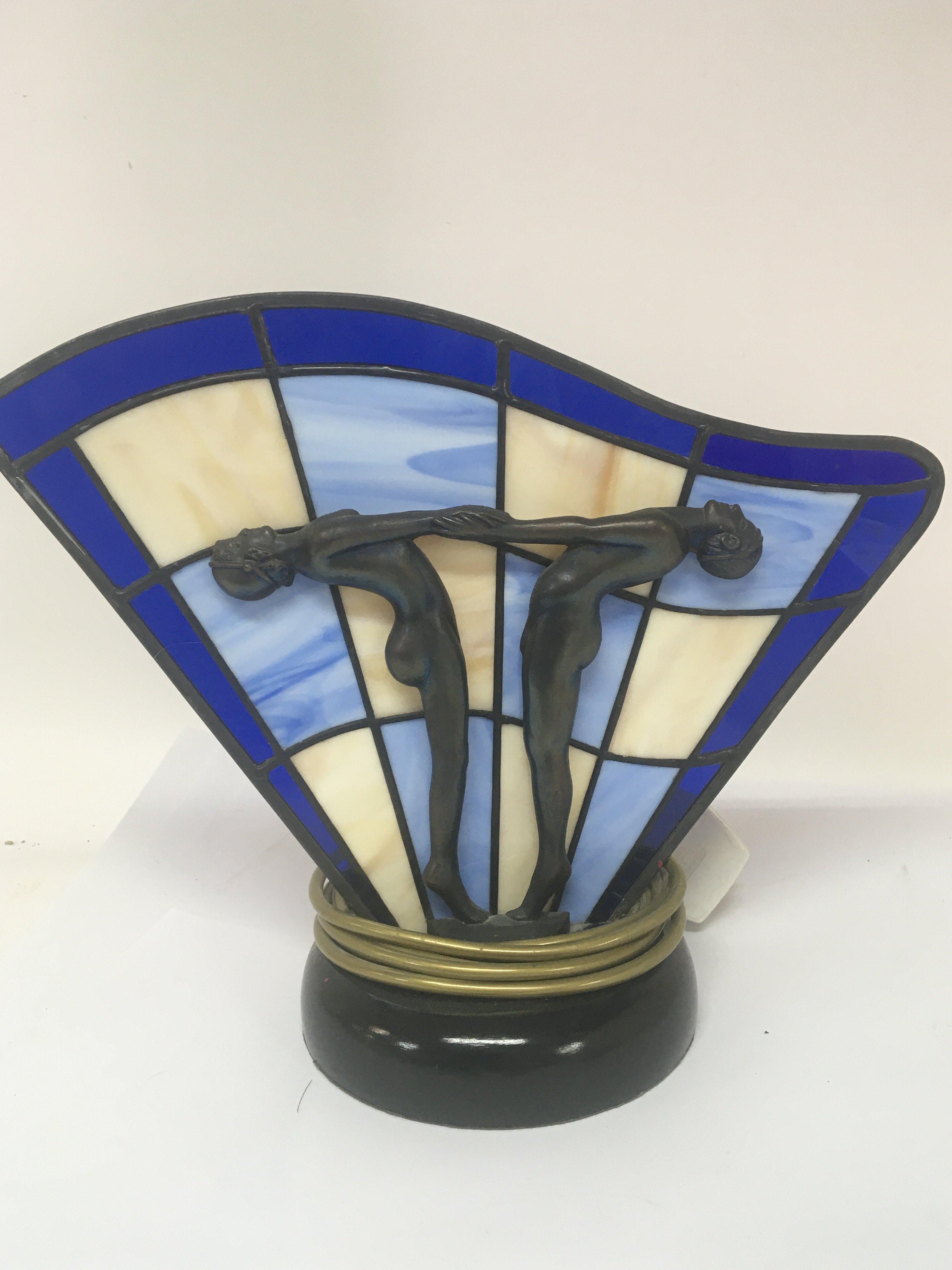 An Art Deco design table lamp stained glass with Art Deco lady figures. Fitted for electric. Very good condition height 27cm