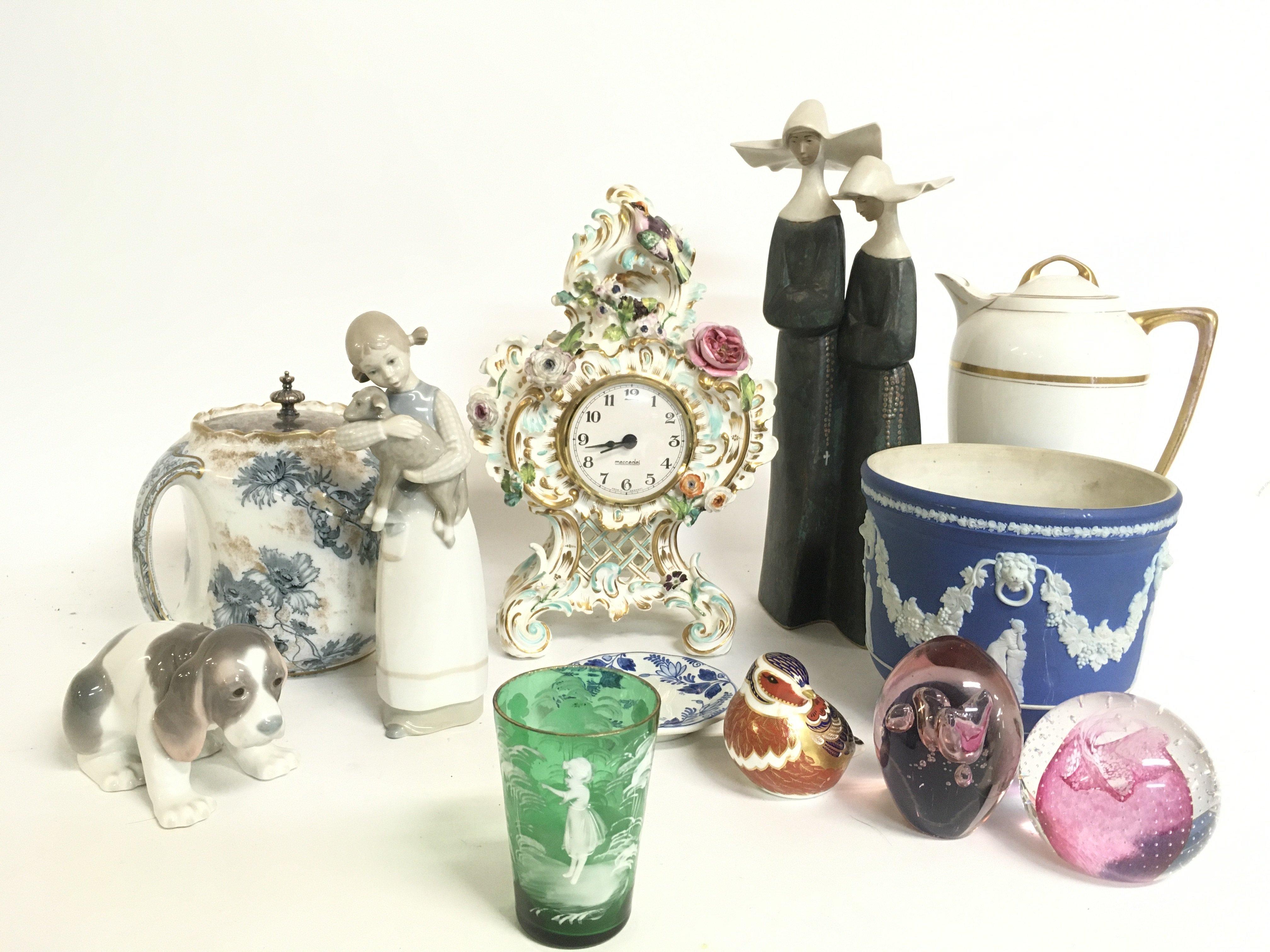 A collection of ceramics including a Doulton Burslem Arundel jar, Mercedes German porcelain clock, Lladro figures, a Wedgewood cobalt vase (damaged), paperweights, a Victorian Mary Gregory green glass etc. this lot cannot be posted