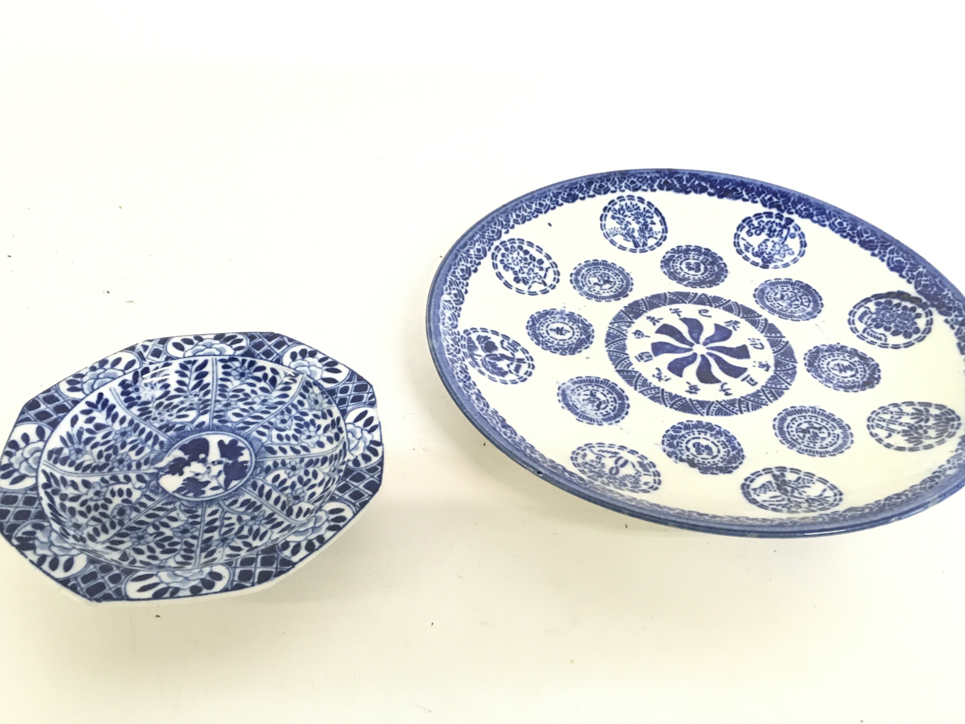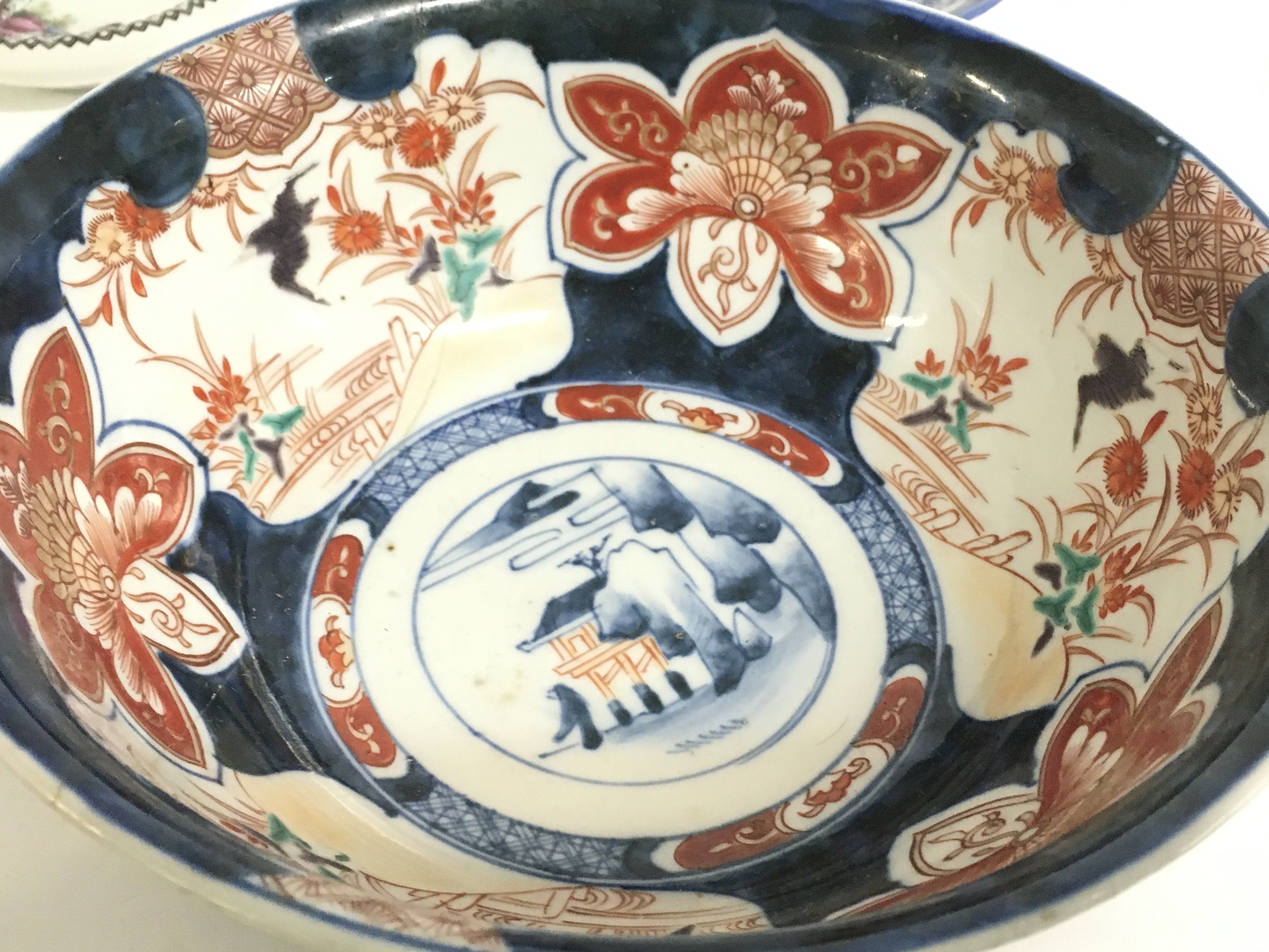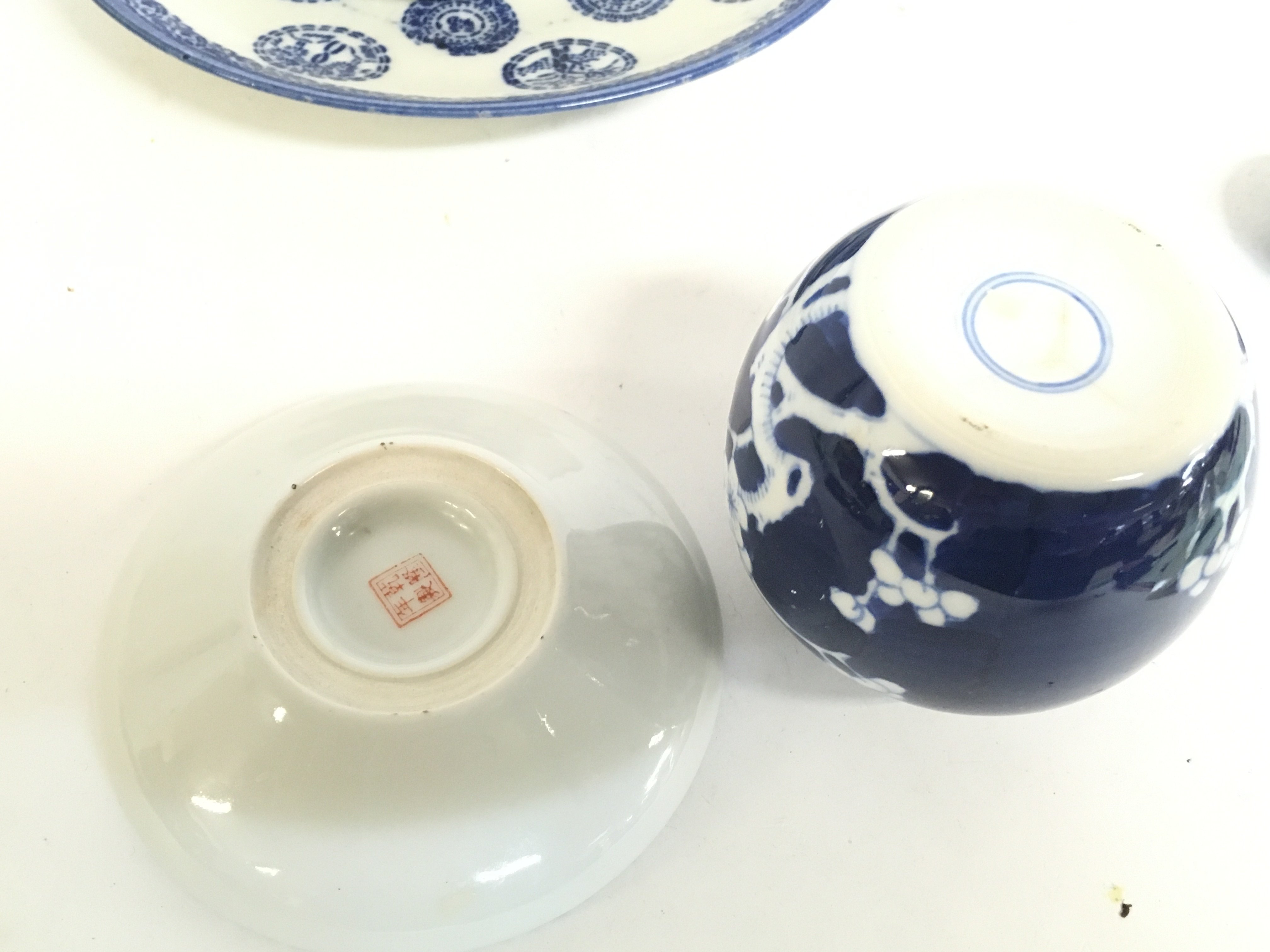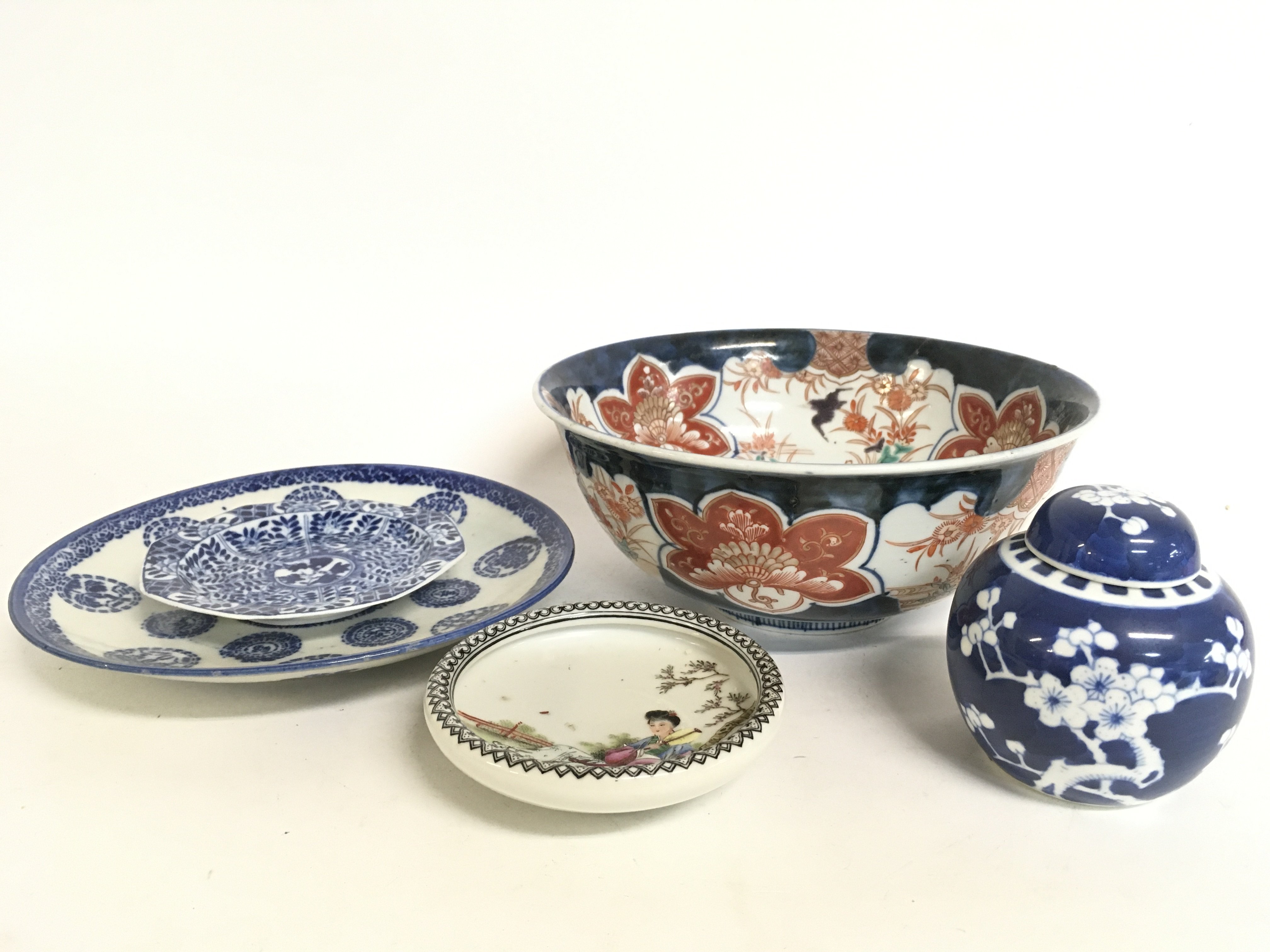 A Japanese Imari bowl, Chinese Famille Rose dish, Chinese Blue and white ginger jar, Chinese blue and white dishes. This lot cannot be posted