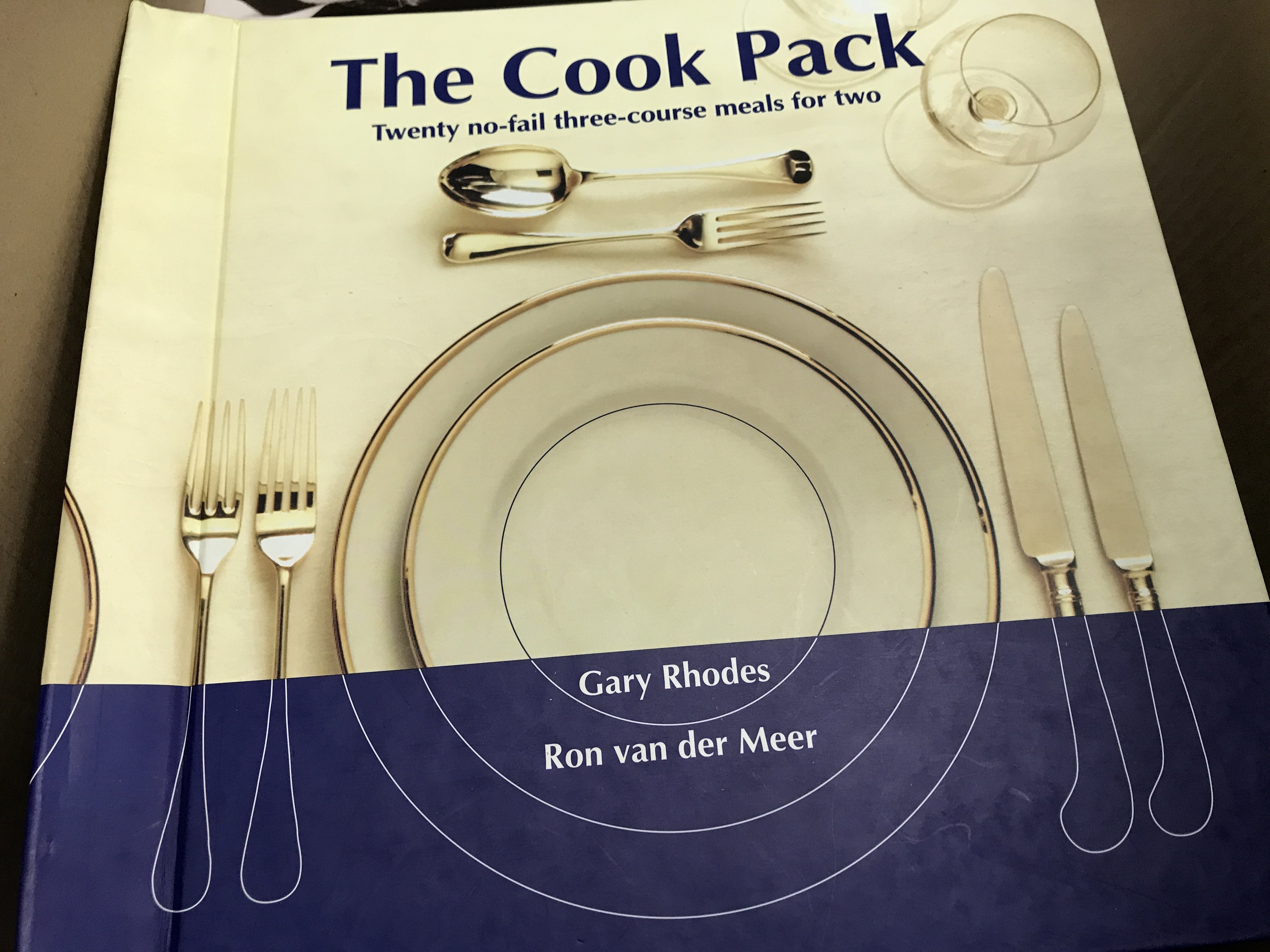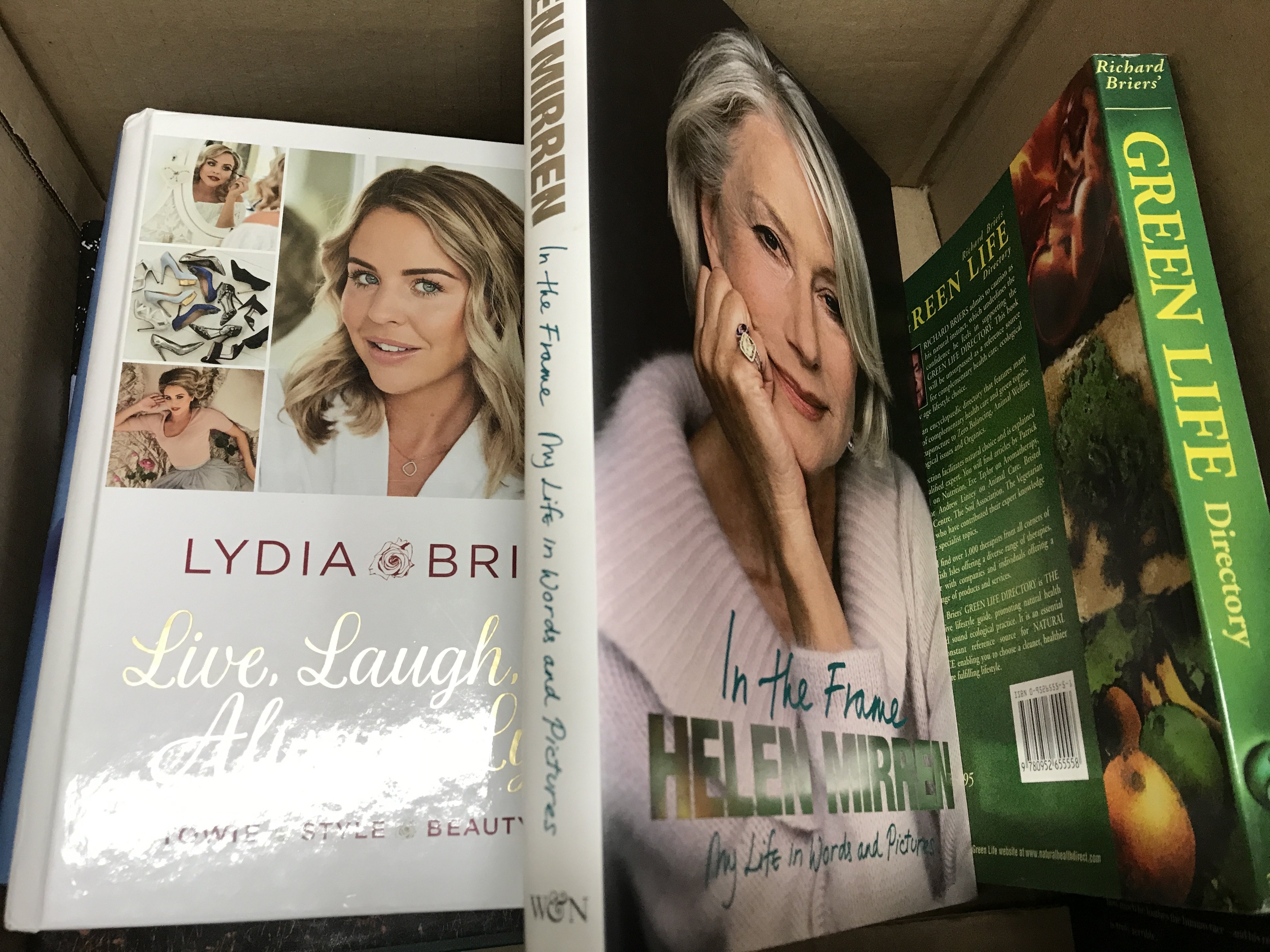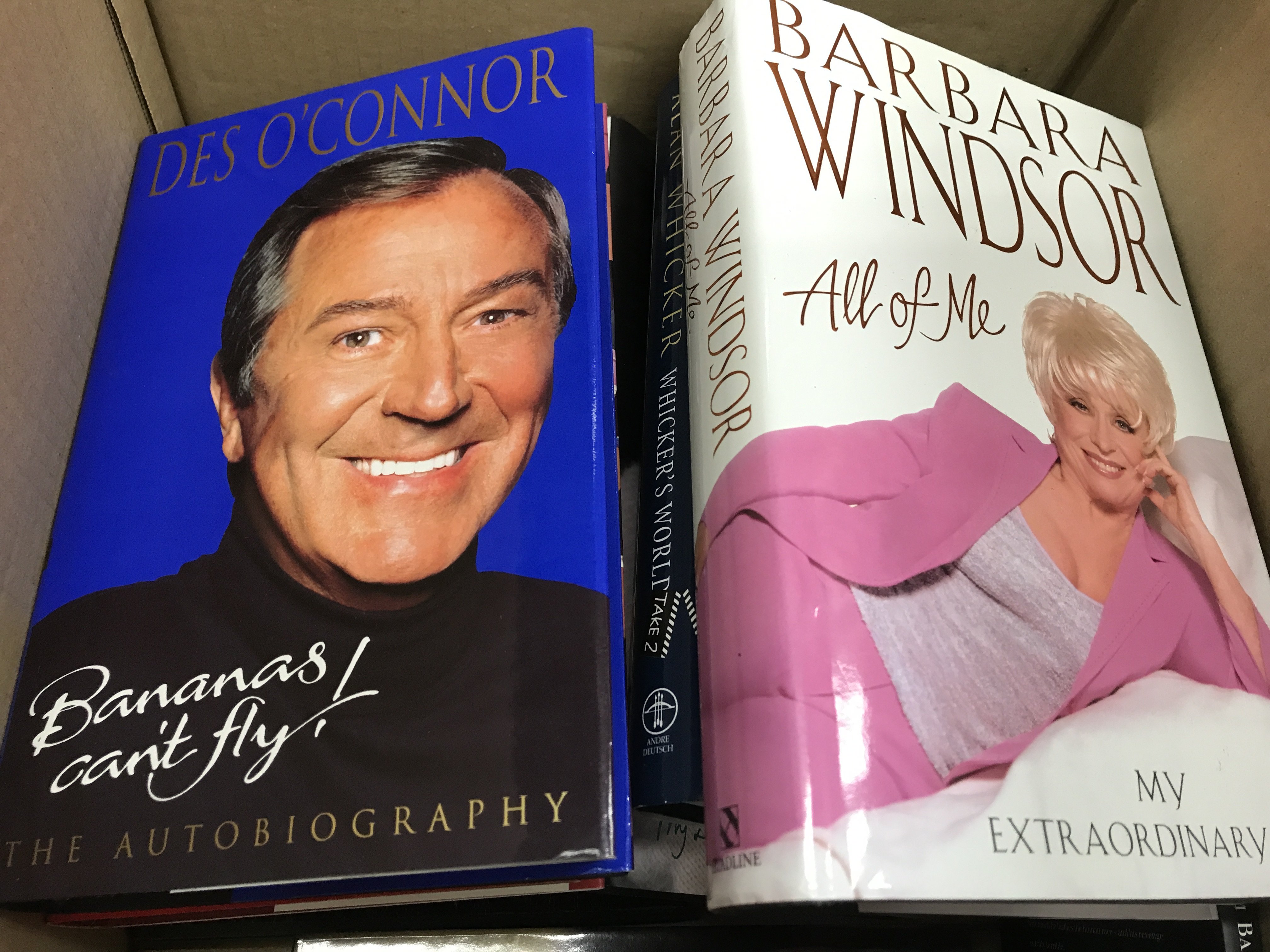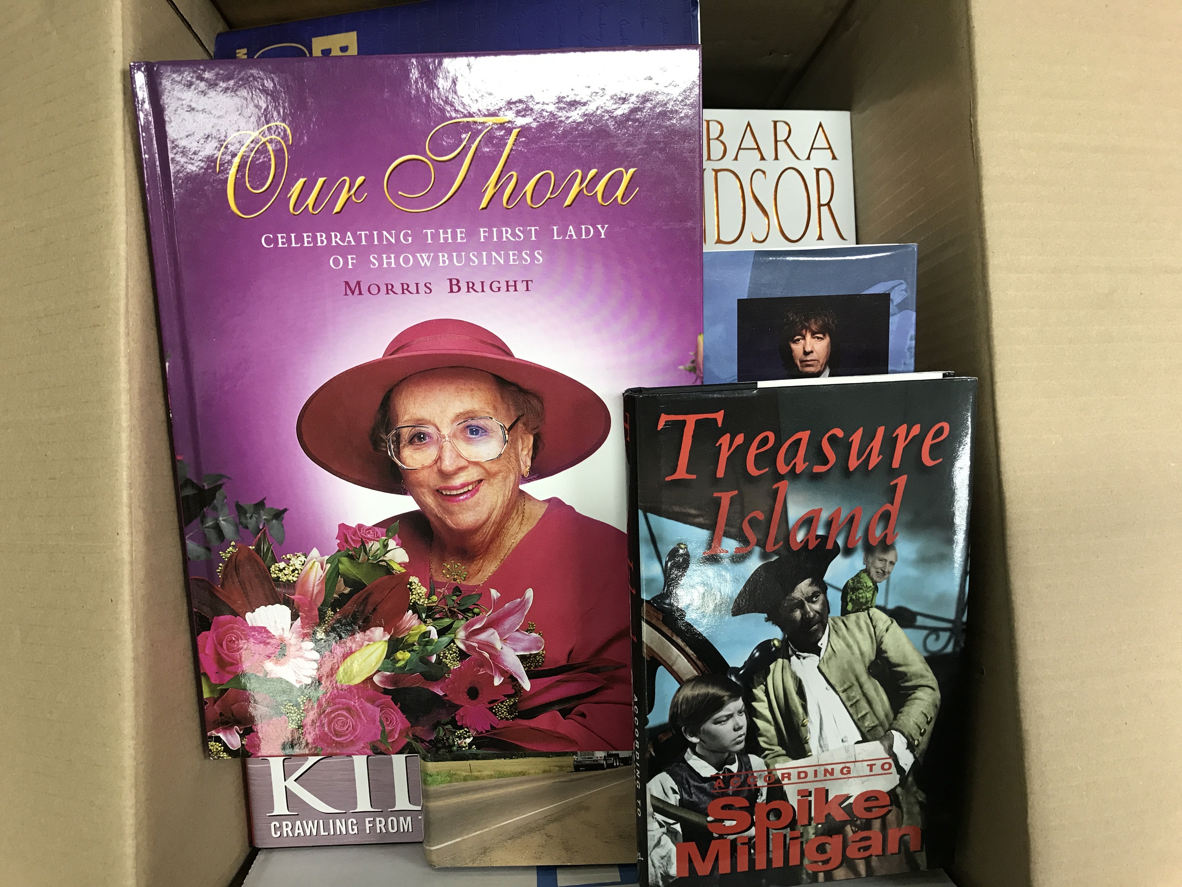 A box containing various books including Treasure Island according to Spike Milligan, The Cook Pack by Gary Rhodes, Des O'Connor autobiography, Barbara Windsor autobiography, Joan Collins and Helen Mirren etc
