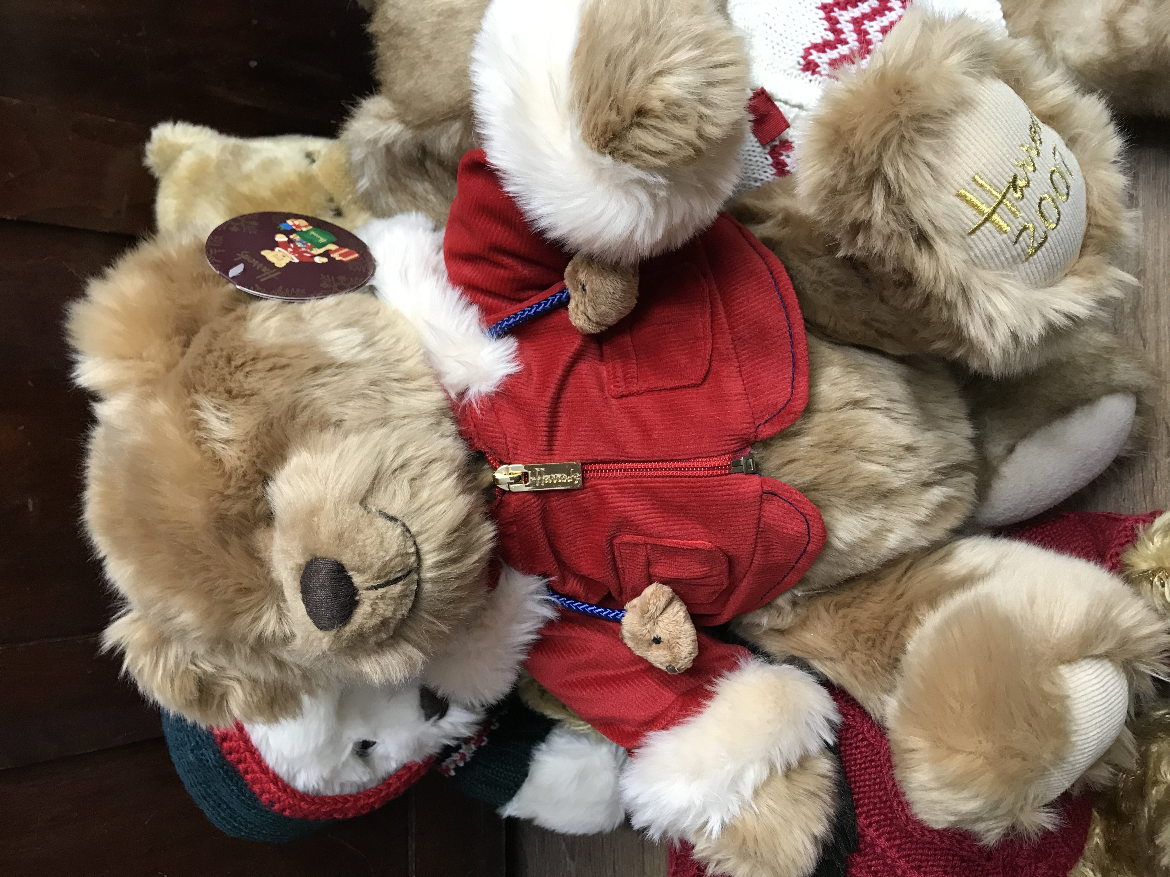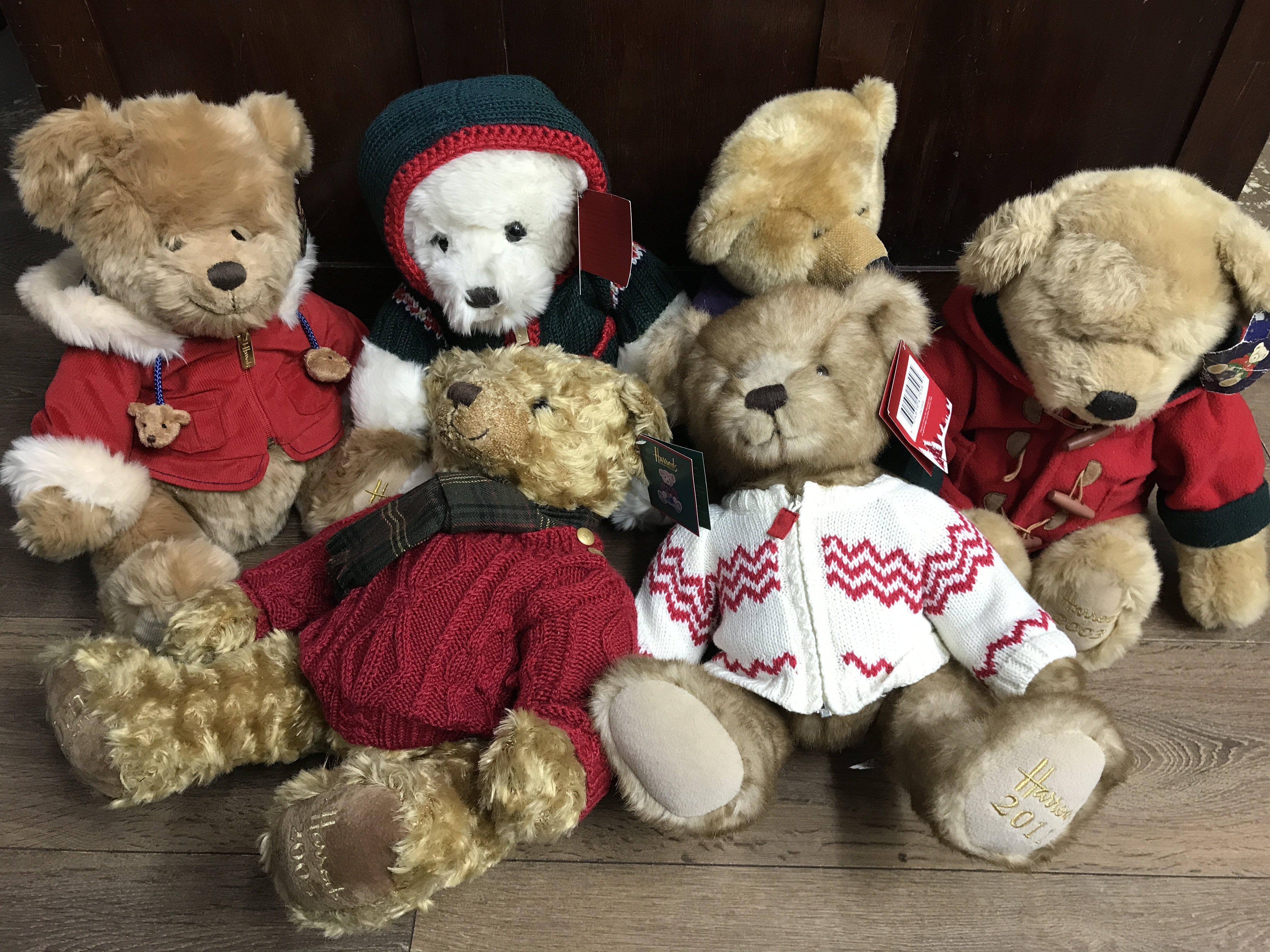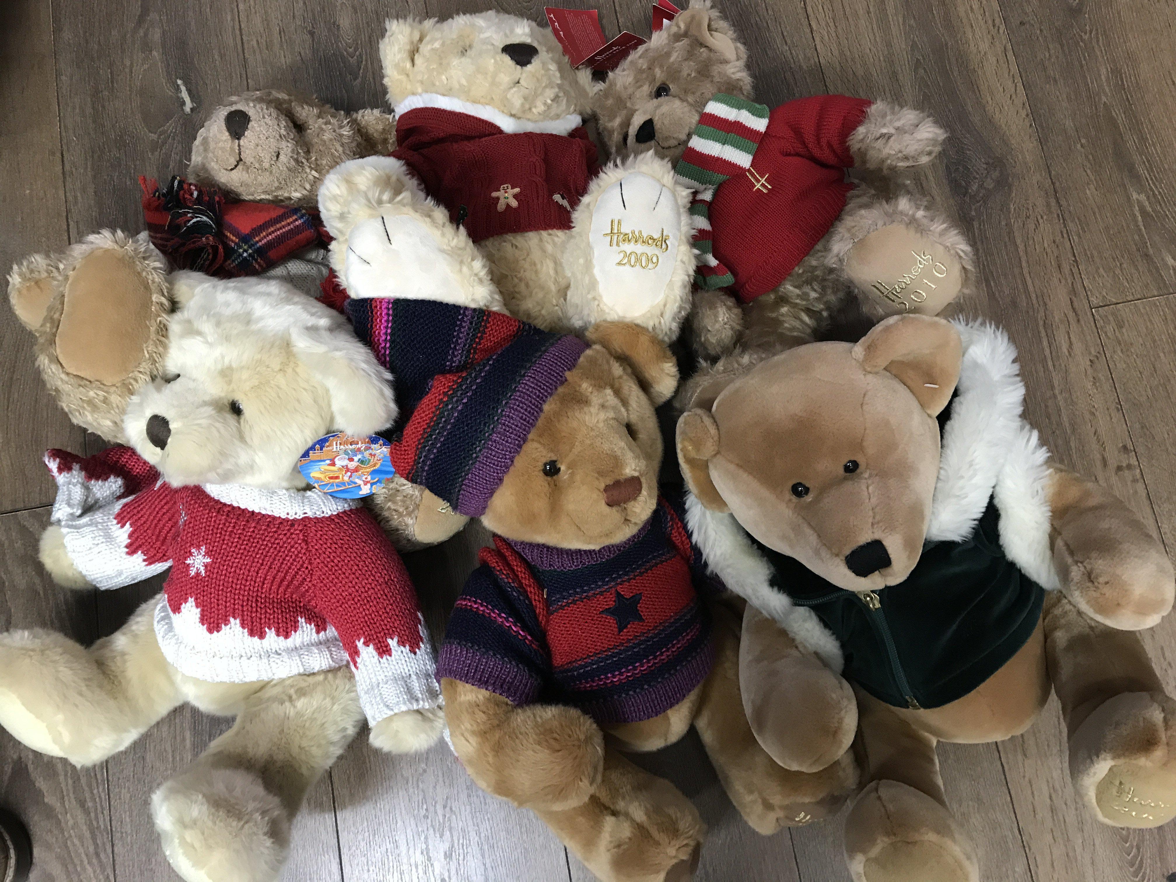 A collection of Harrods Christmas bears, in various Christmas clothing, with ear labels