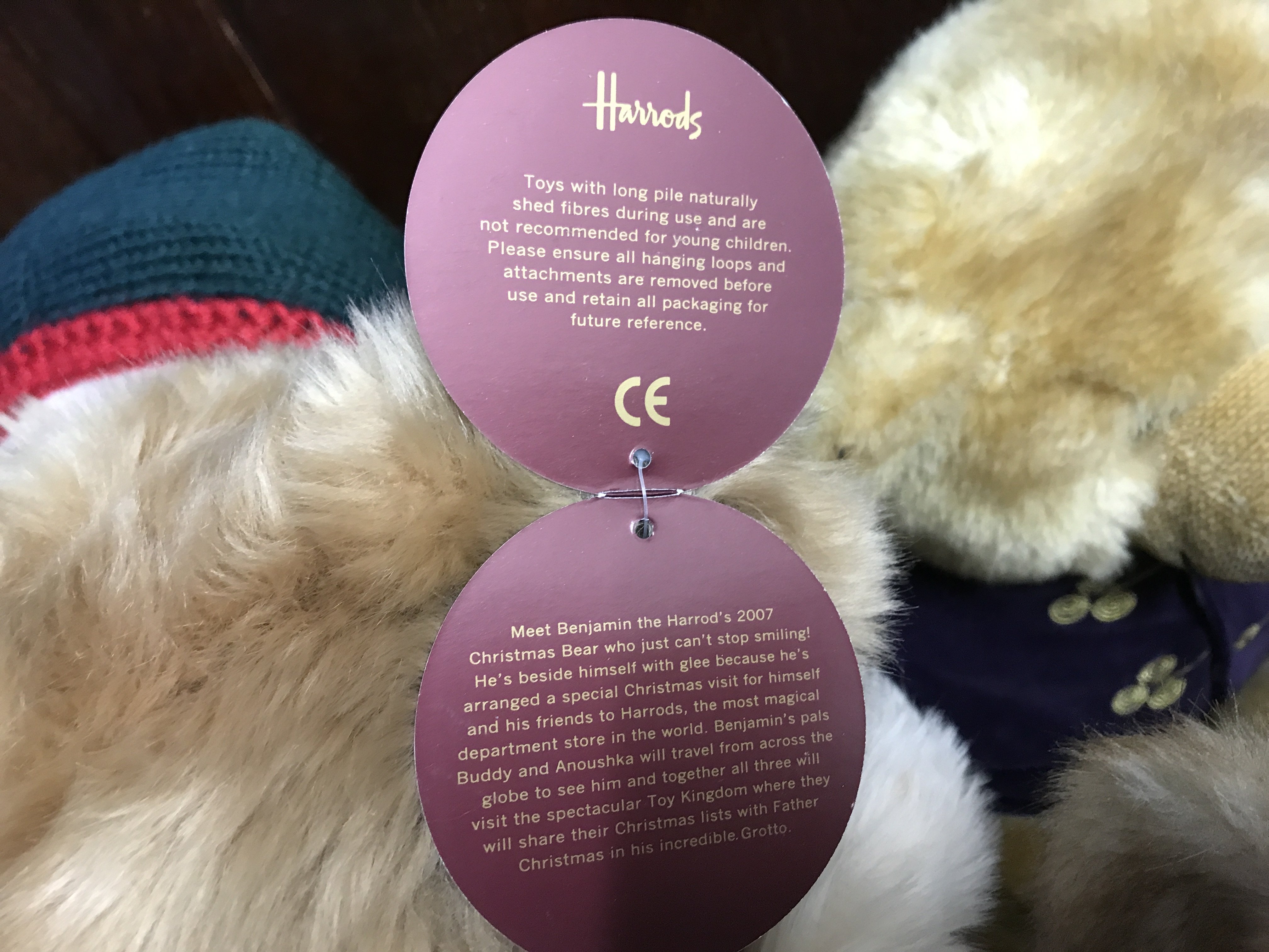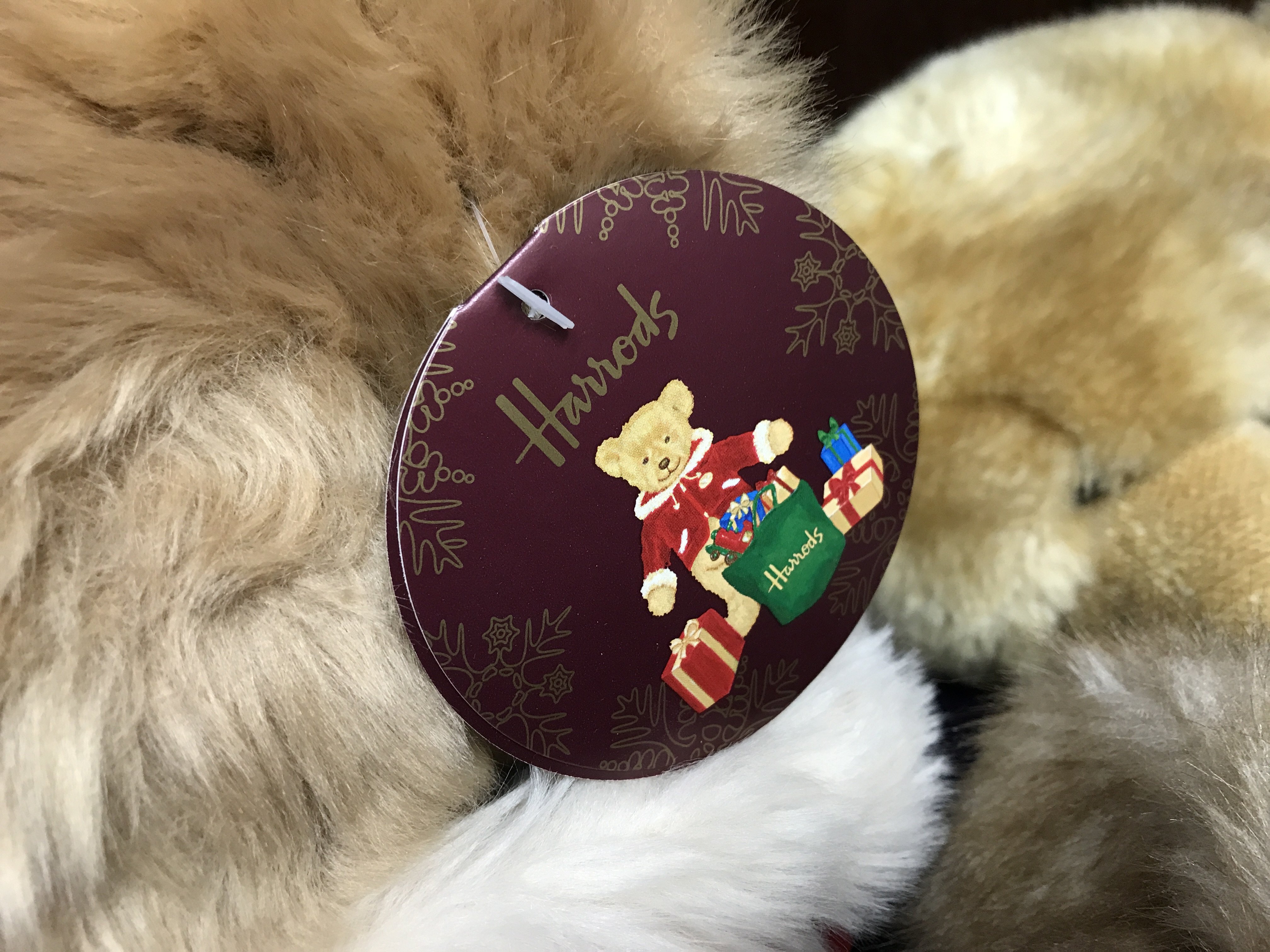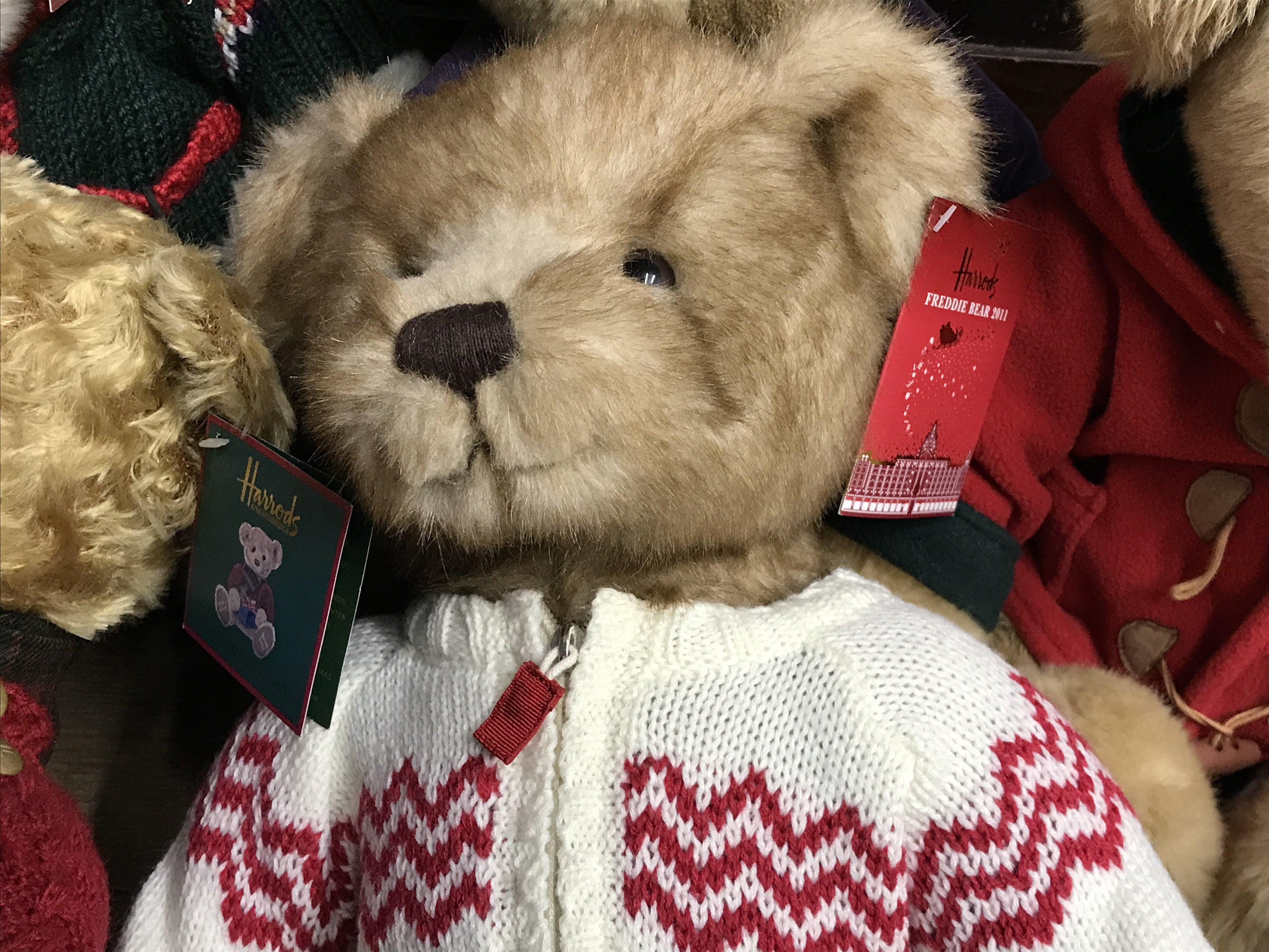 A collection of Harrods Christmas bears, in various Christmas clothing, with ear labels