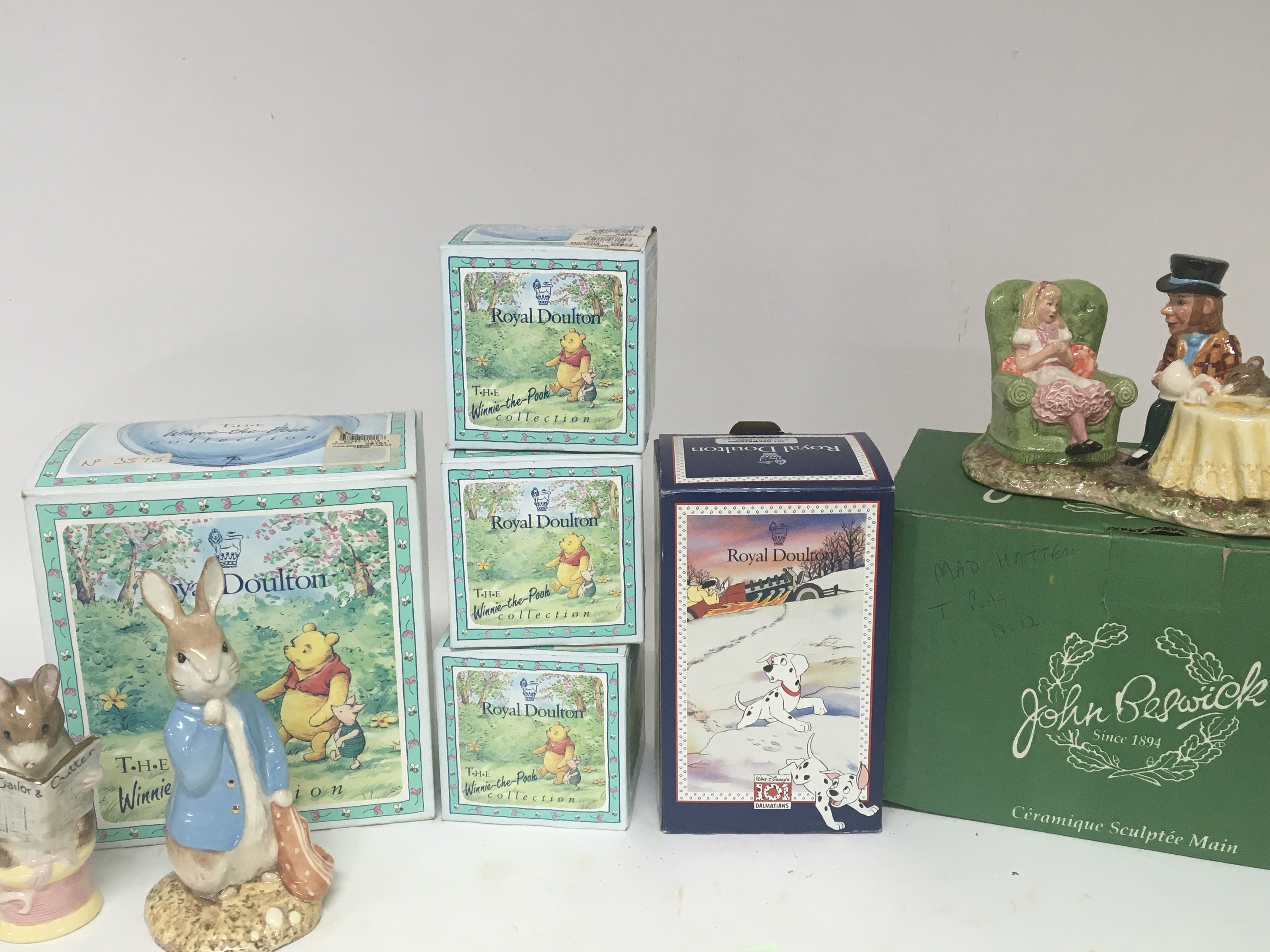 A Beswick Mad Hatter porcelain figure group Royal Doulton 101 Dalmatian and Royal Doulton Winnie the Pooh collection and two Beswick Doulton Peter Rabbit large size figures in one box.