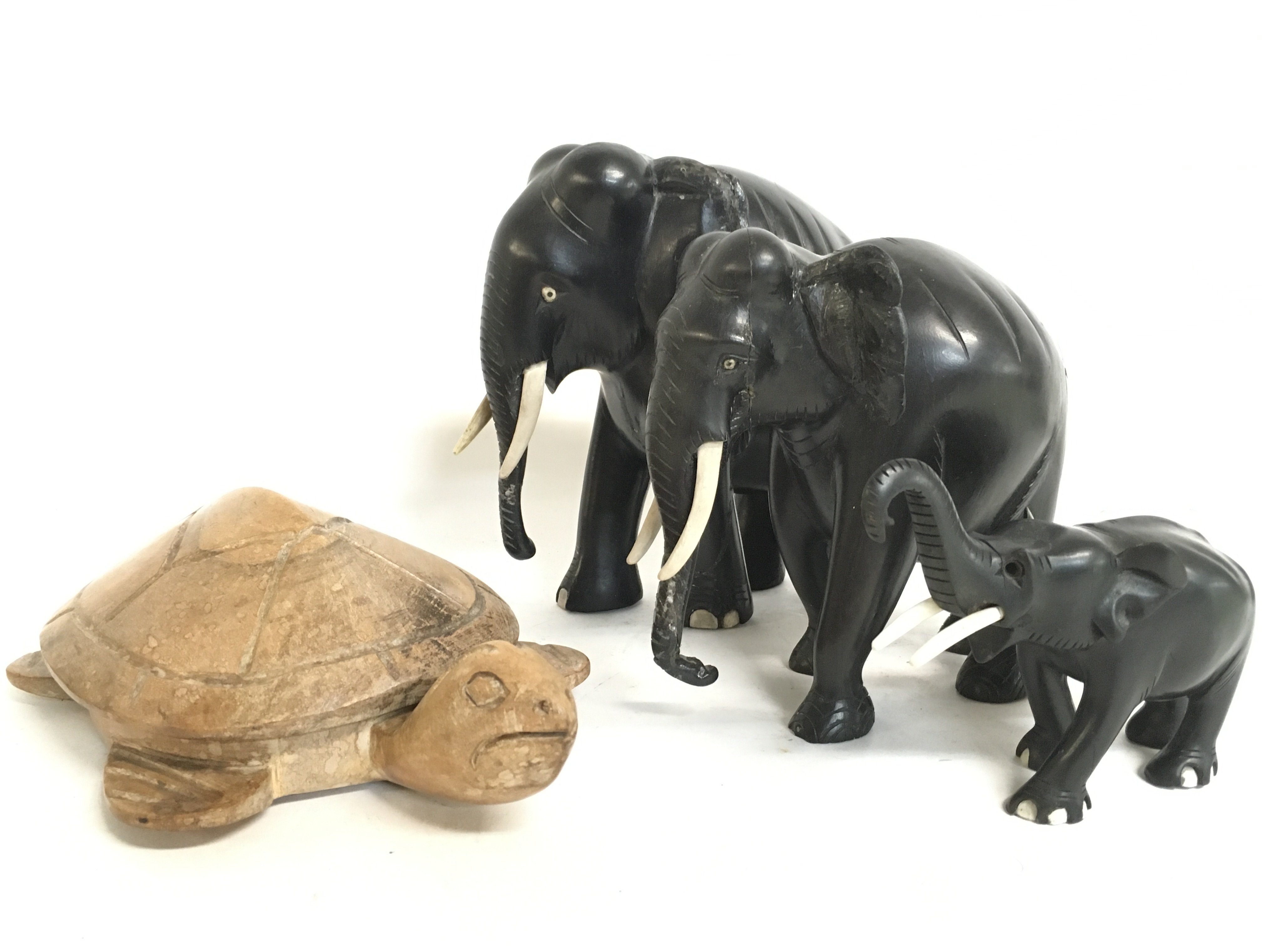 A collection of ebony elephants and a wooden tortoise figure. Tallest figure 18cm tall. Postage category C