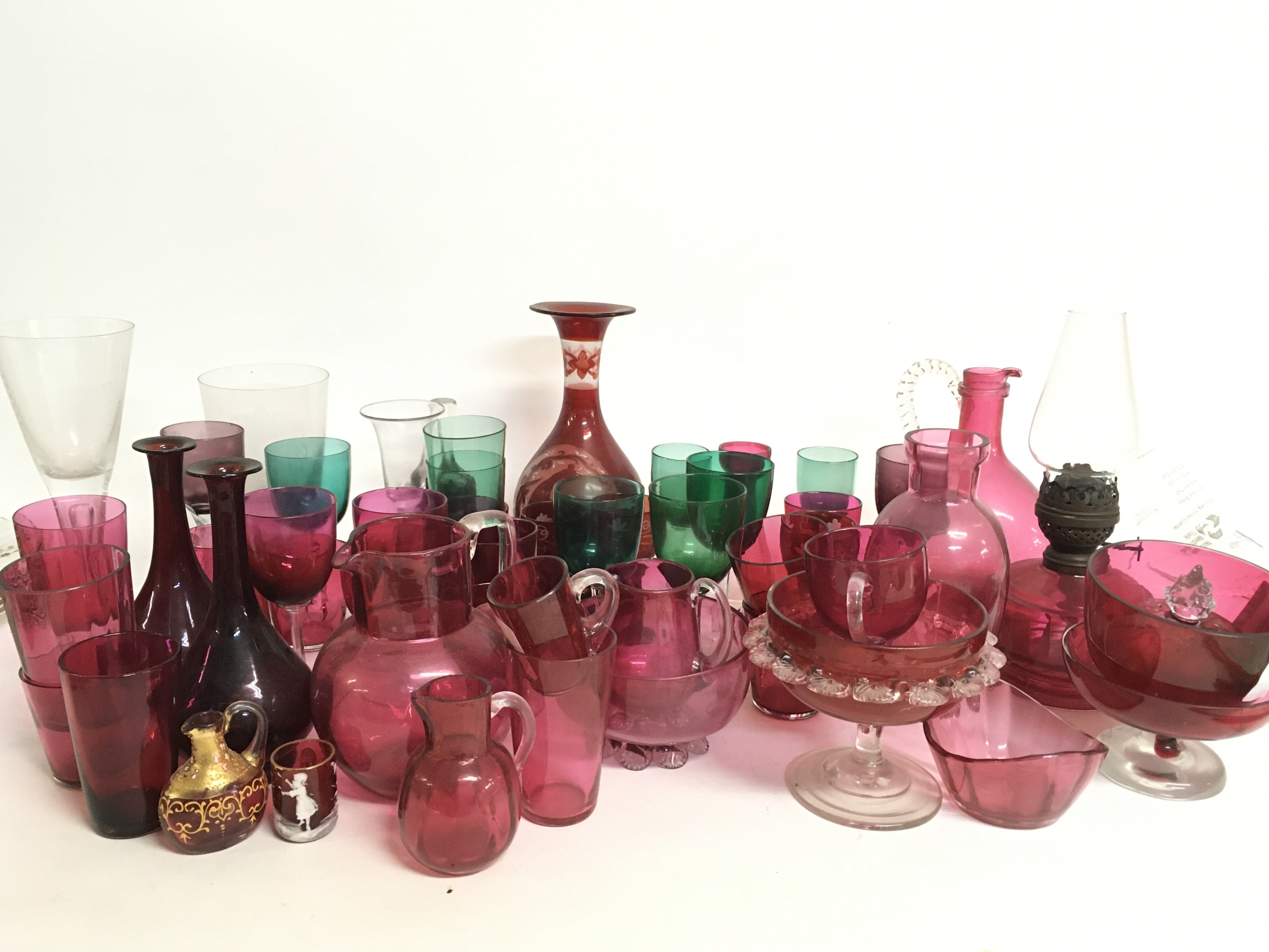 A collection of Victorian Cranberry and green glass including an oil lamp, vases etc. This lot cannot be posted