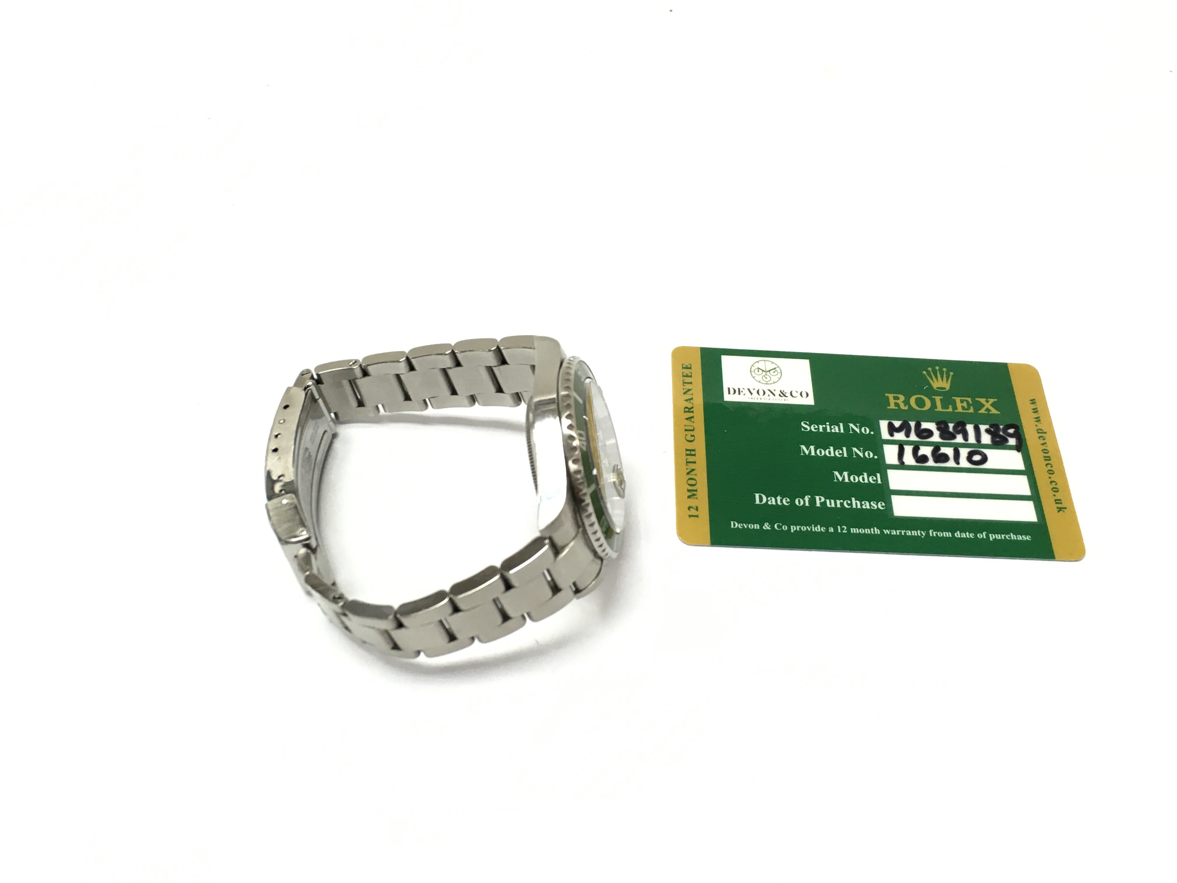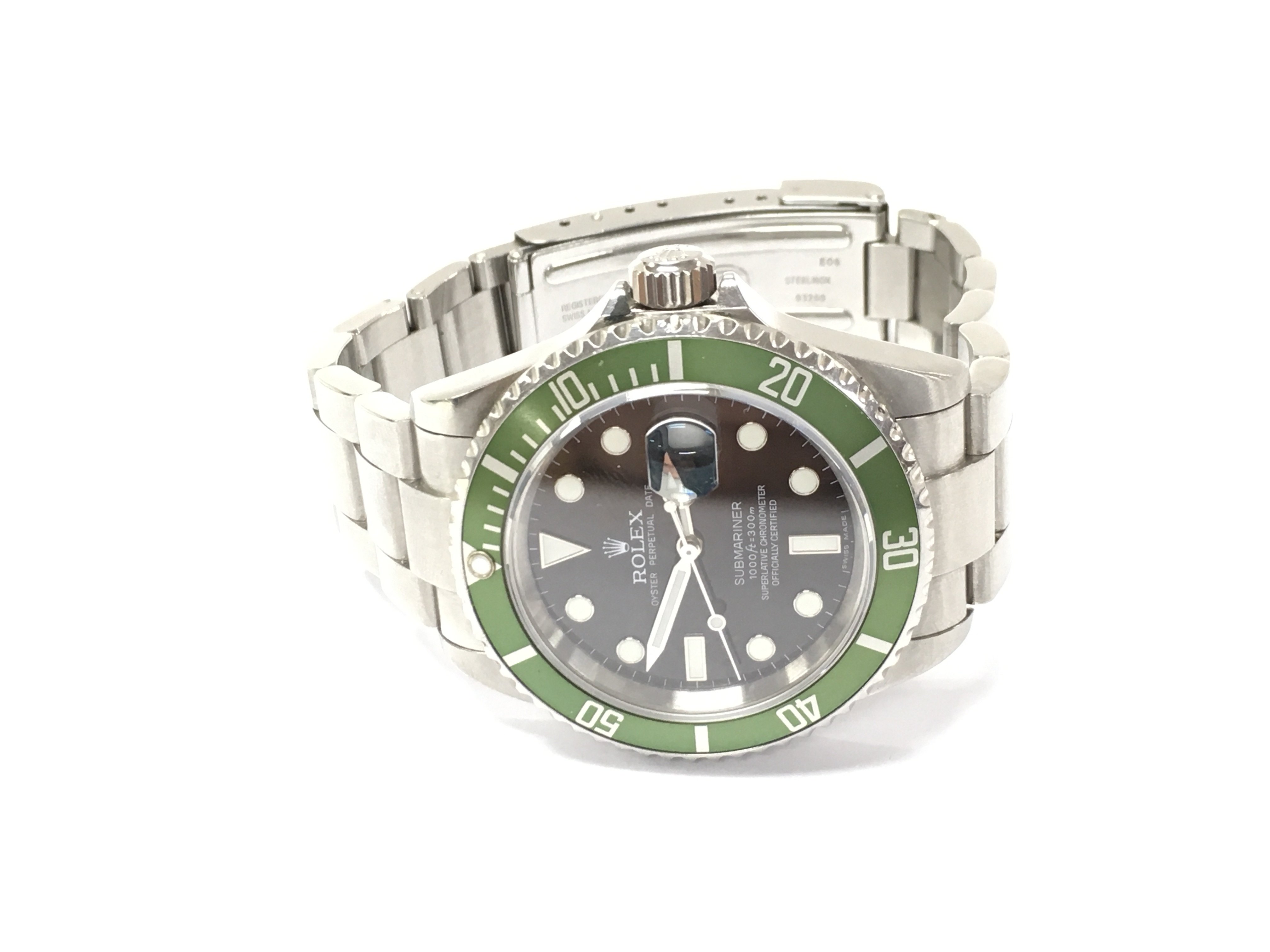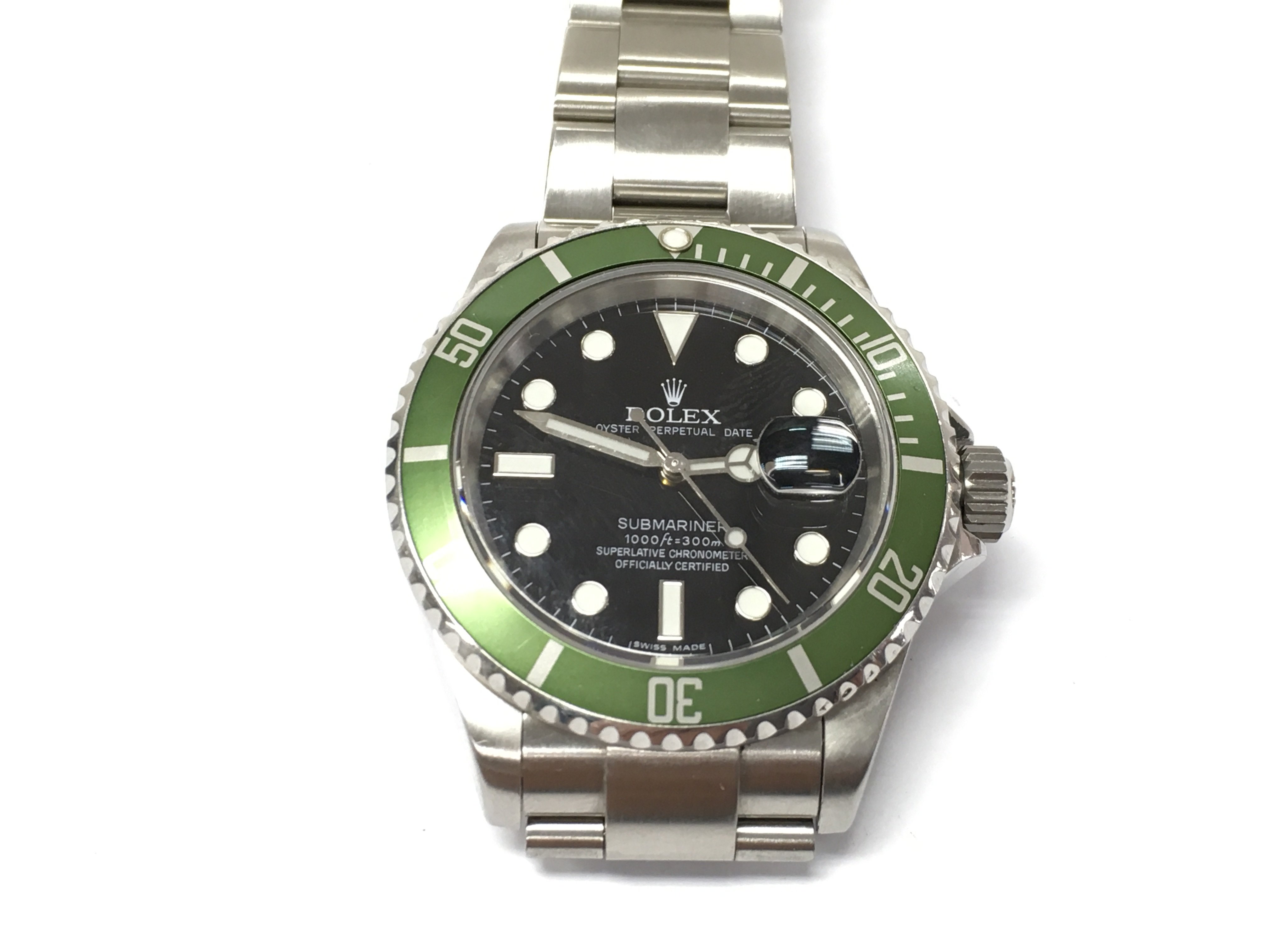 A rolex submariner date Kermit watch. 16610 Black dial with green bezel. 2007/2008 40mm case with stainless steel bracelet. Seen running. No box or papers.