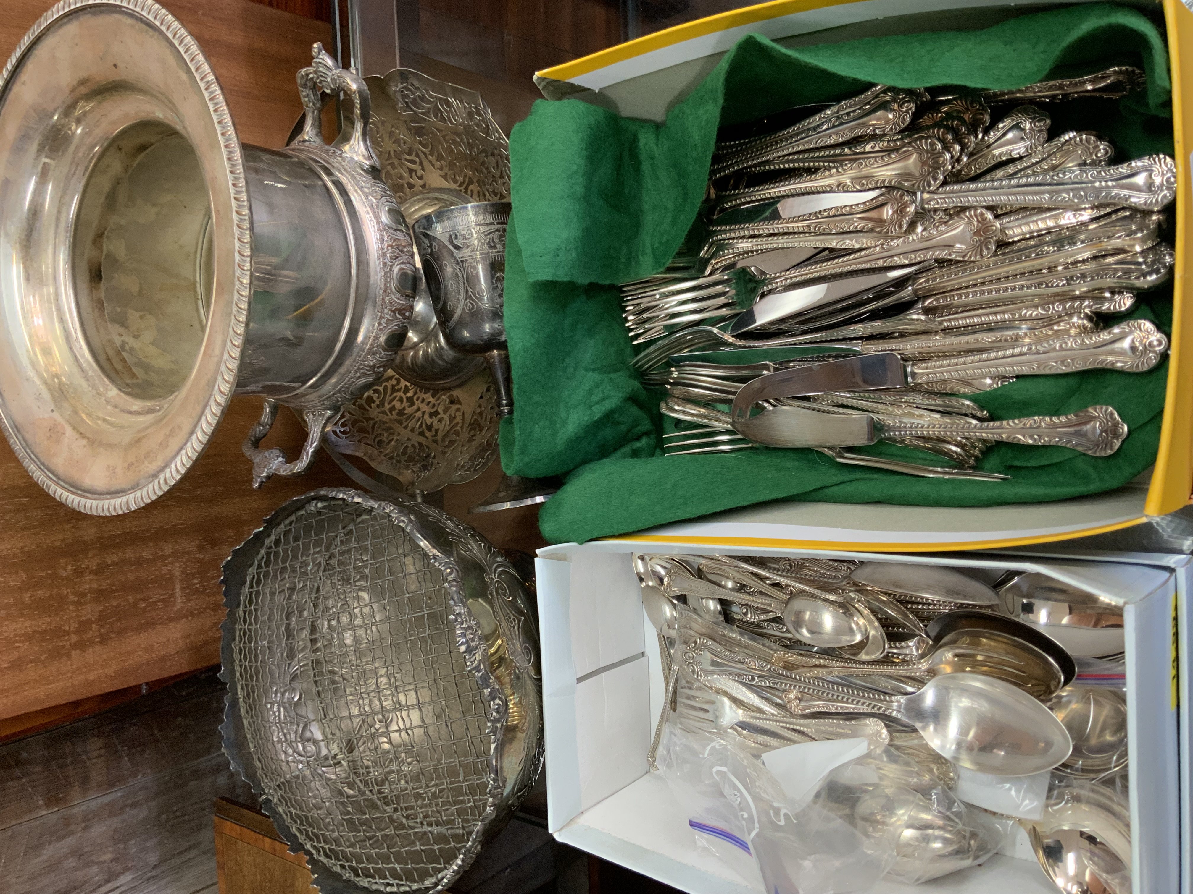A small collection of silver plated cutlery, Champagne bucket. (C)