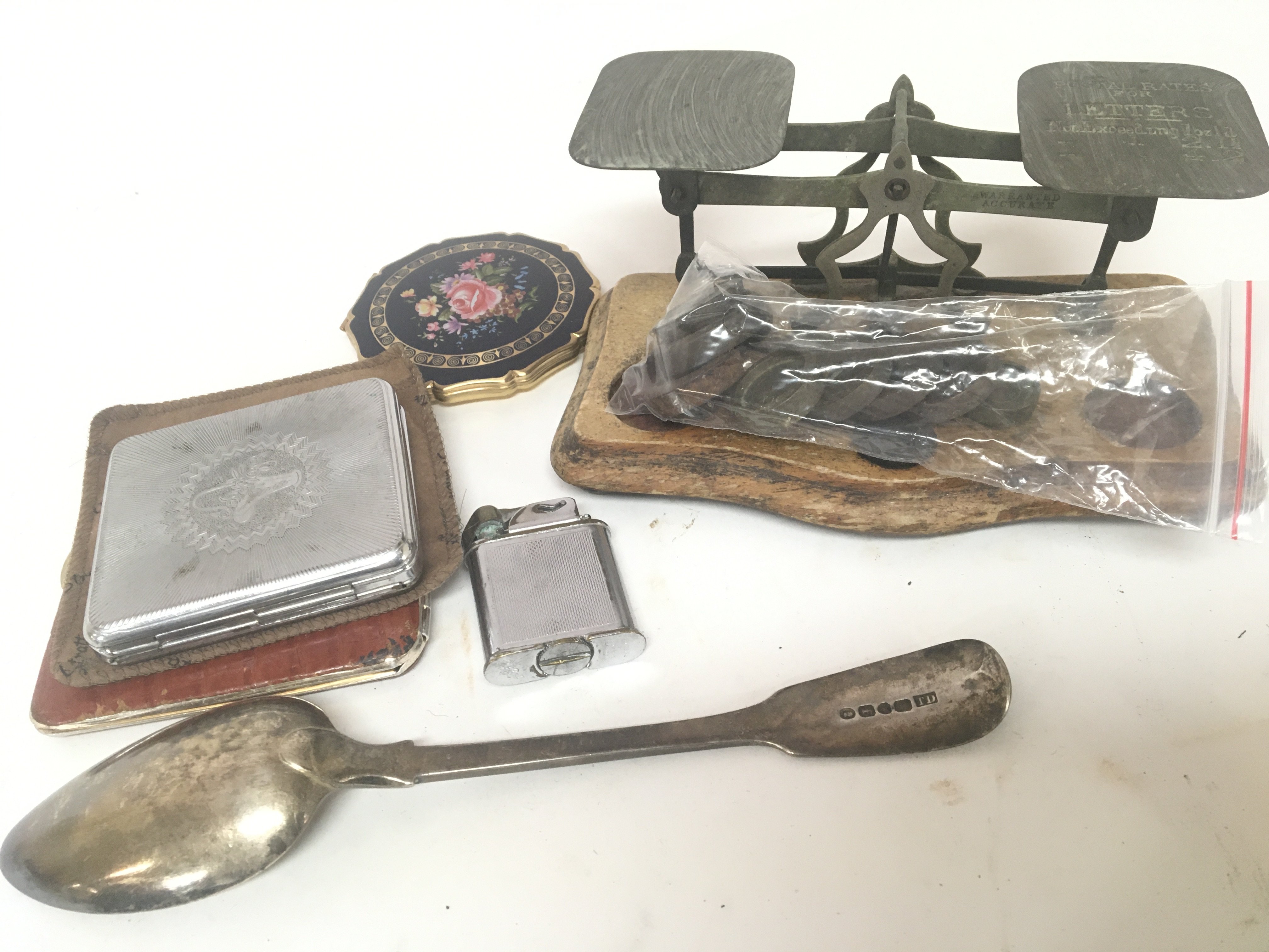 A silver spoon London 1821 hallmarks ladies compacts and postal scales.