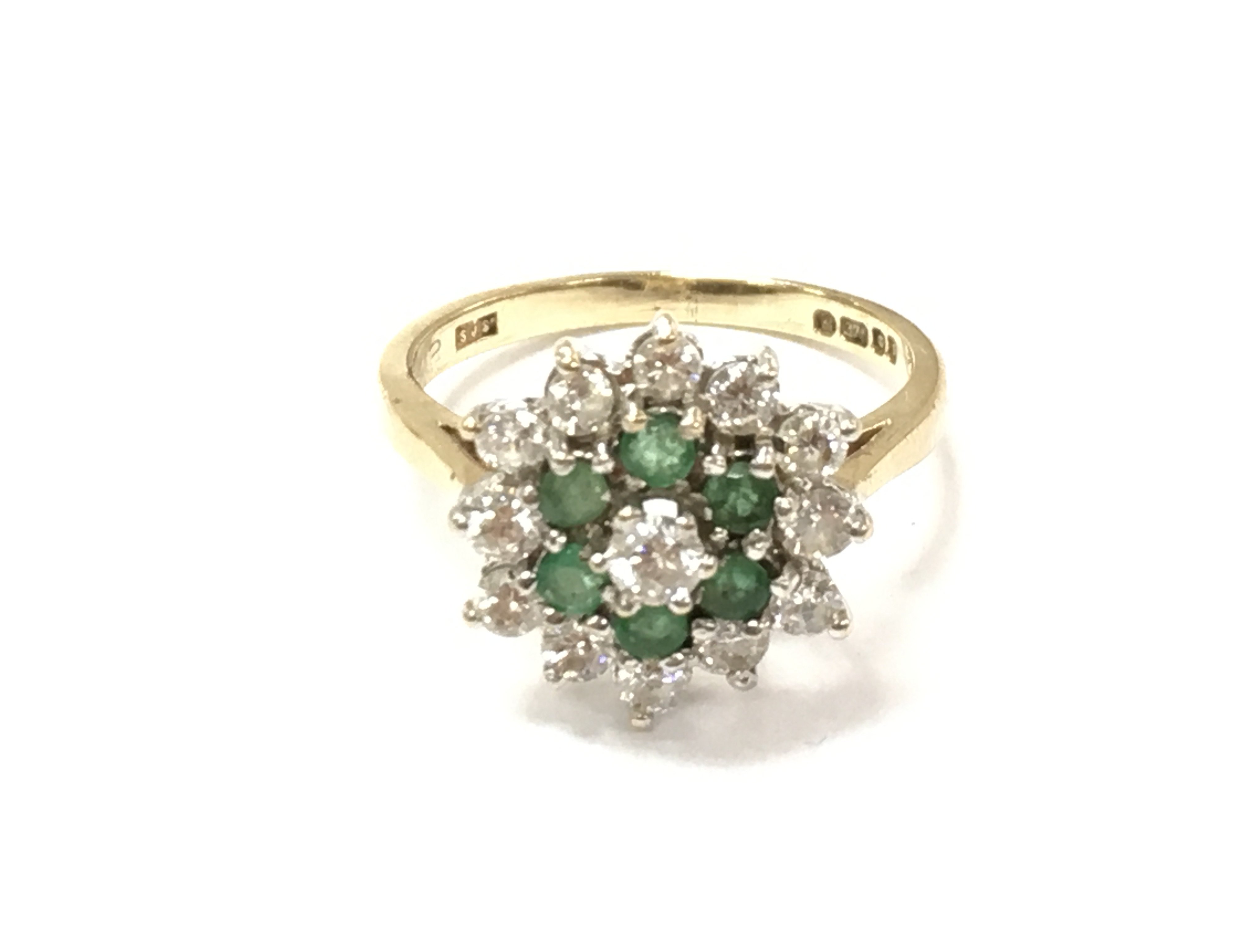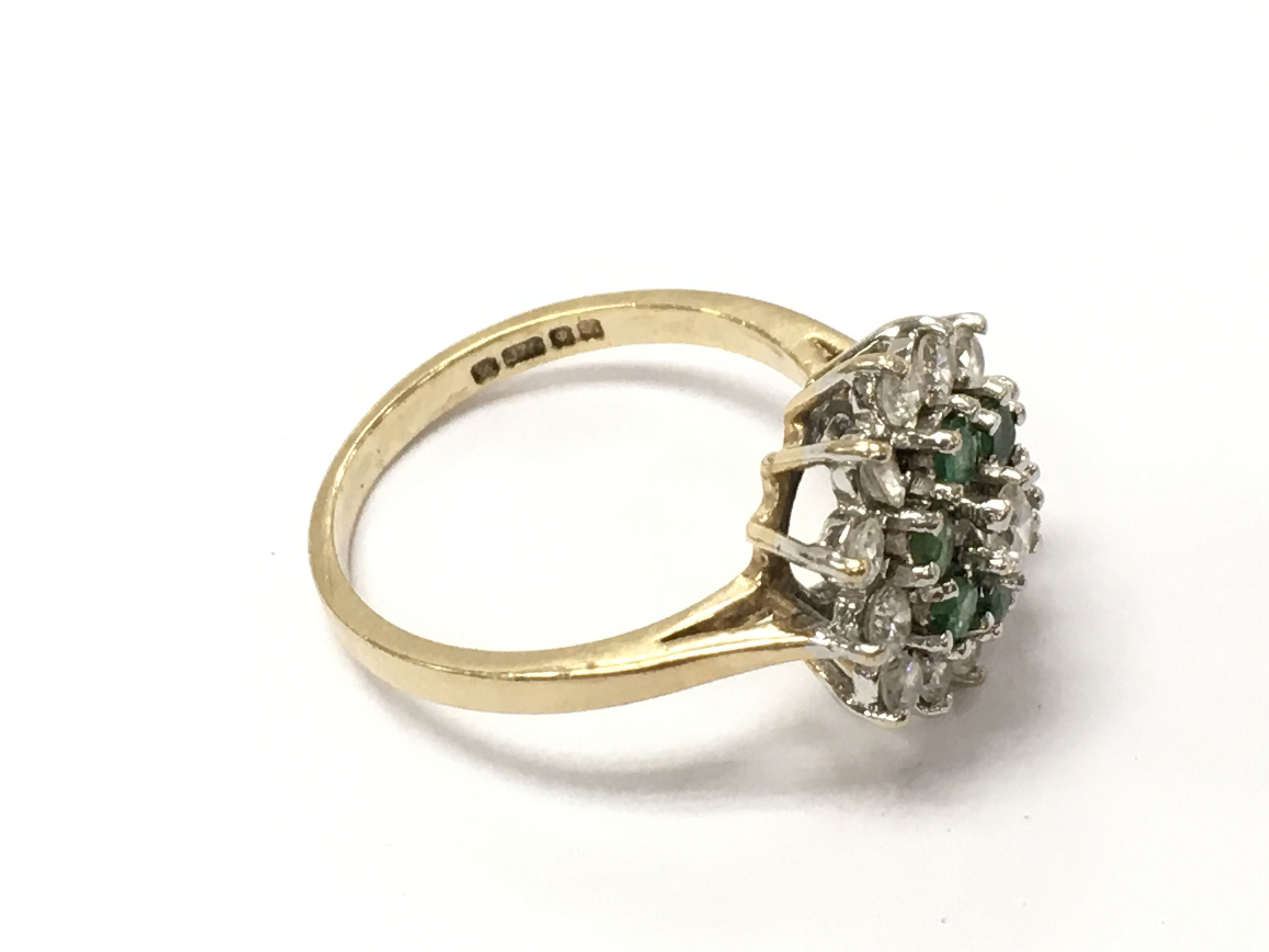 A 9ct gold emerald and diamond cluster ring. Size M 1/2 and 3.02g