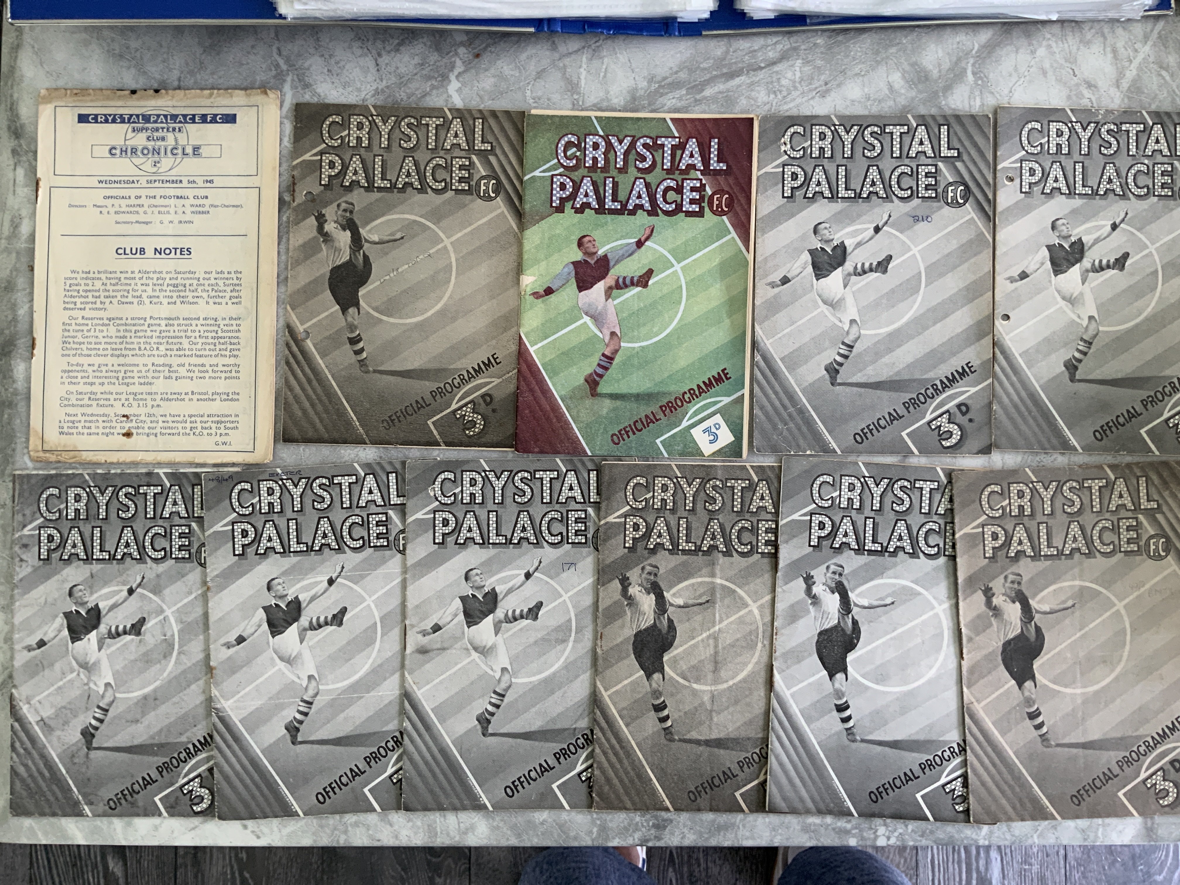 1940s Crystal Palace Home Football Programmes: 45/46 Reading, 47/48 QPR, Swindon, Bournemouth, Torquay punch holes, 48/49 Bristol Rovers, Port Vale punch holes, Newport, Exeter, Brighton and 49/50 Newport. Mixed conditions. (11)