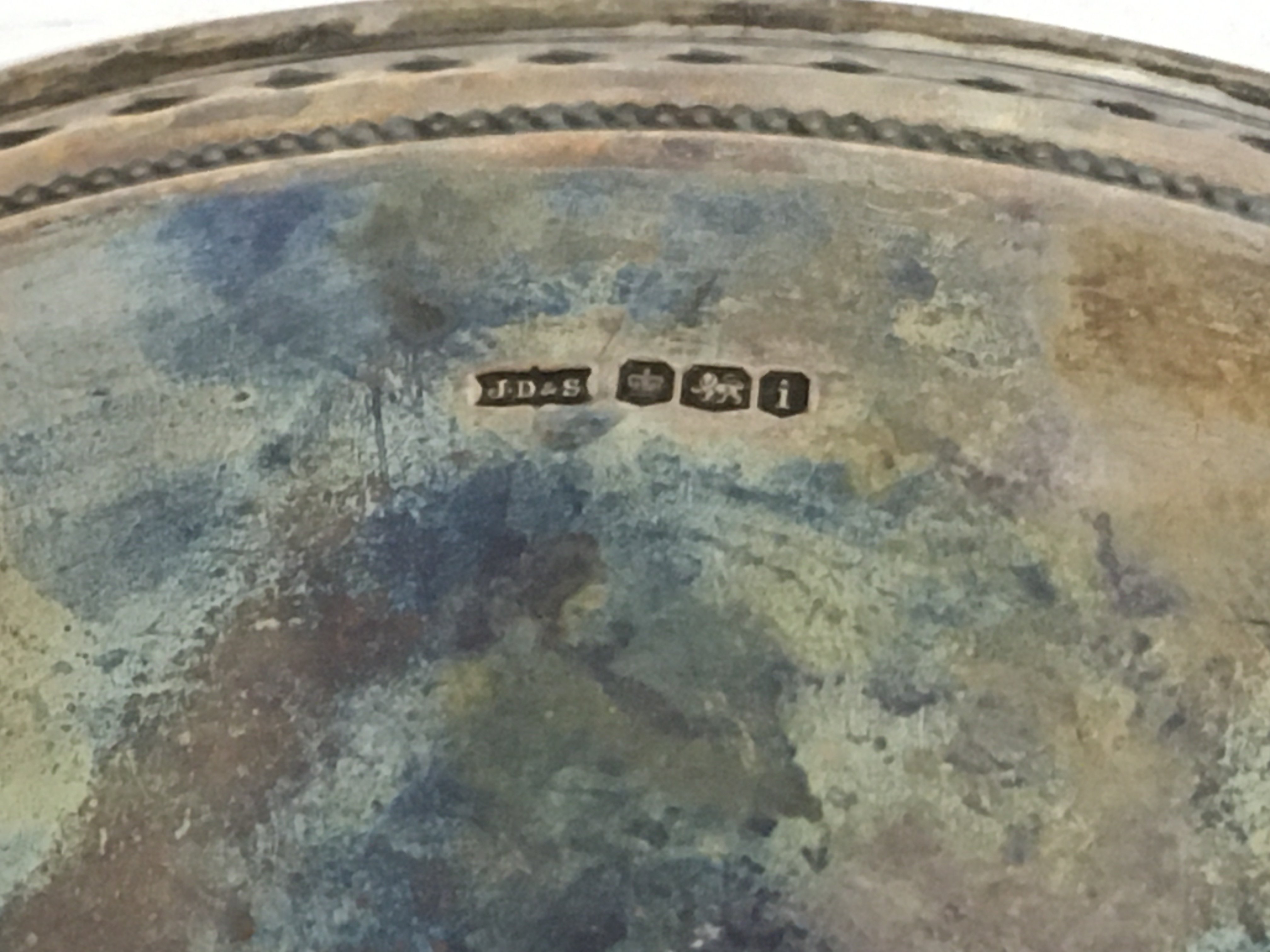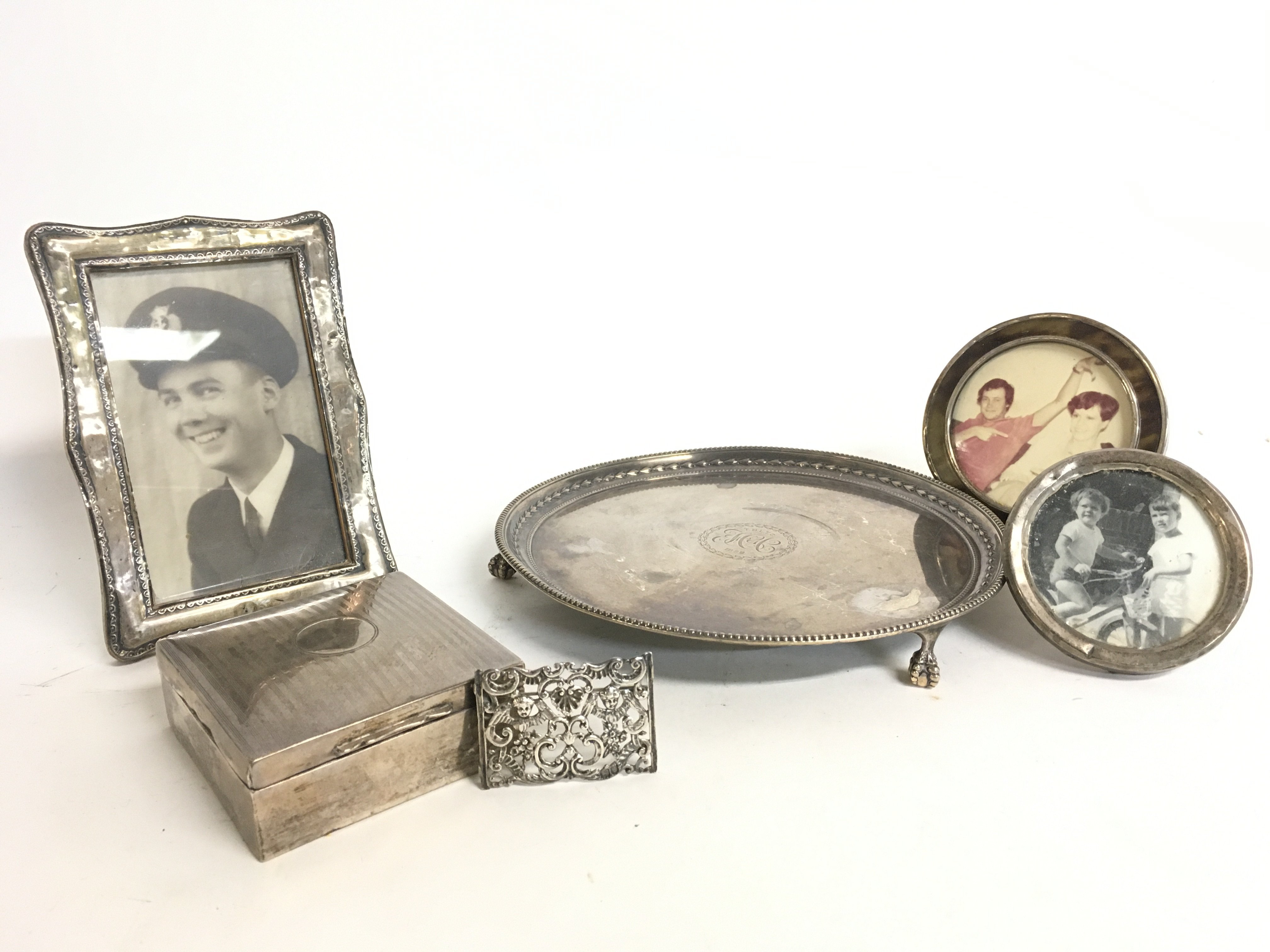 A collection of silver hallmarked items including a dish, trinket box, photo frames, putto brooch. This lot cannot be posted