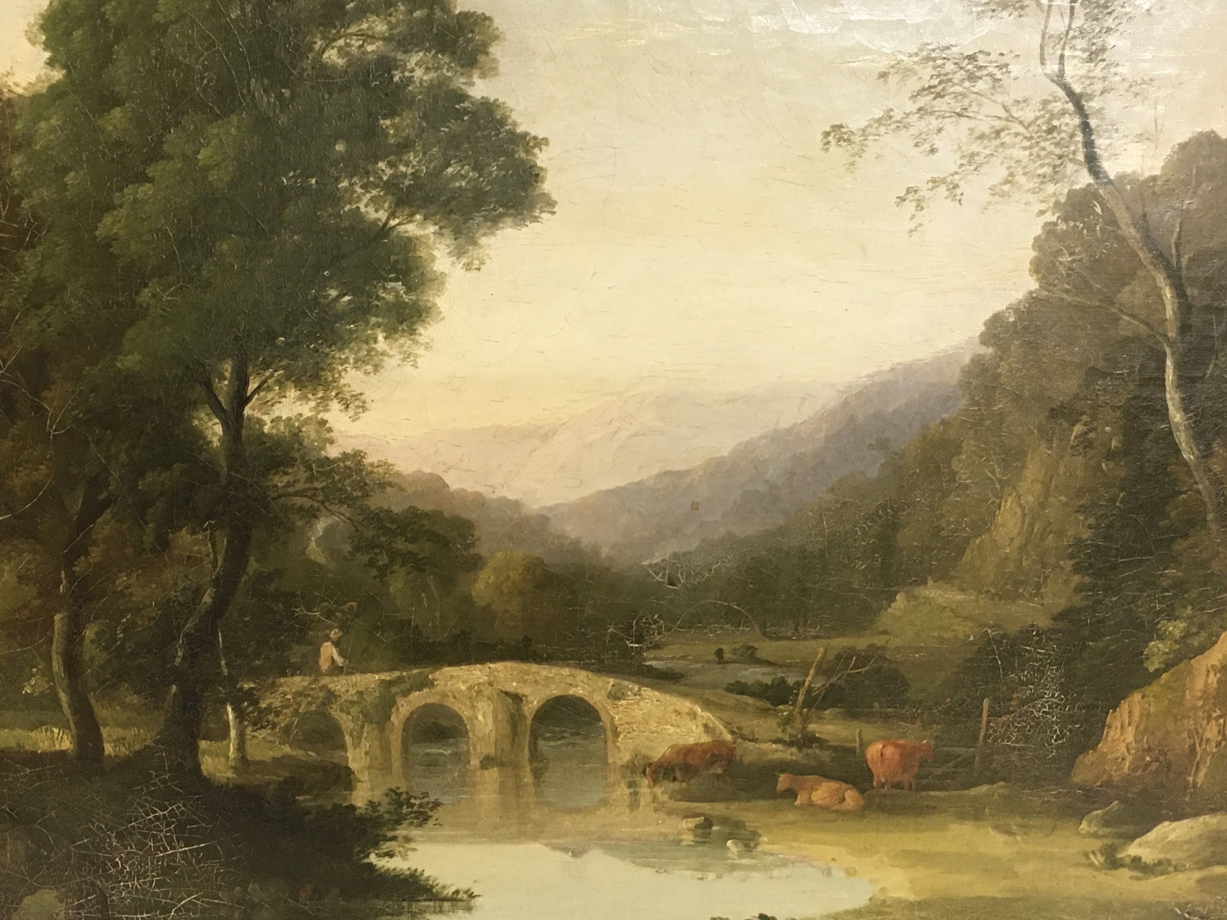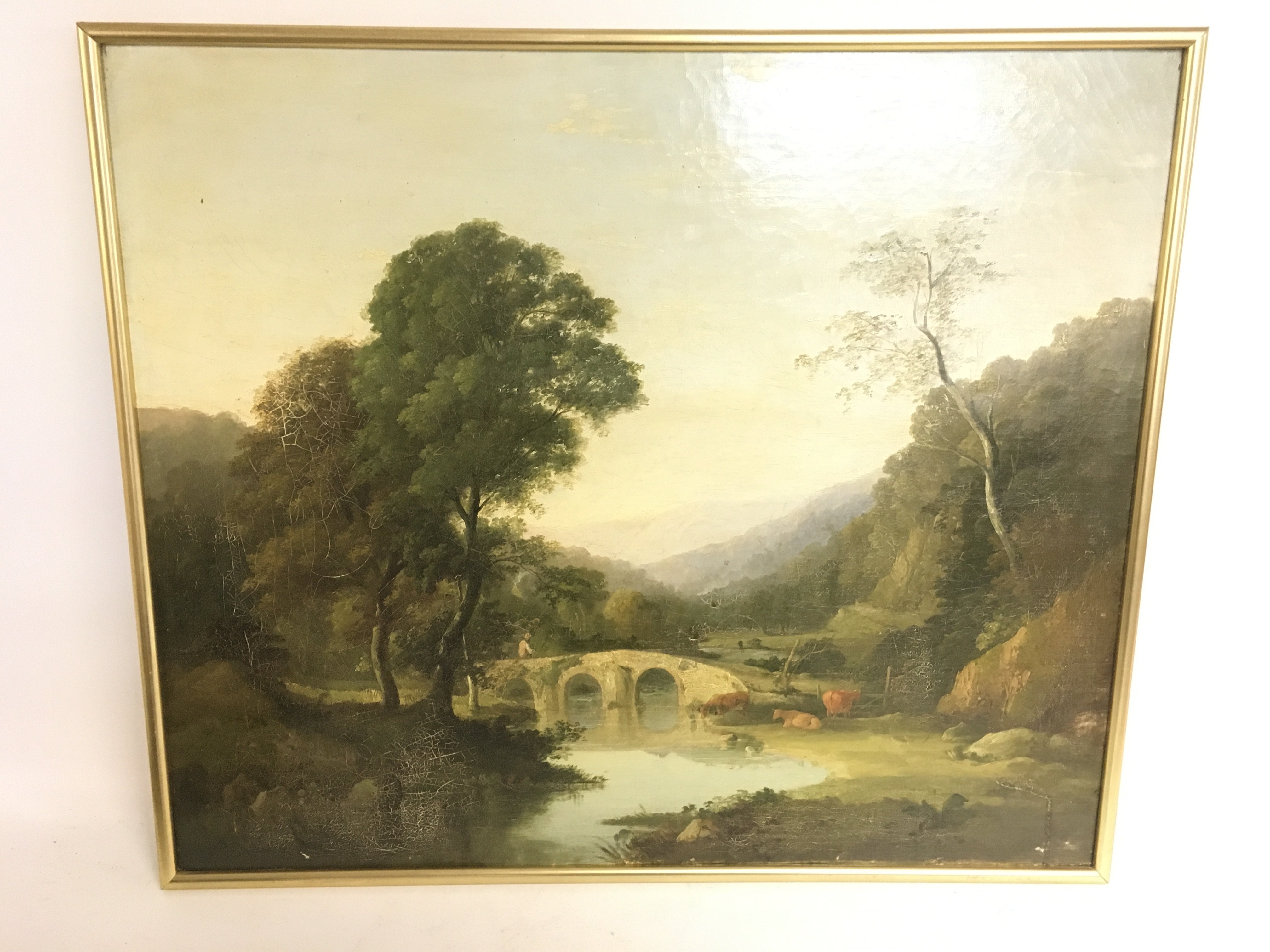A late 18th century framed oil on canvas painting of a rural landscape, dimensions 70x60cm