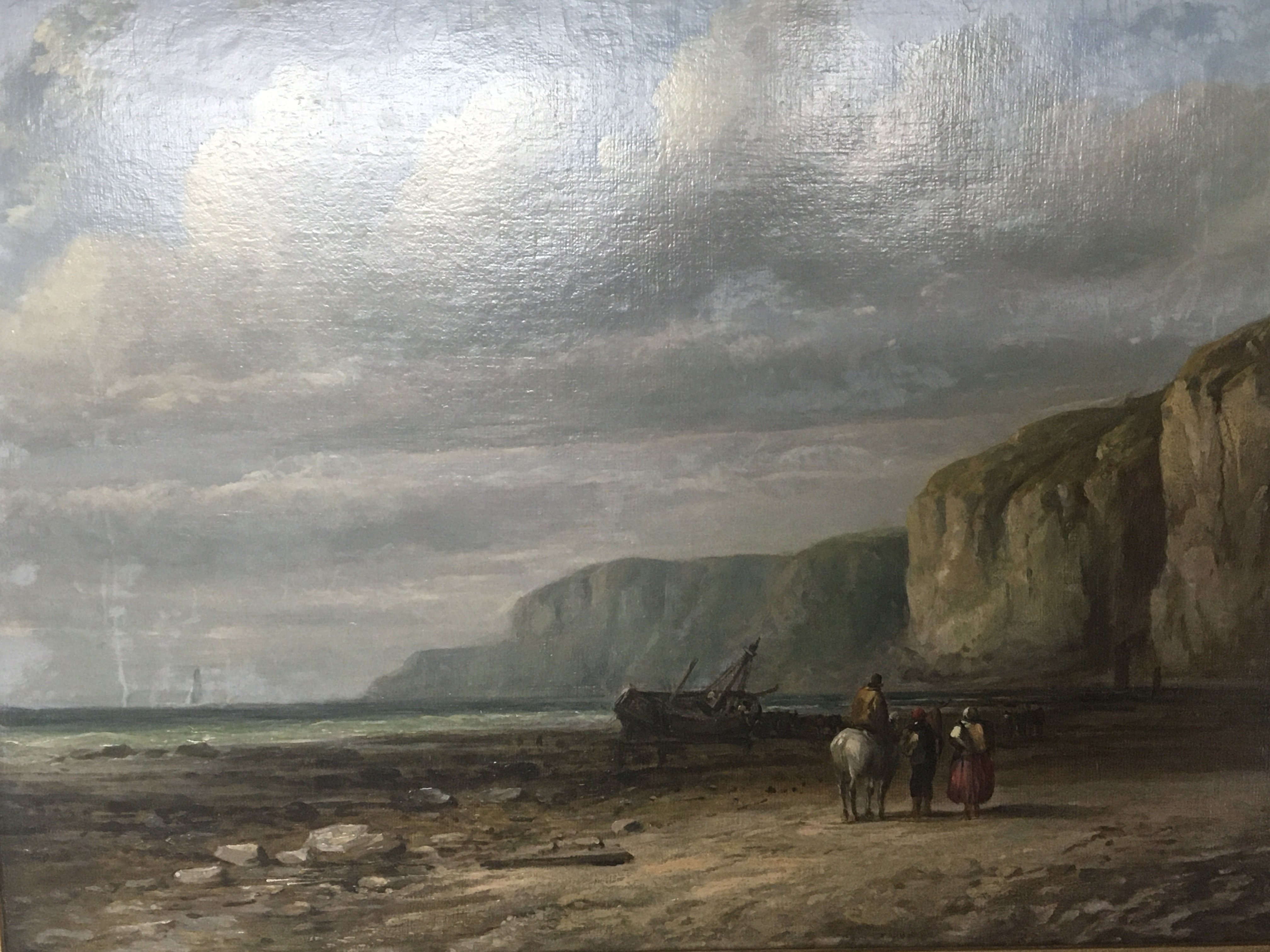 A framed oil painting on canvas study of a coastal view with a shipwreck in the style of james Webb 1835-1895. Gallery label to the reverse. 52x42cm