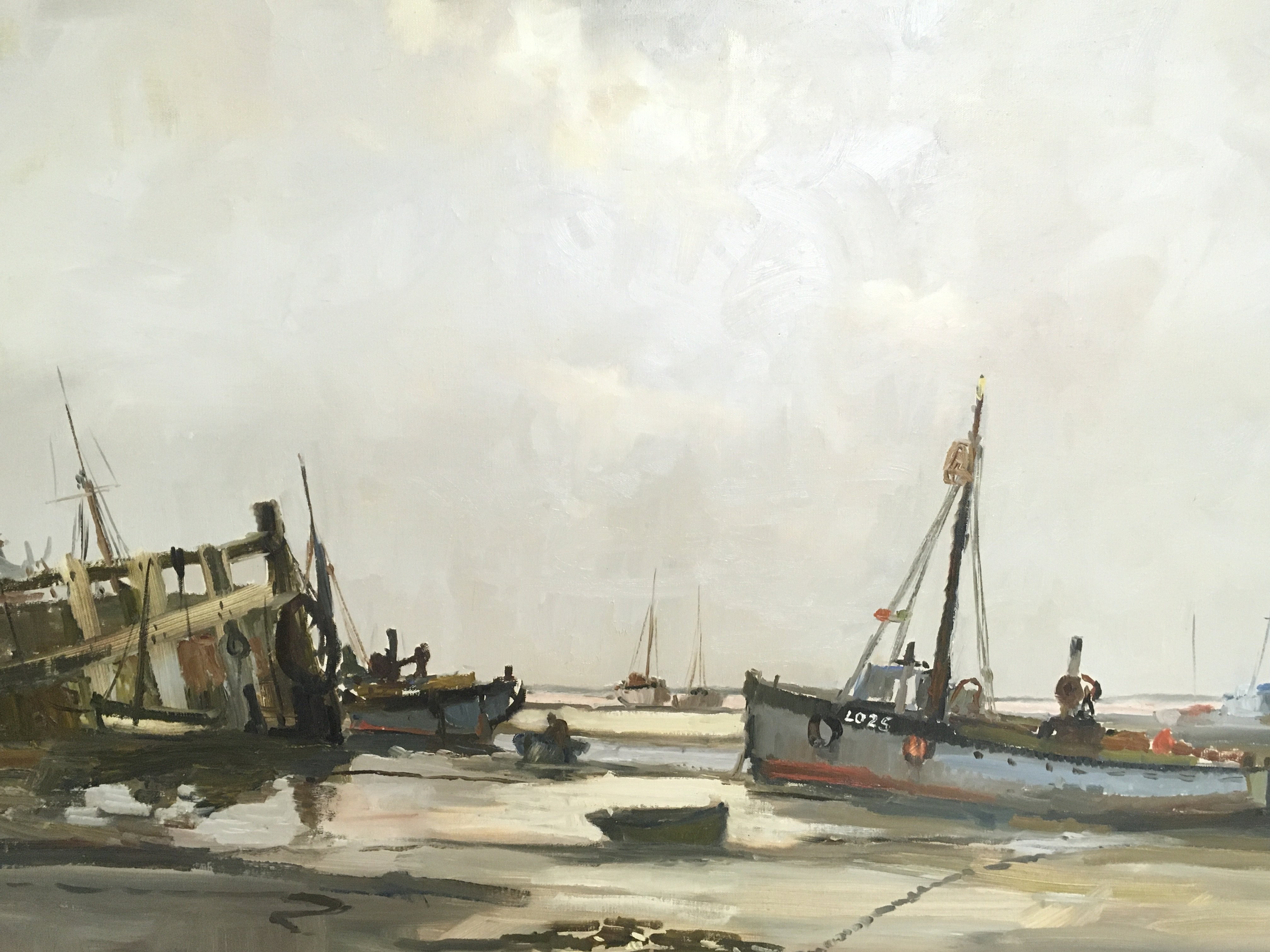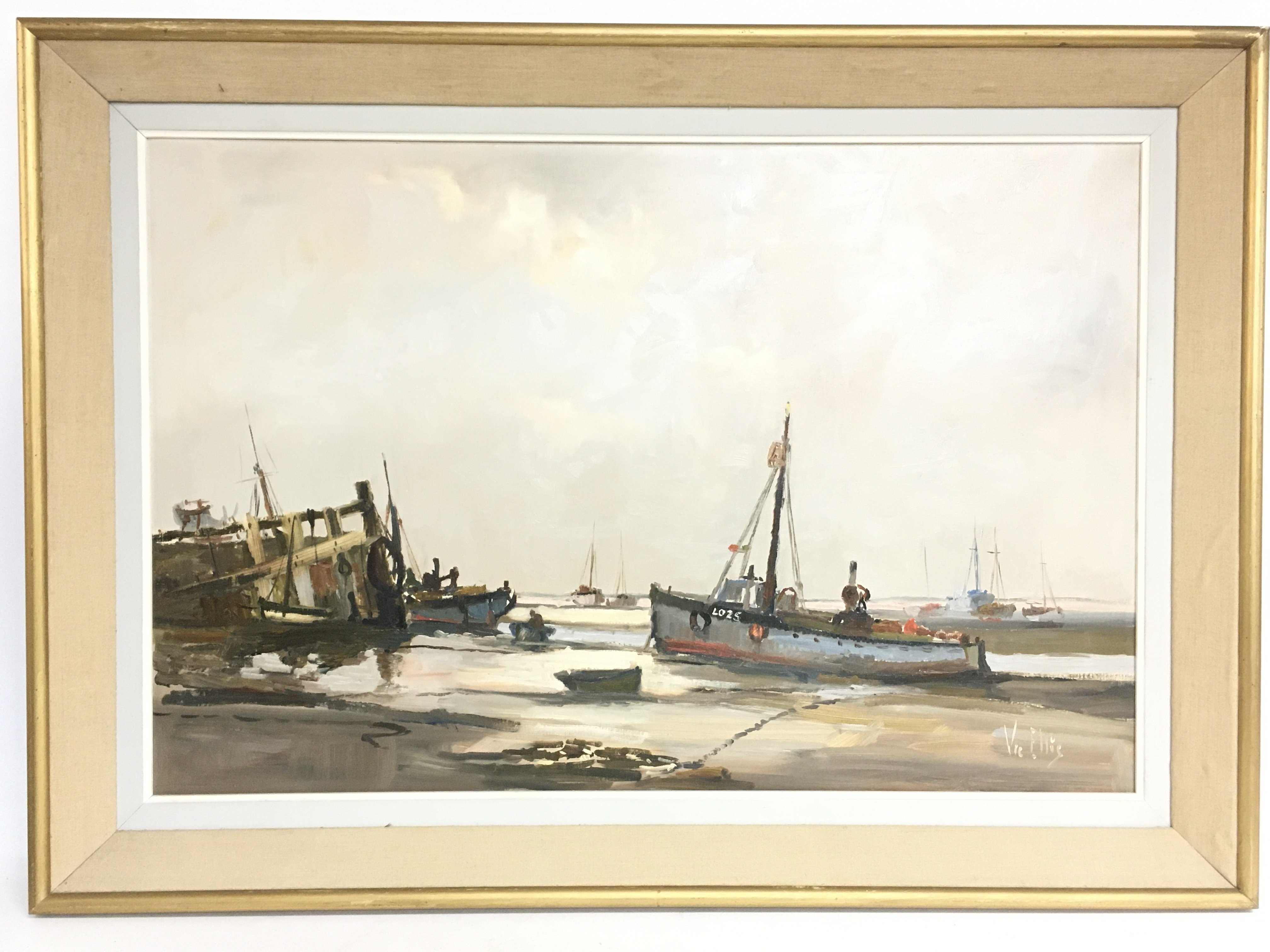 A large framed oil painting depicting boats at shore by local artist Vic Ellis (1921-1984). Dimensions 90x65cm.