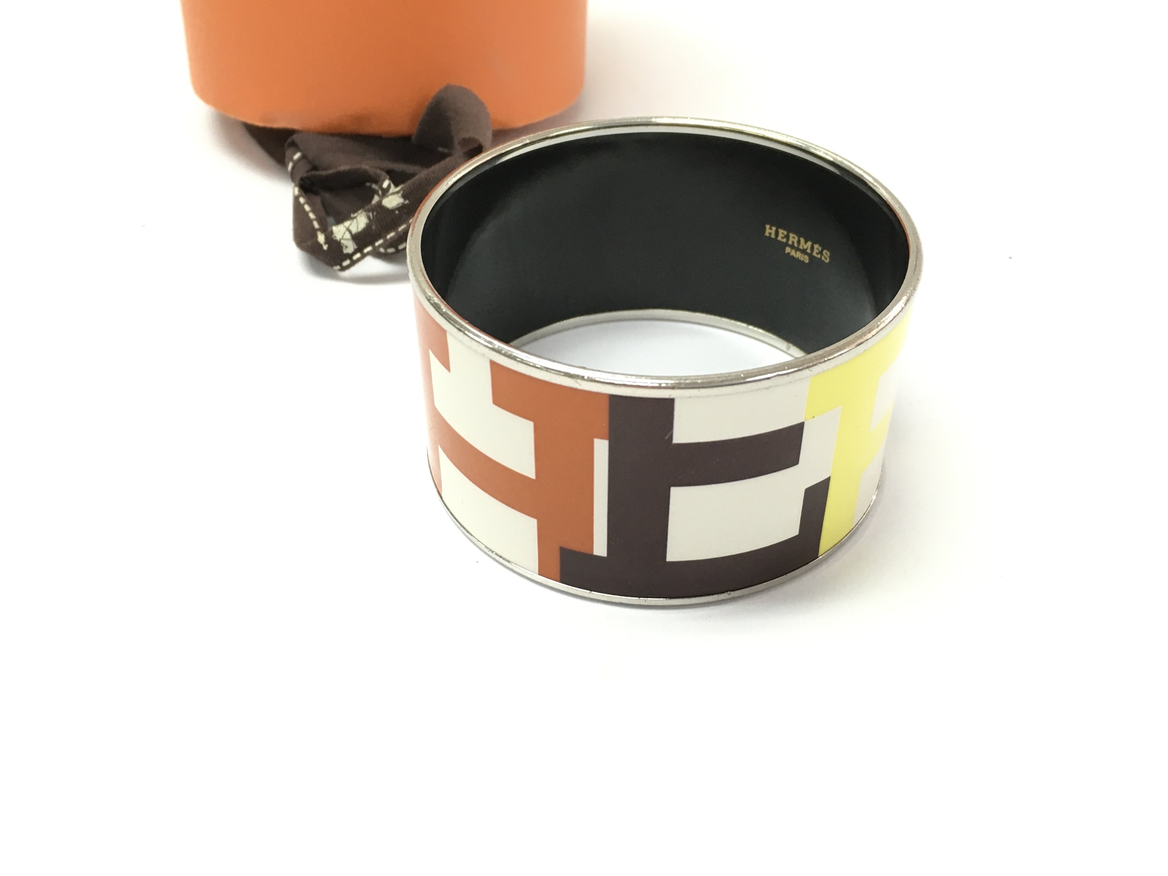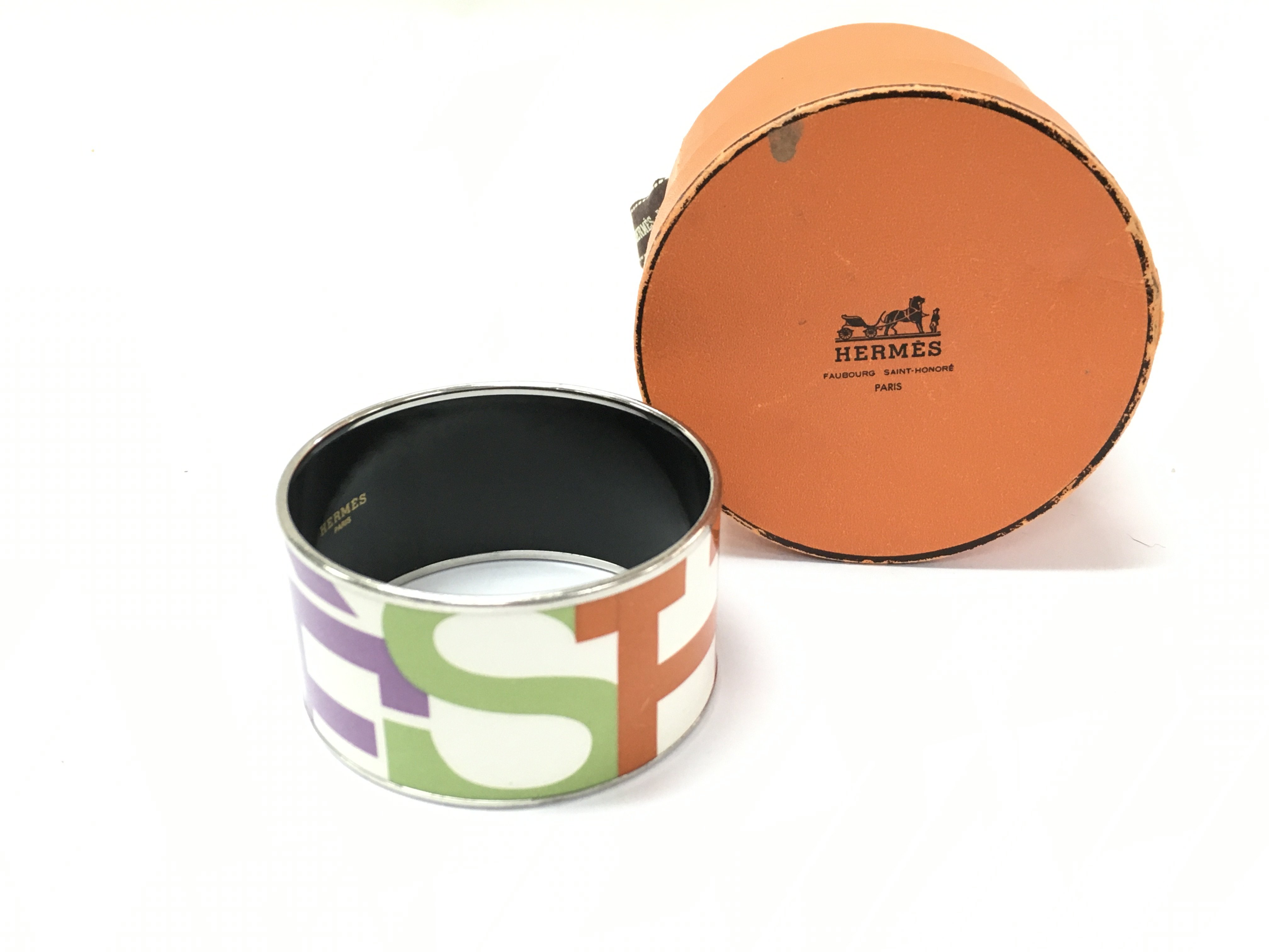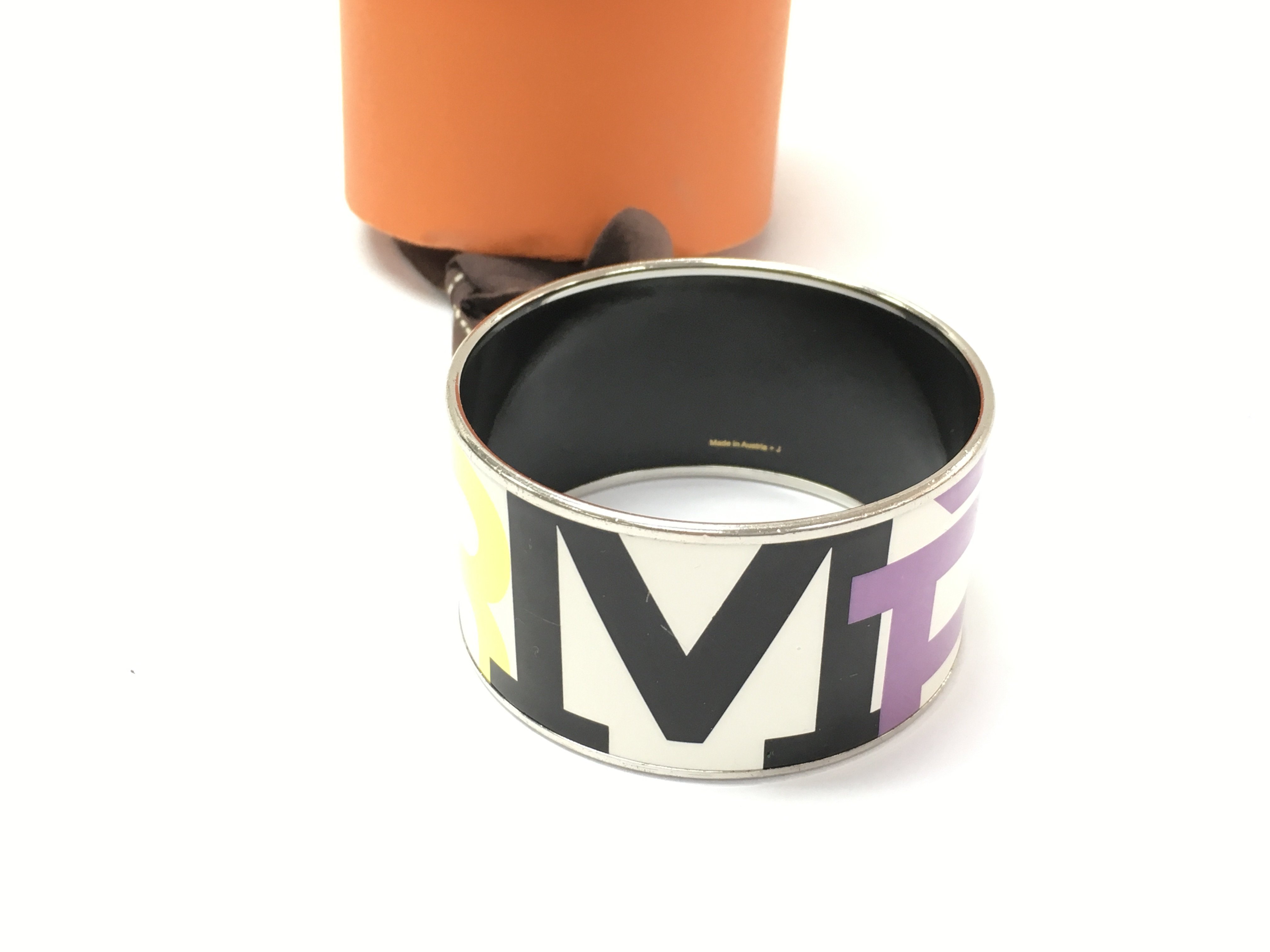 A Hermes multicolour enamel logo and metal bangle with box. Bangle is 35mm wide and 6.5cm diameter.