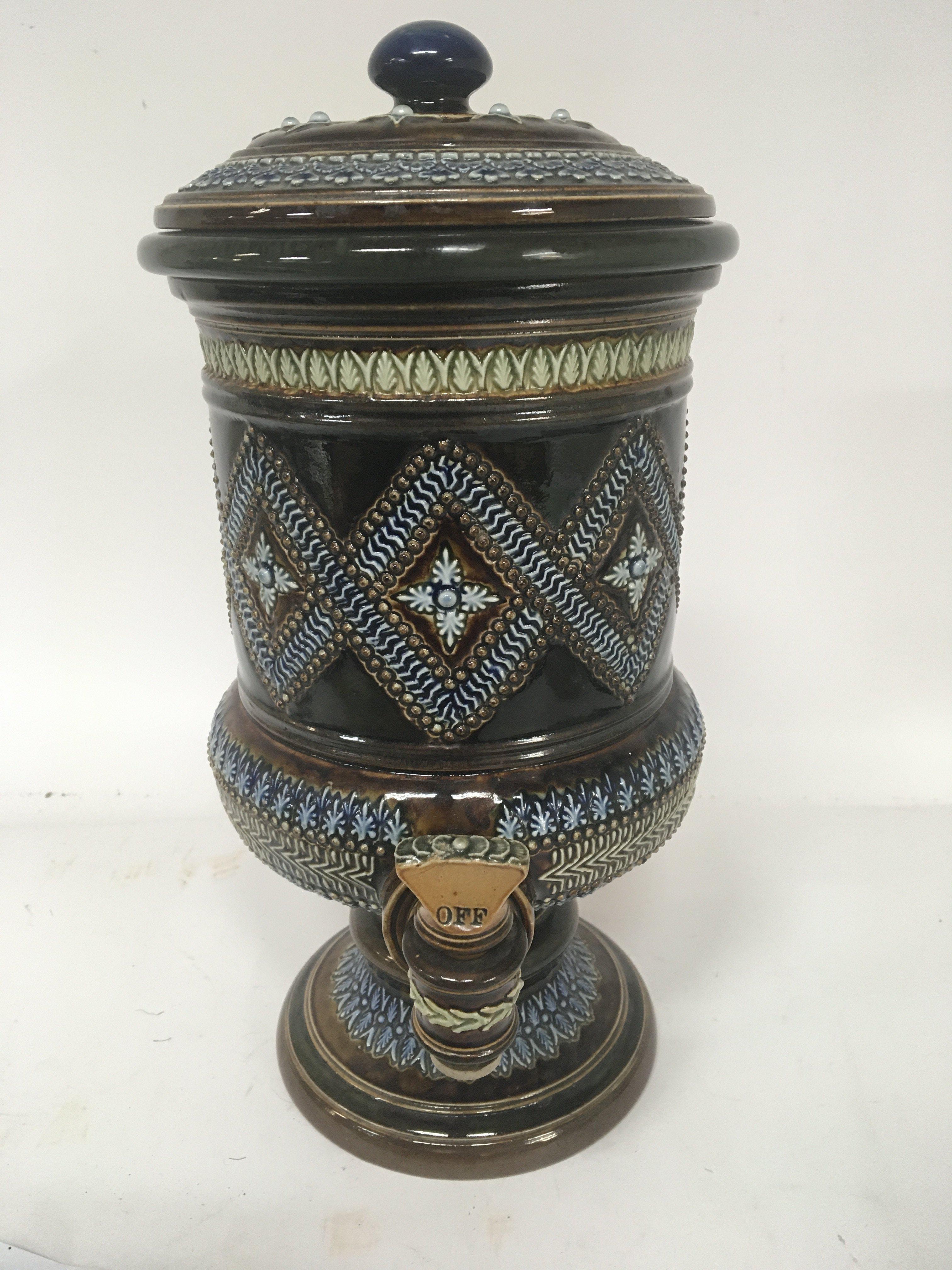 A Quality Victorian Lambeth Doulton stoneware water filter container. With lid with a raised pattern decoration no obvious damage. Height 36cm