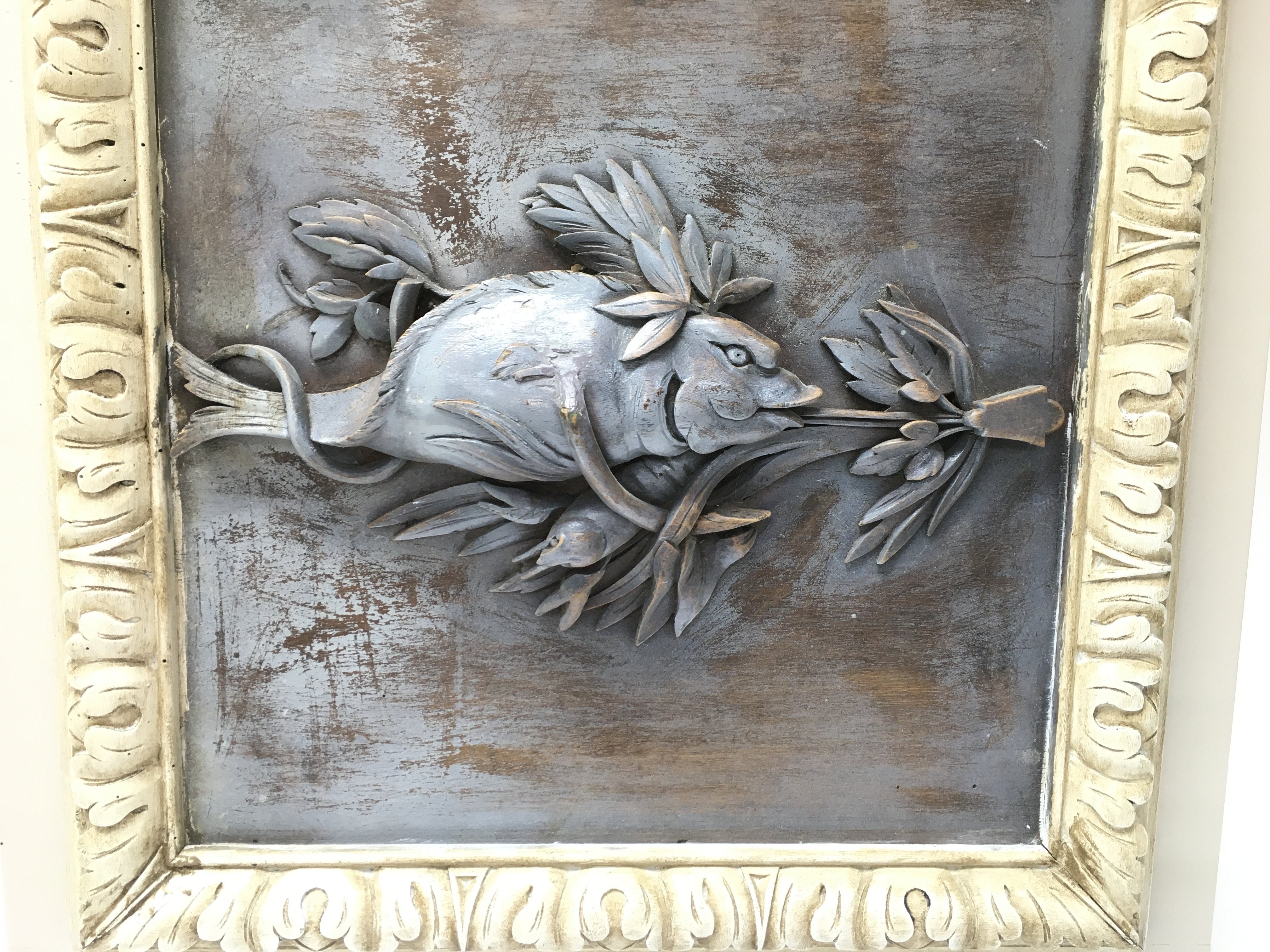 An interesting carved hardwood 19th century panel of a fish Panel is in a later frame. Overall size is 55cm wide by 60cm tall. Postage D