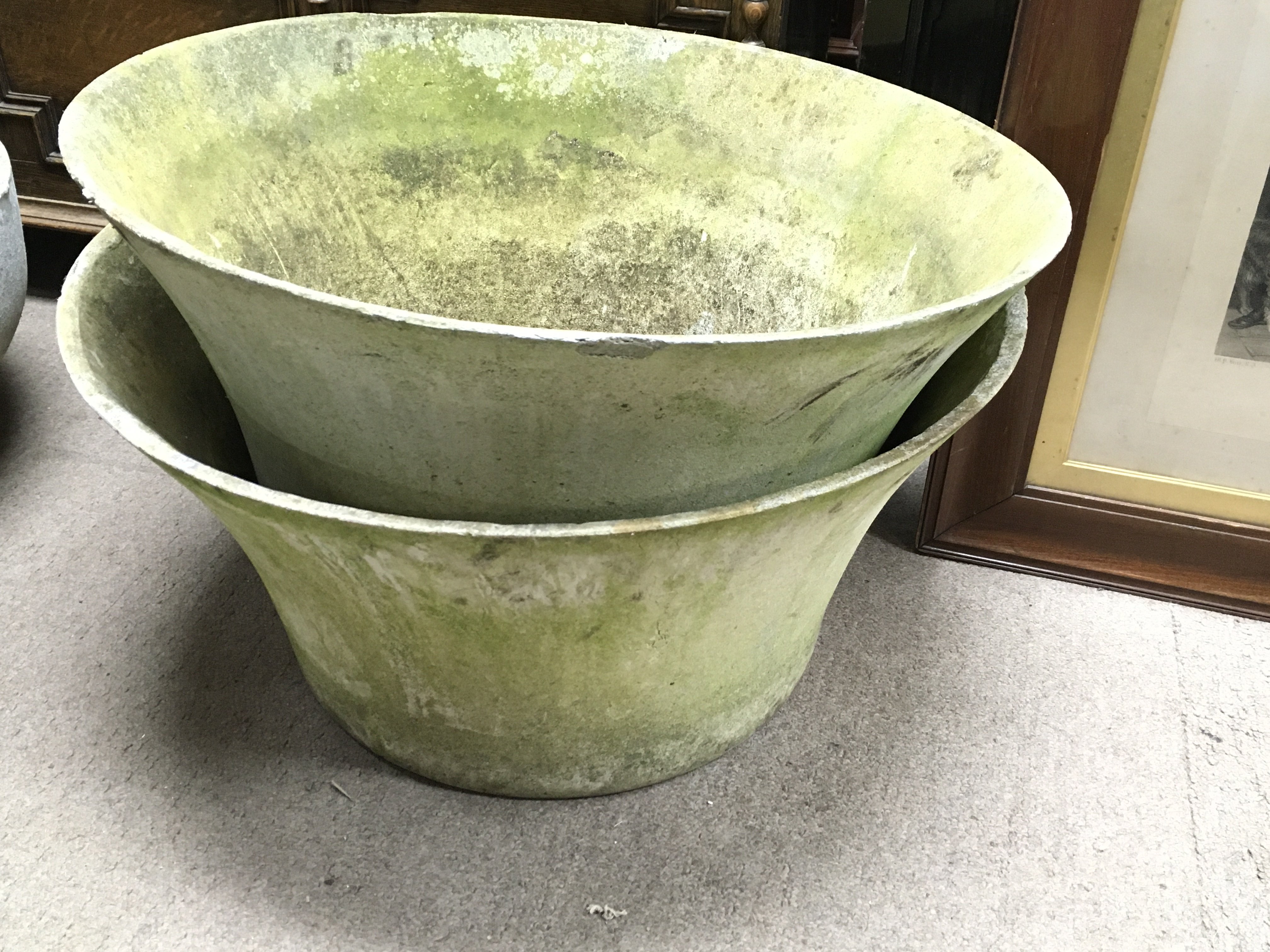 A florastone pair of large planters 60cm diameter and 30cm high. Long planter 124cm long.
