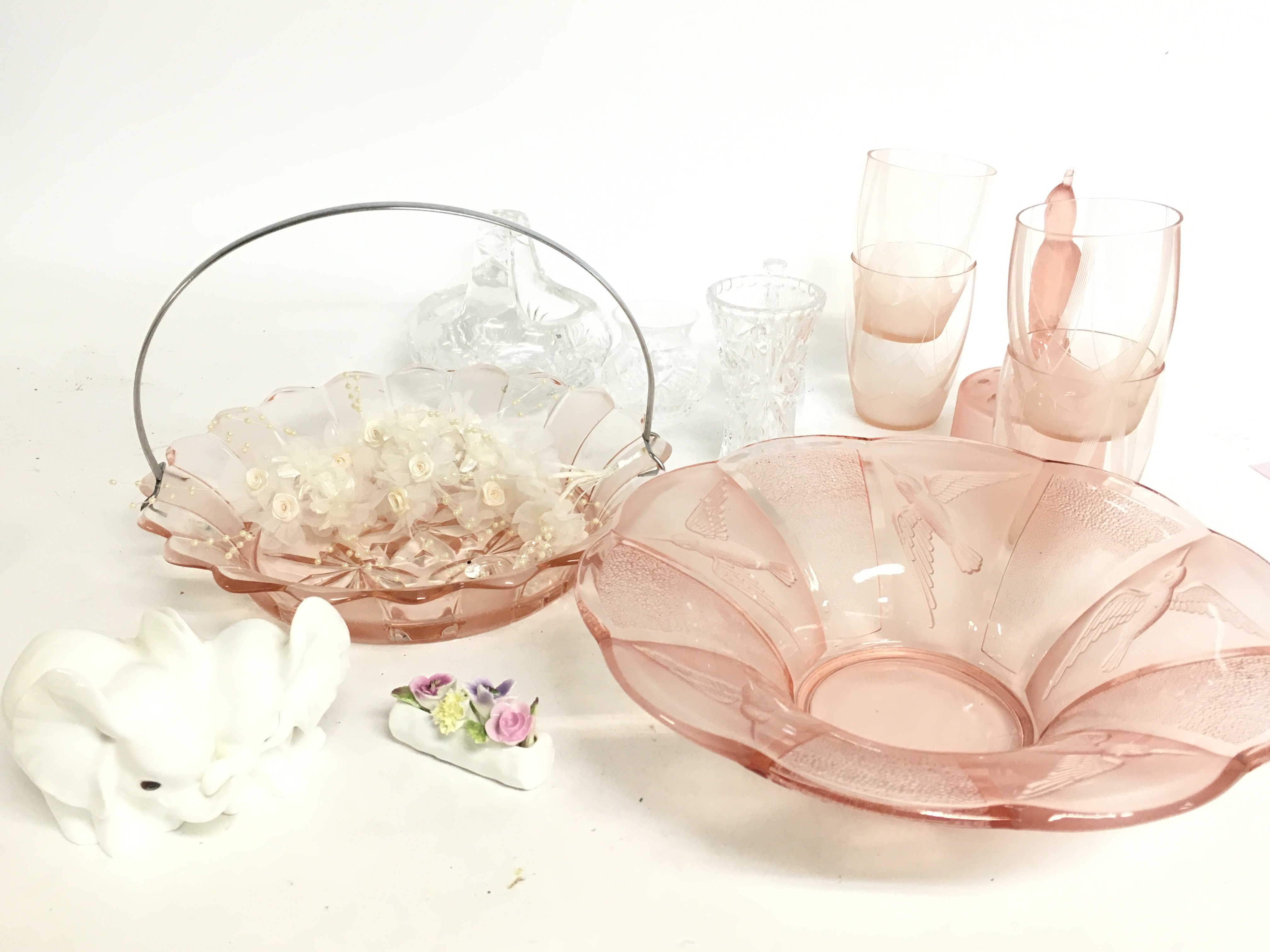 A collection of clear and pink cut glass including a kingfisher bowl, Royal Osborne elephant figure. This lot cannot be posted