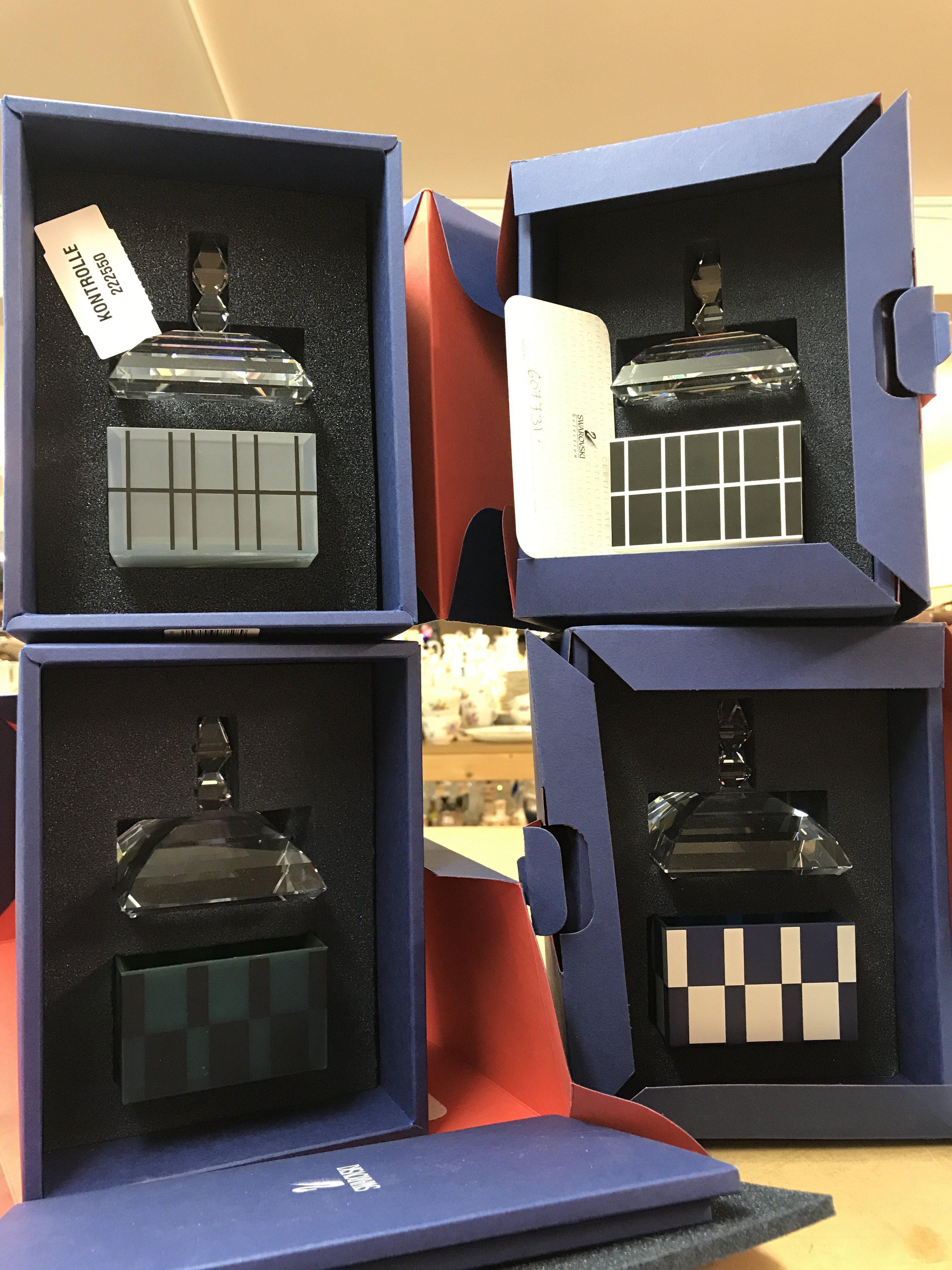 Four boxed Swarovski lidded trinket boxes, of geometric design. With Certificate in external boxes