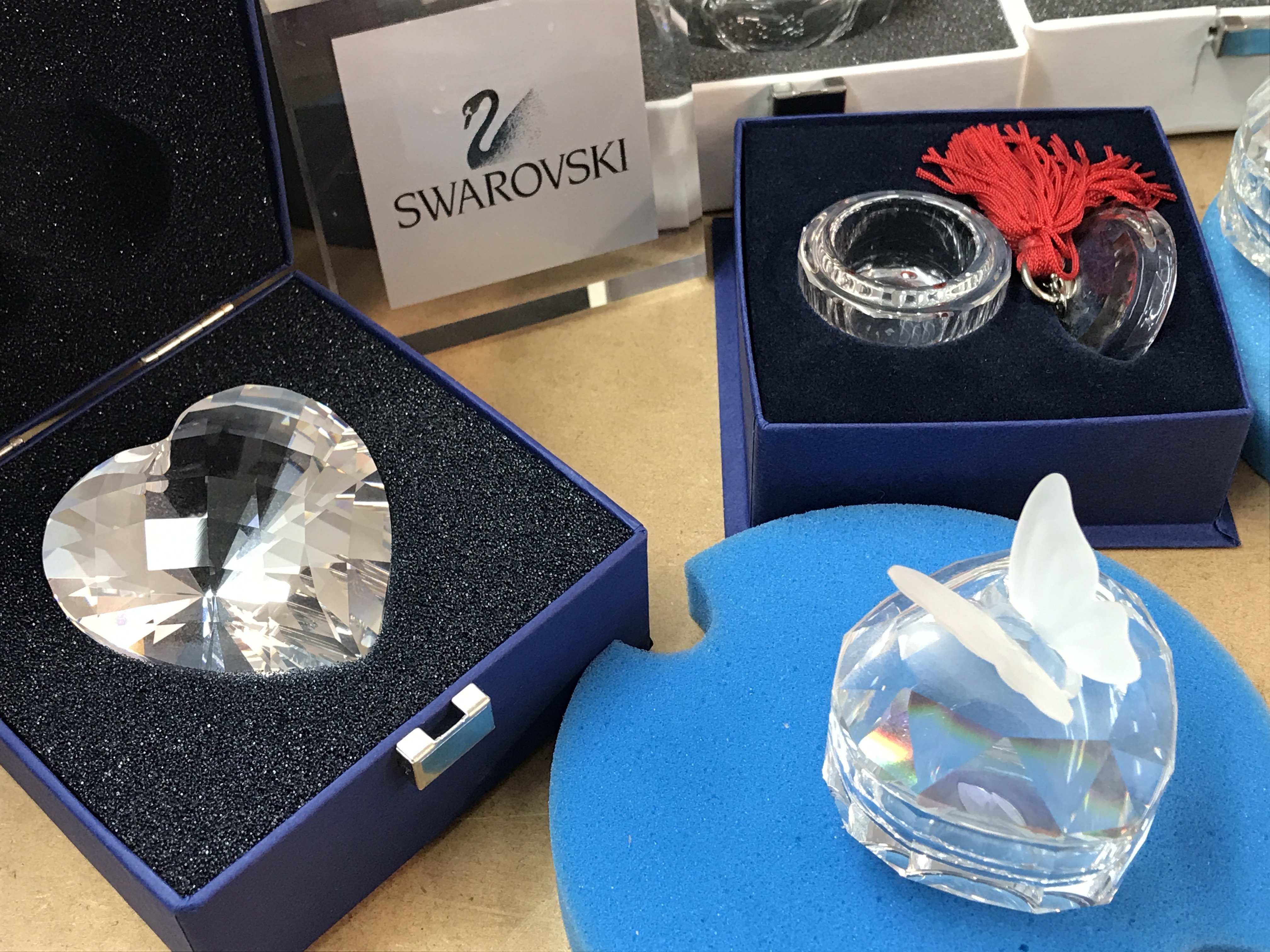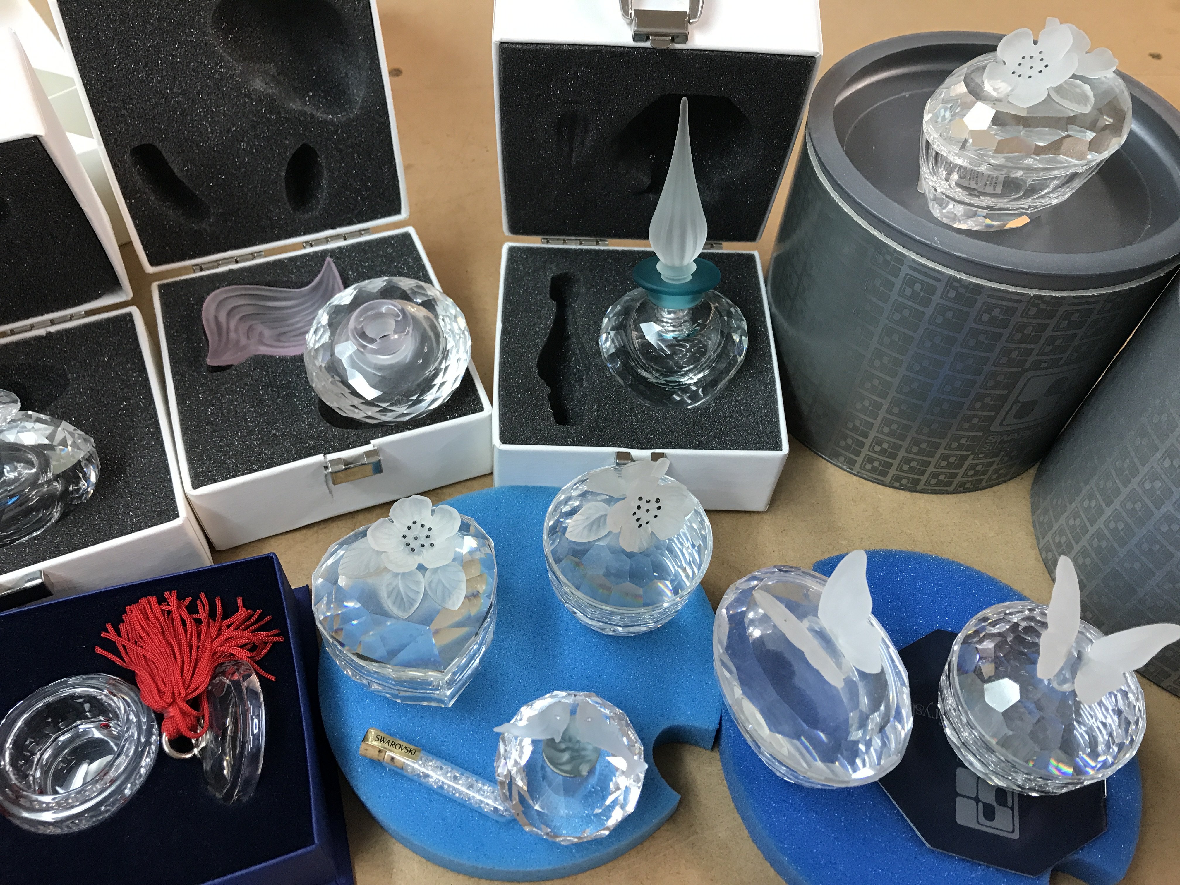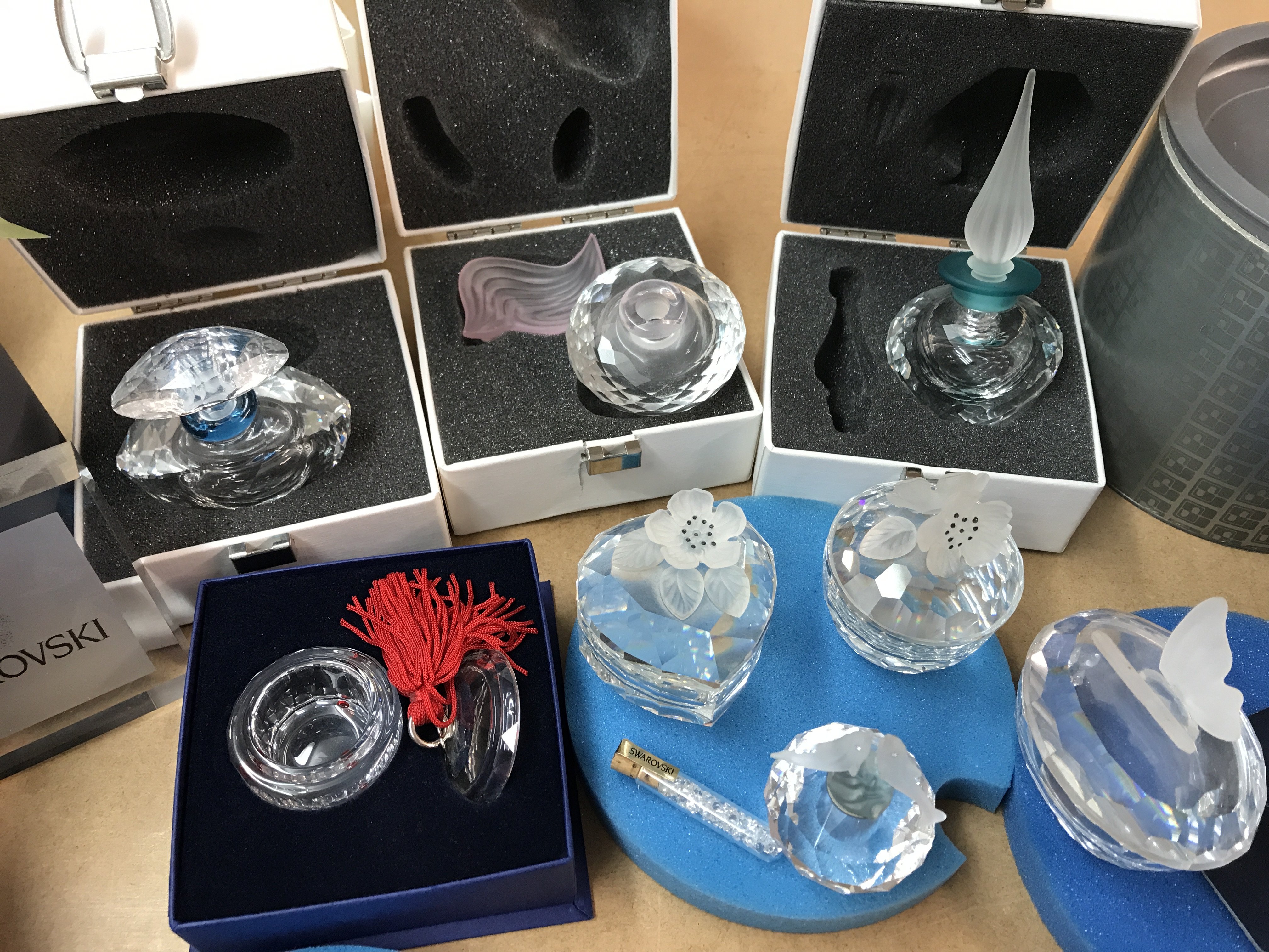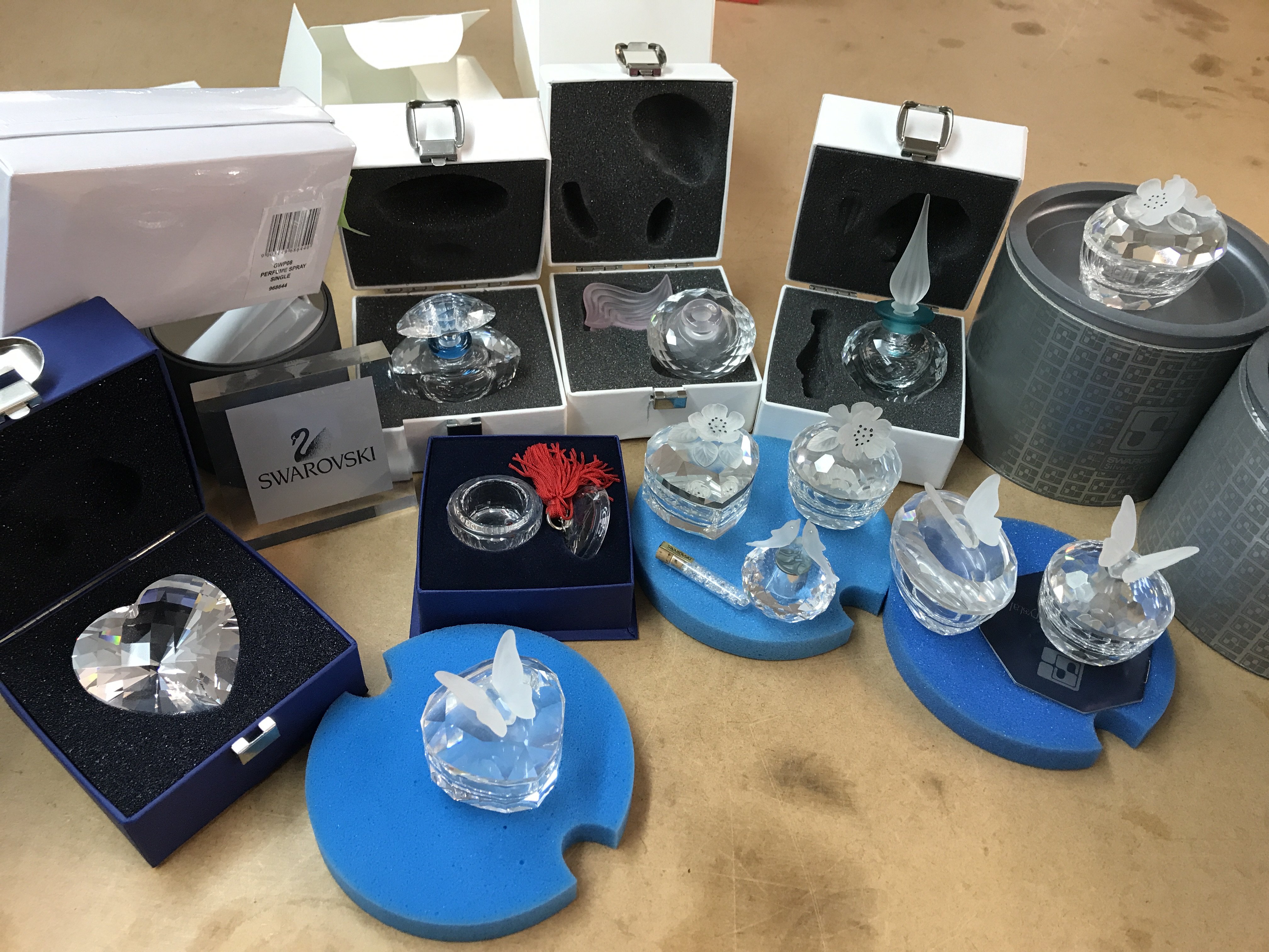 A collection of boxed Swarovski trinket boxes and perfume bottles of various design together with a boxed Swarovski heart
