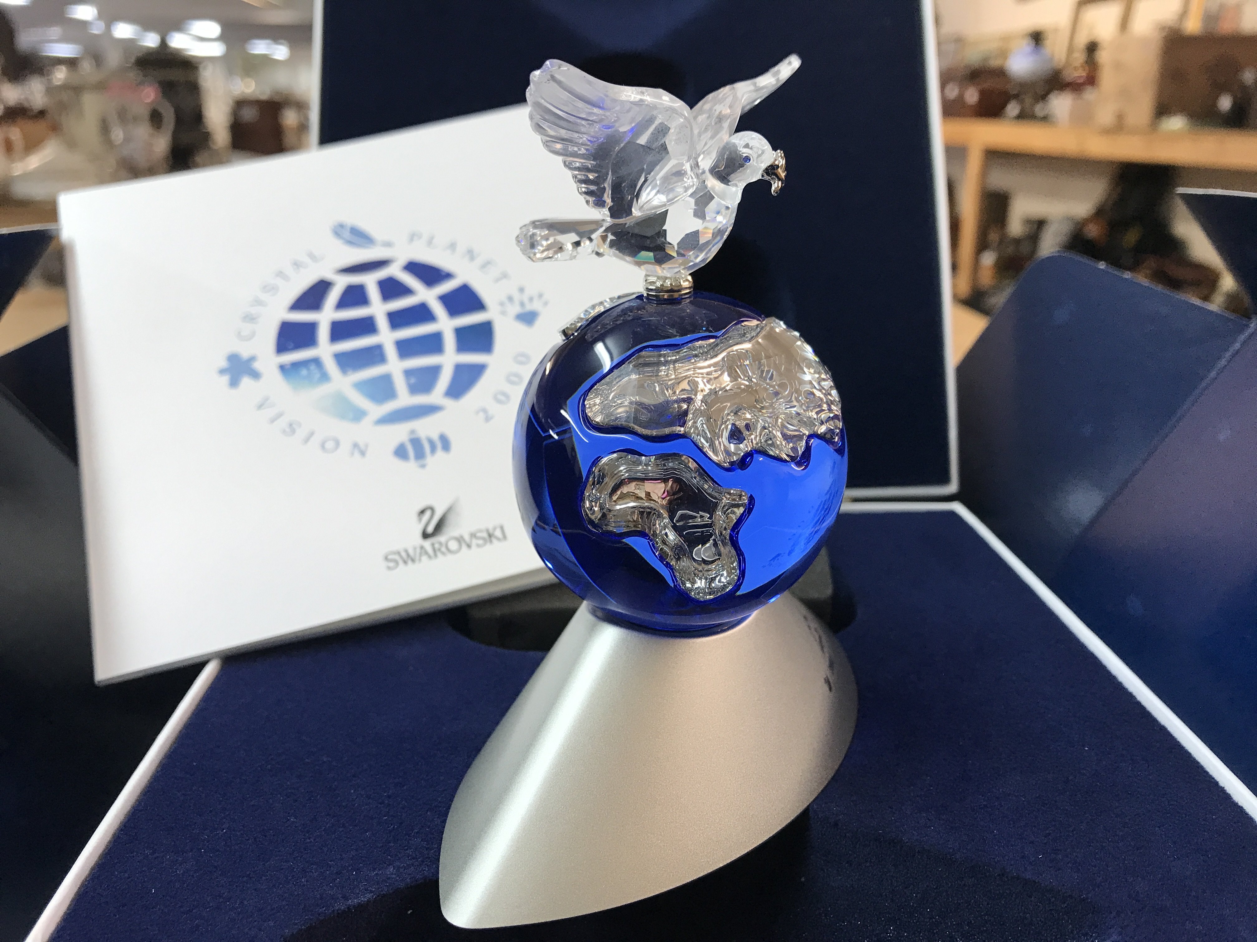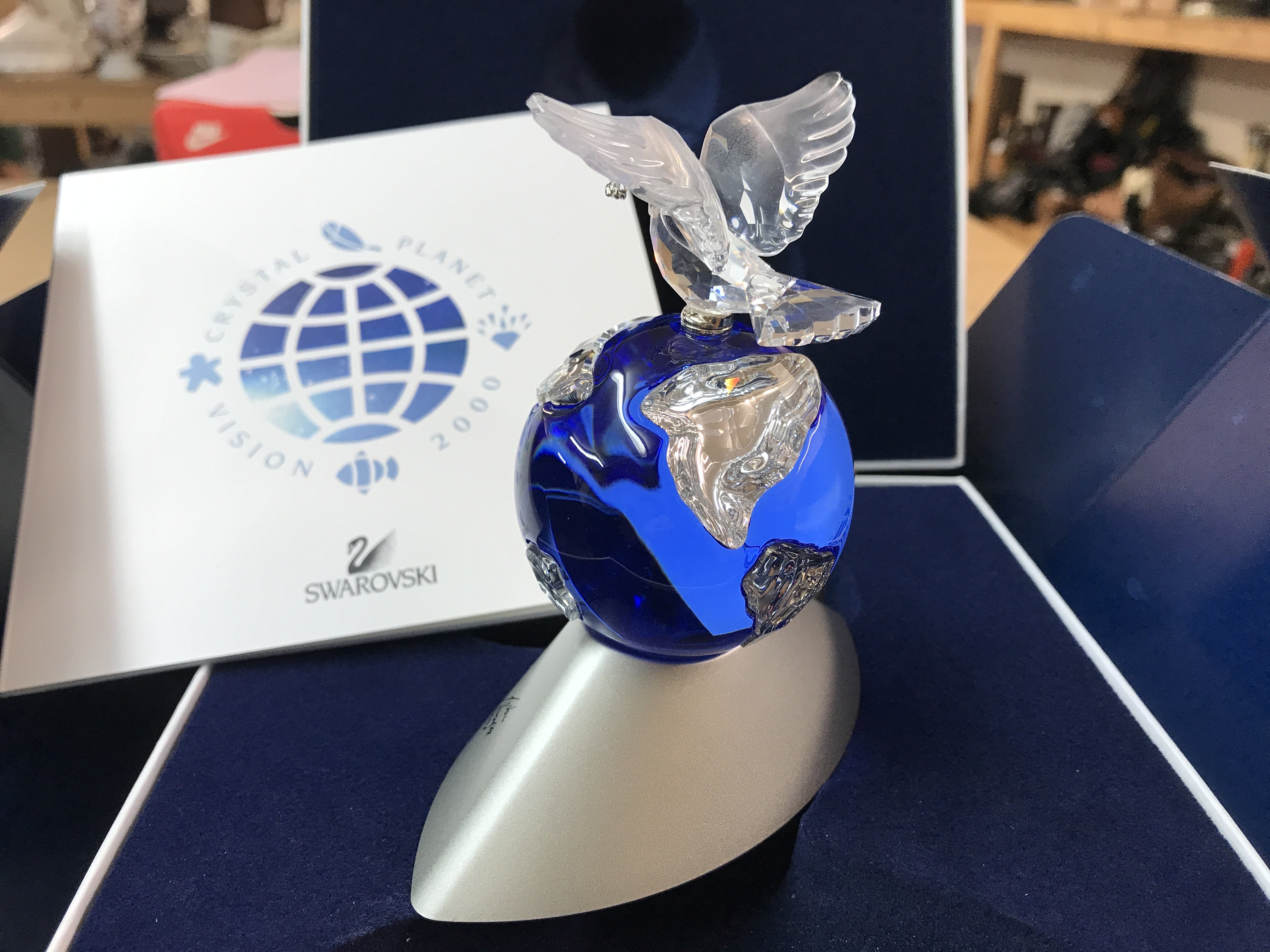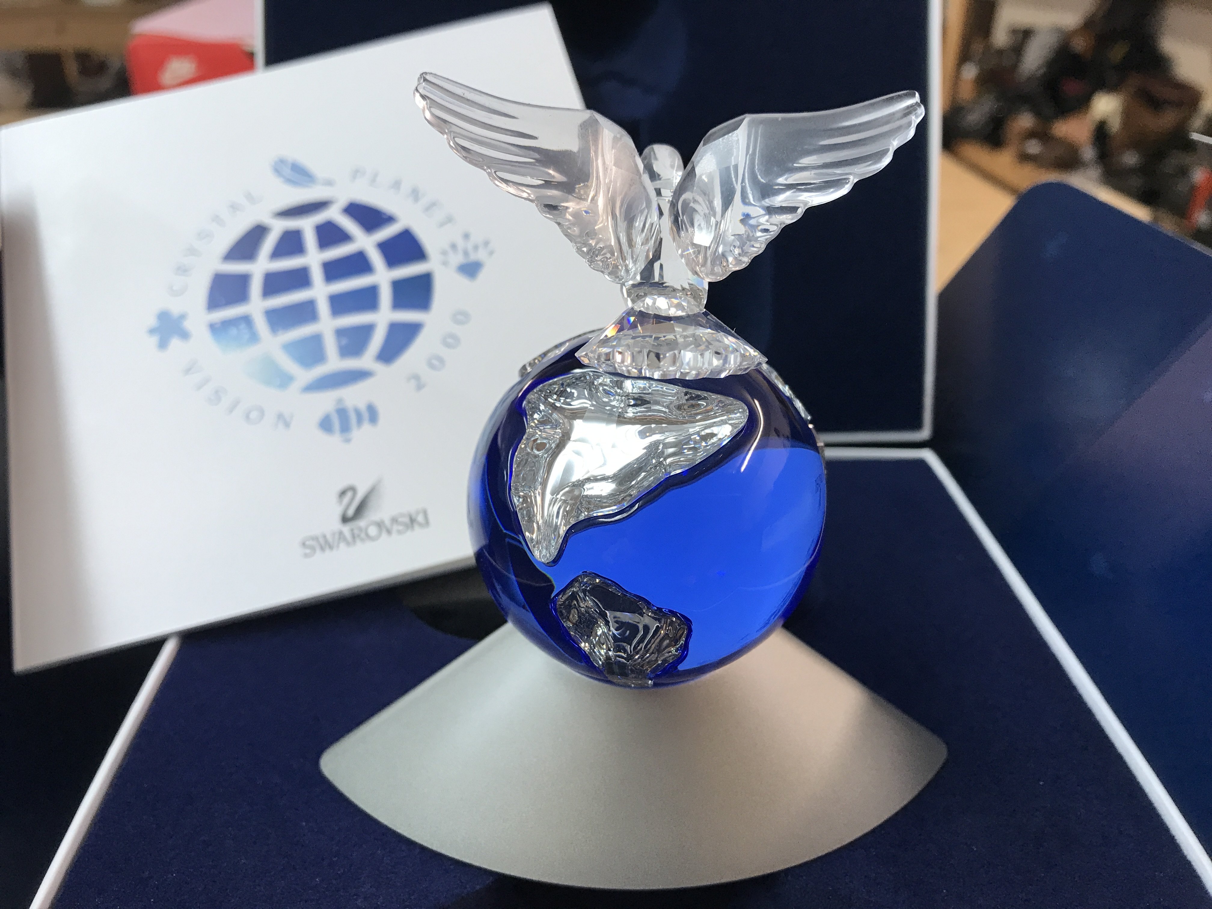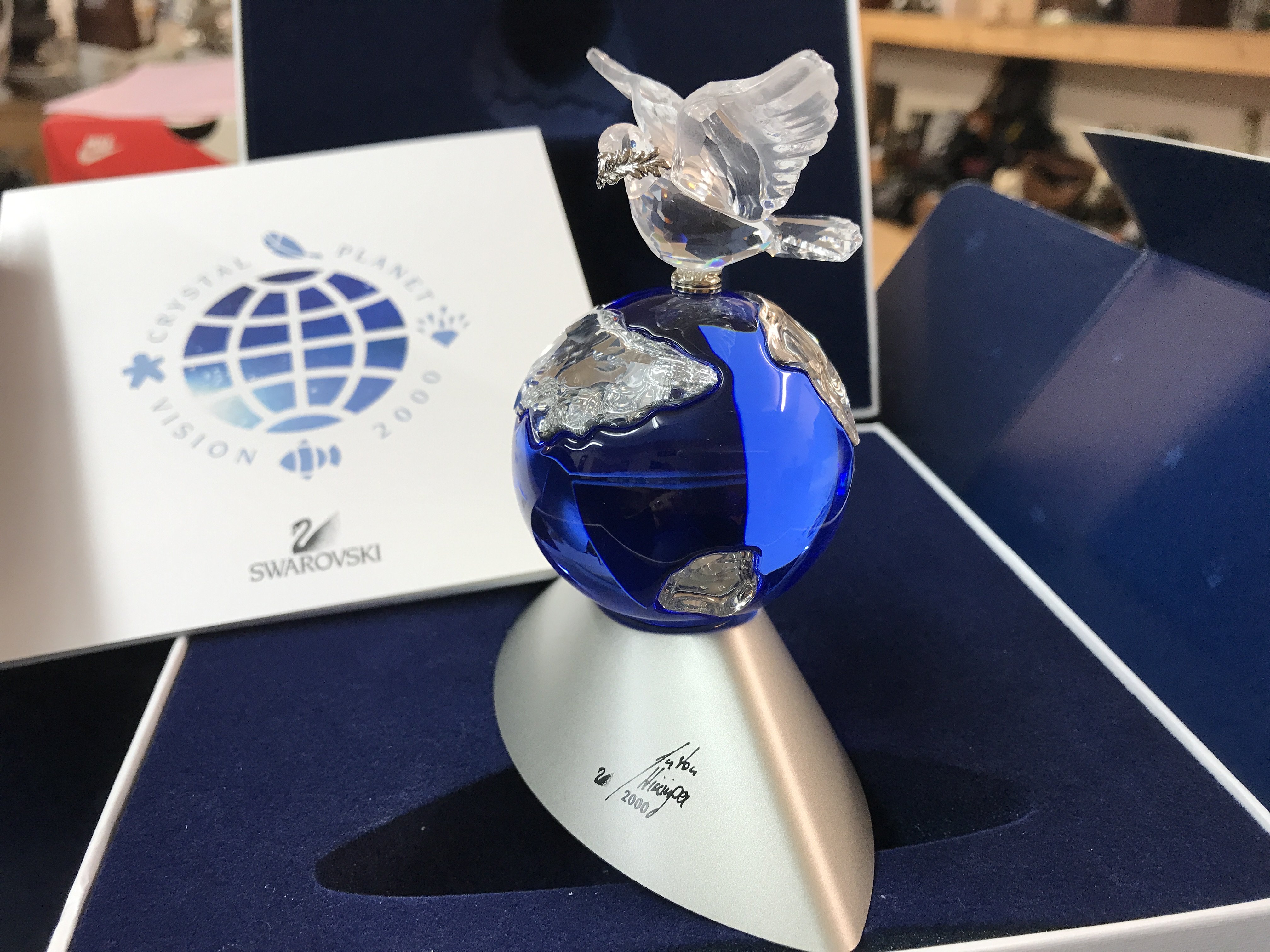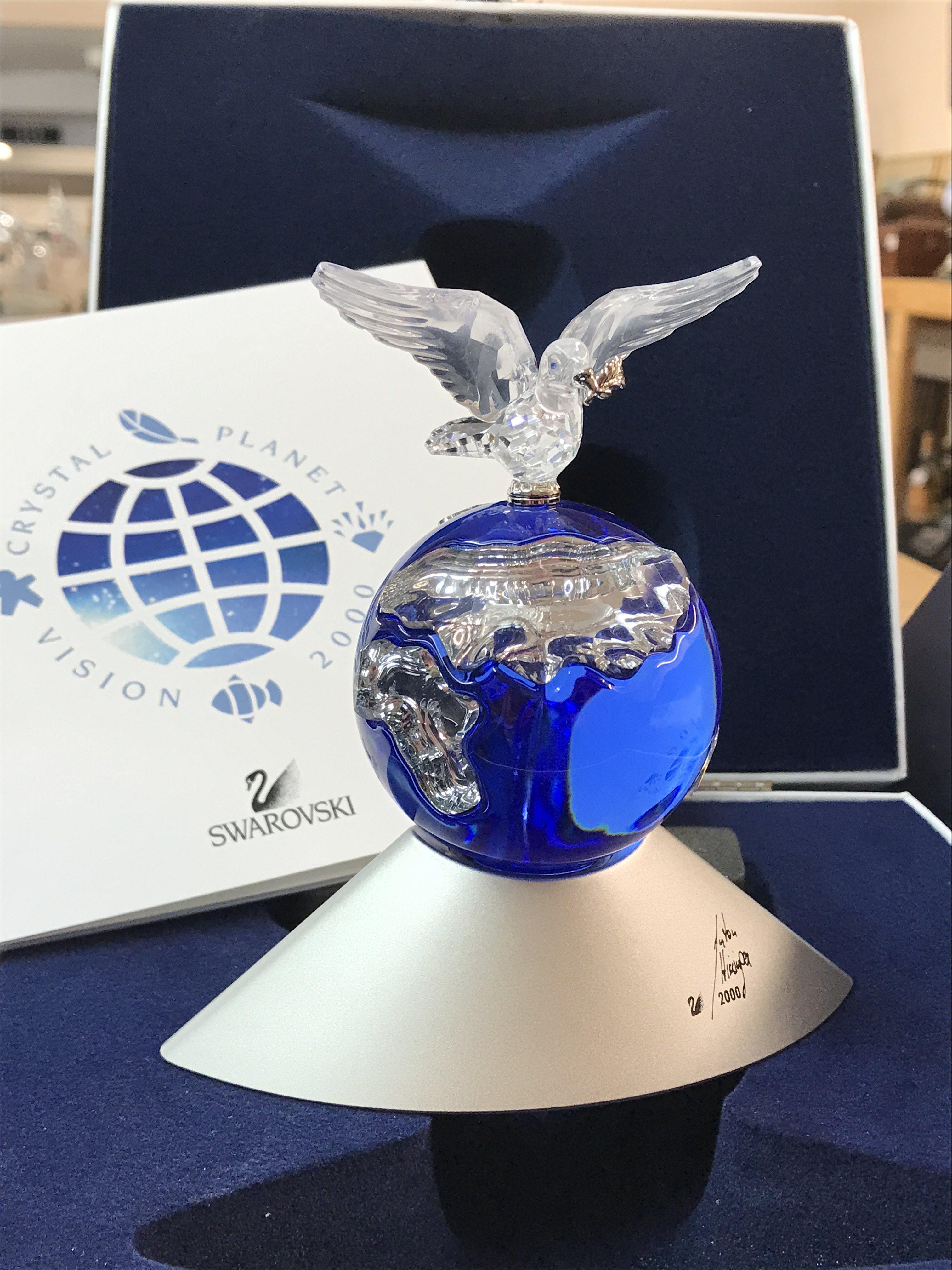 A boxed Swarovski Planet Vision 2000 figure of the globe surmounted by a Dove carrying an Olive Branch, with Certificate