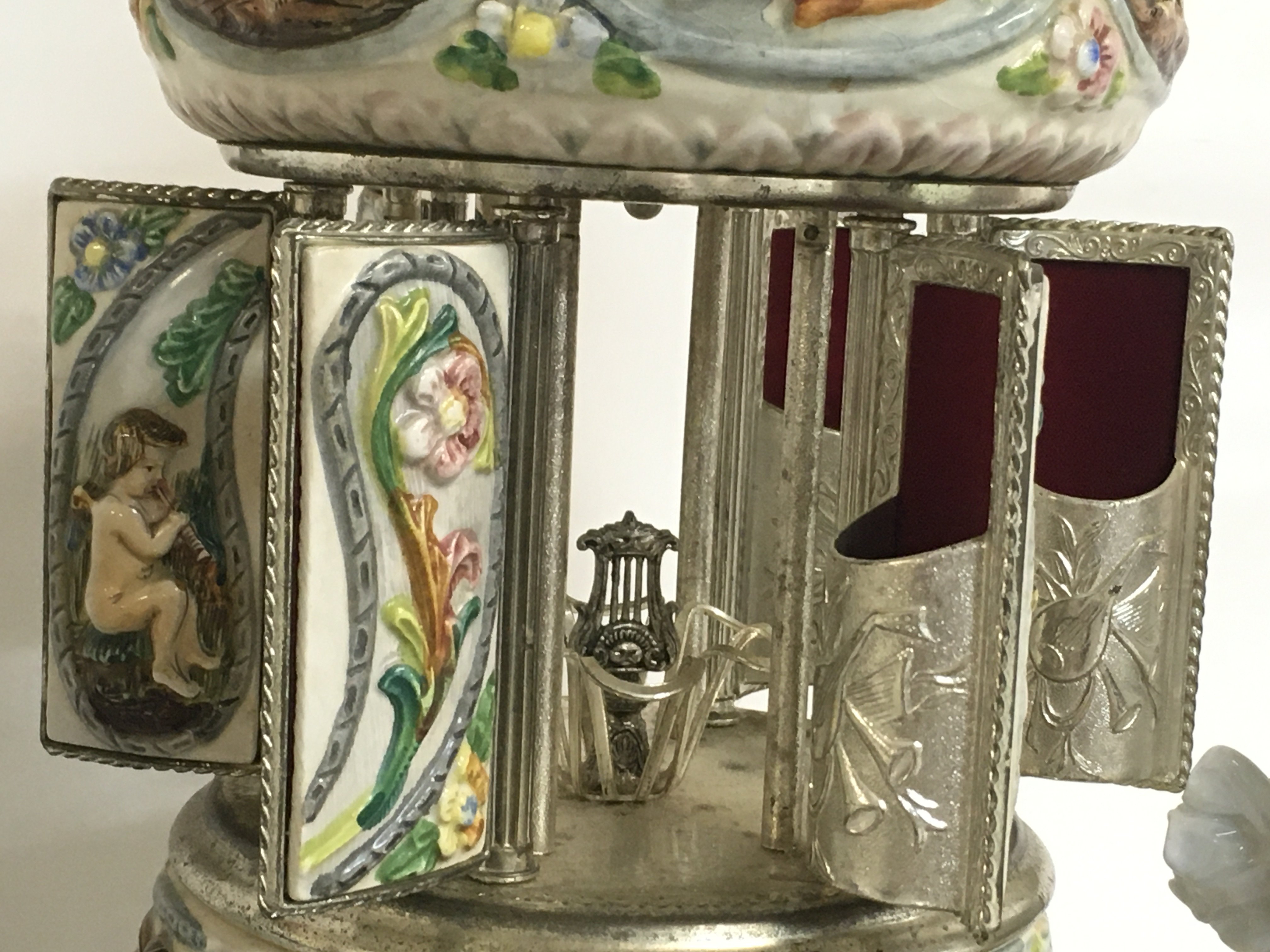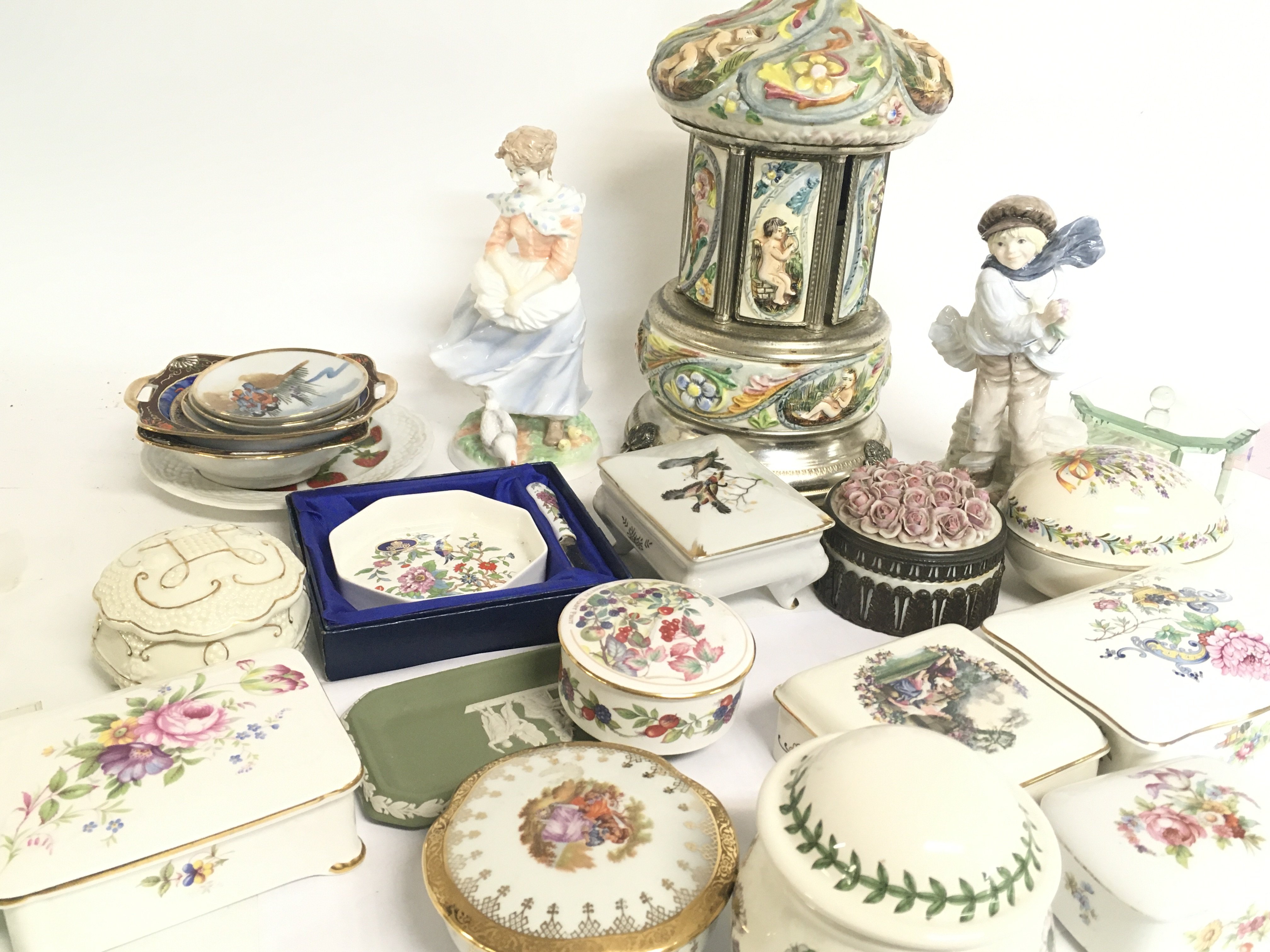 An Italian ceramic musical cigar holder, Old Country Ways Worcester figure, A Coalport figure and an assortment of Porcelain trinket boxes. This lot cannot be posted