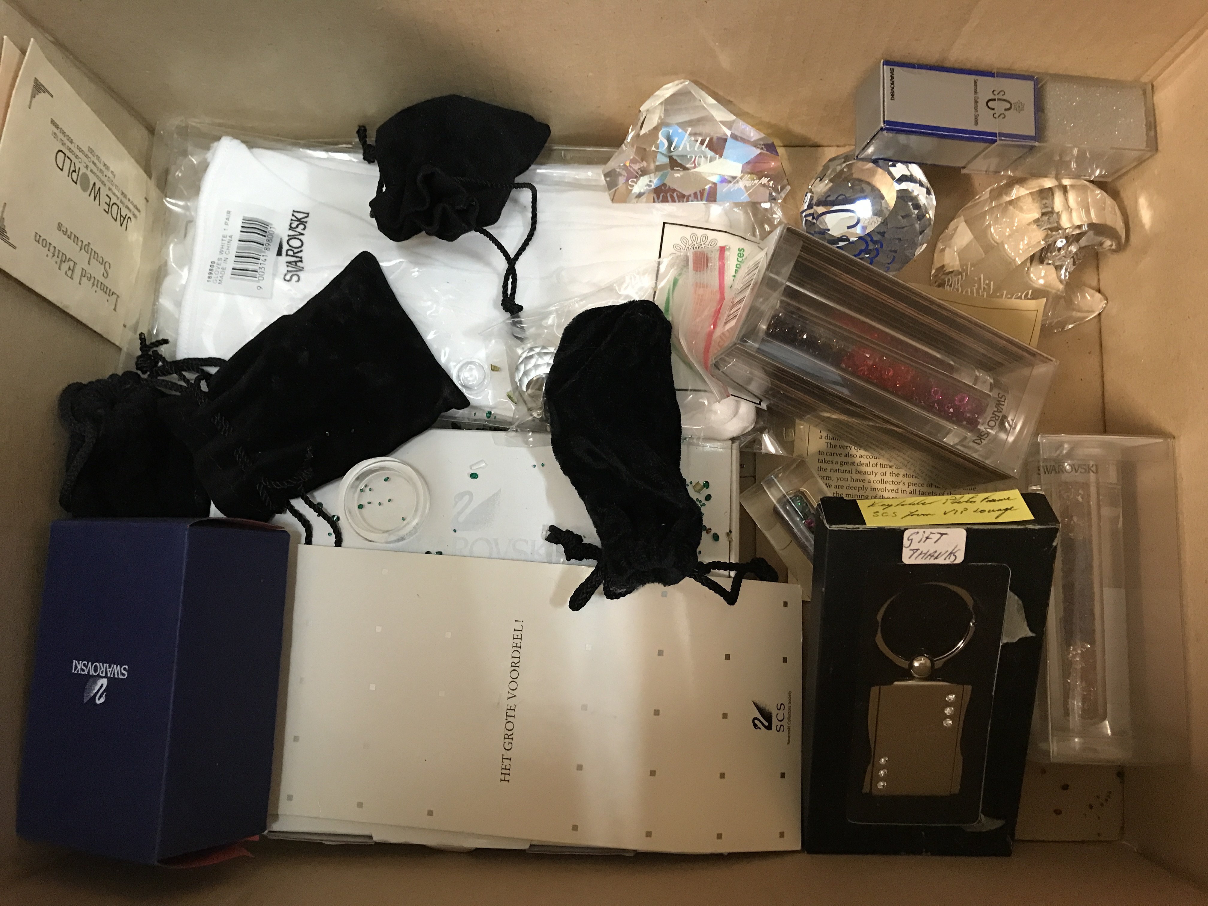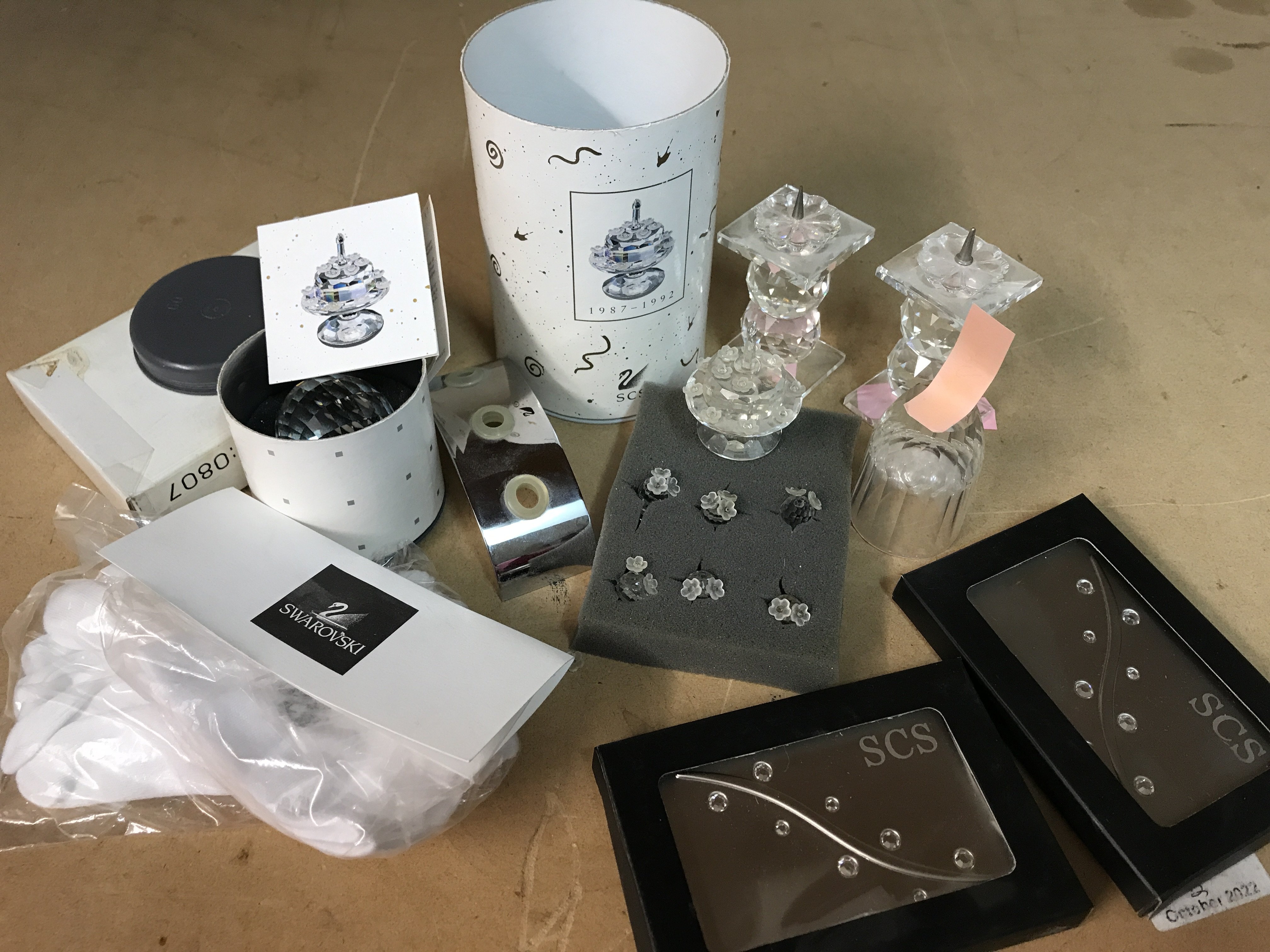 A mixed collection of Swarovski items including SCS commemorative paperweights, birthday cake, gloves etc