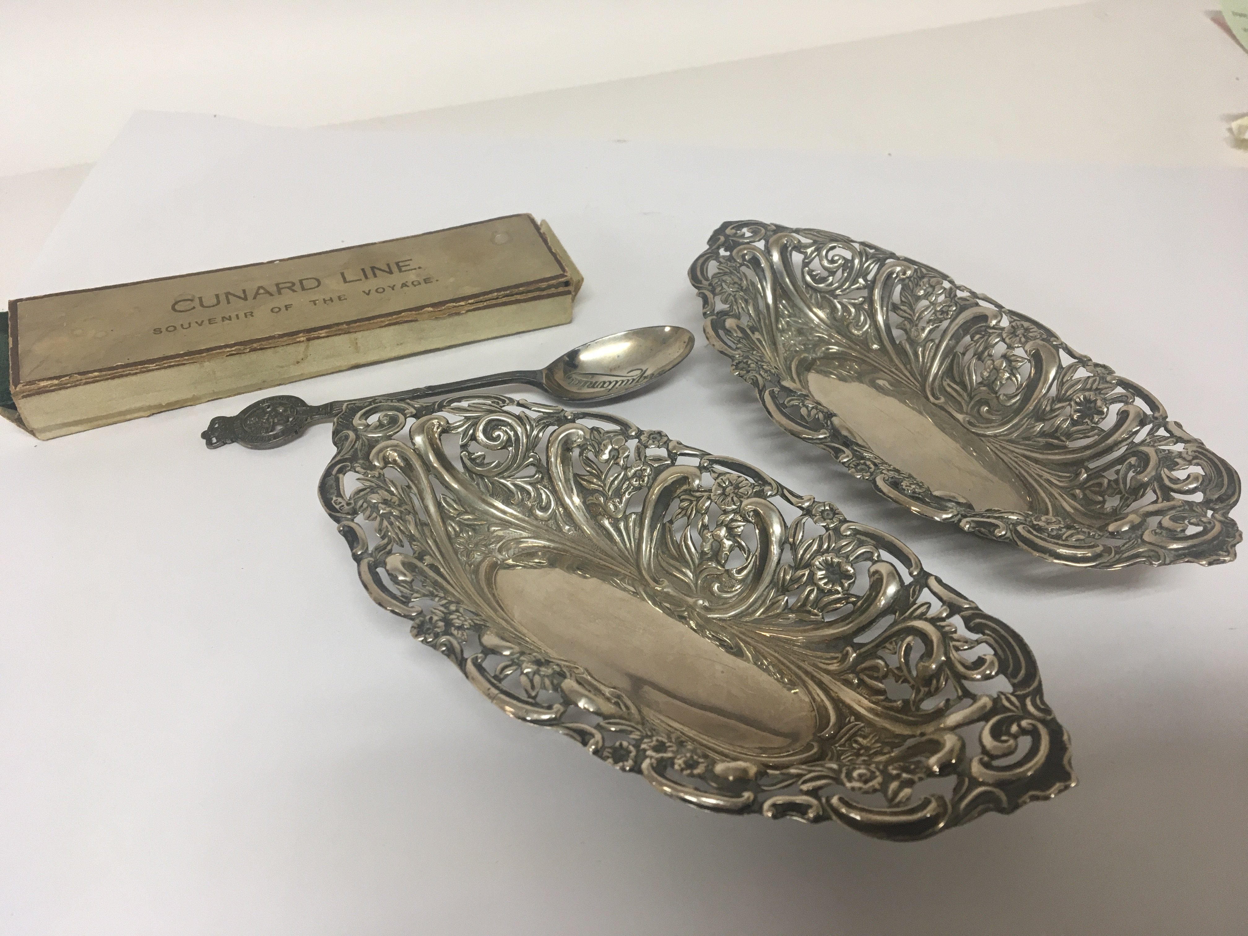 A pairvof silver dishes and a silver Cunard Aquitaina souvenir spoon (3)