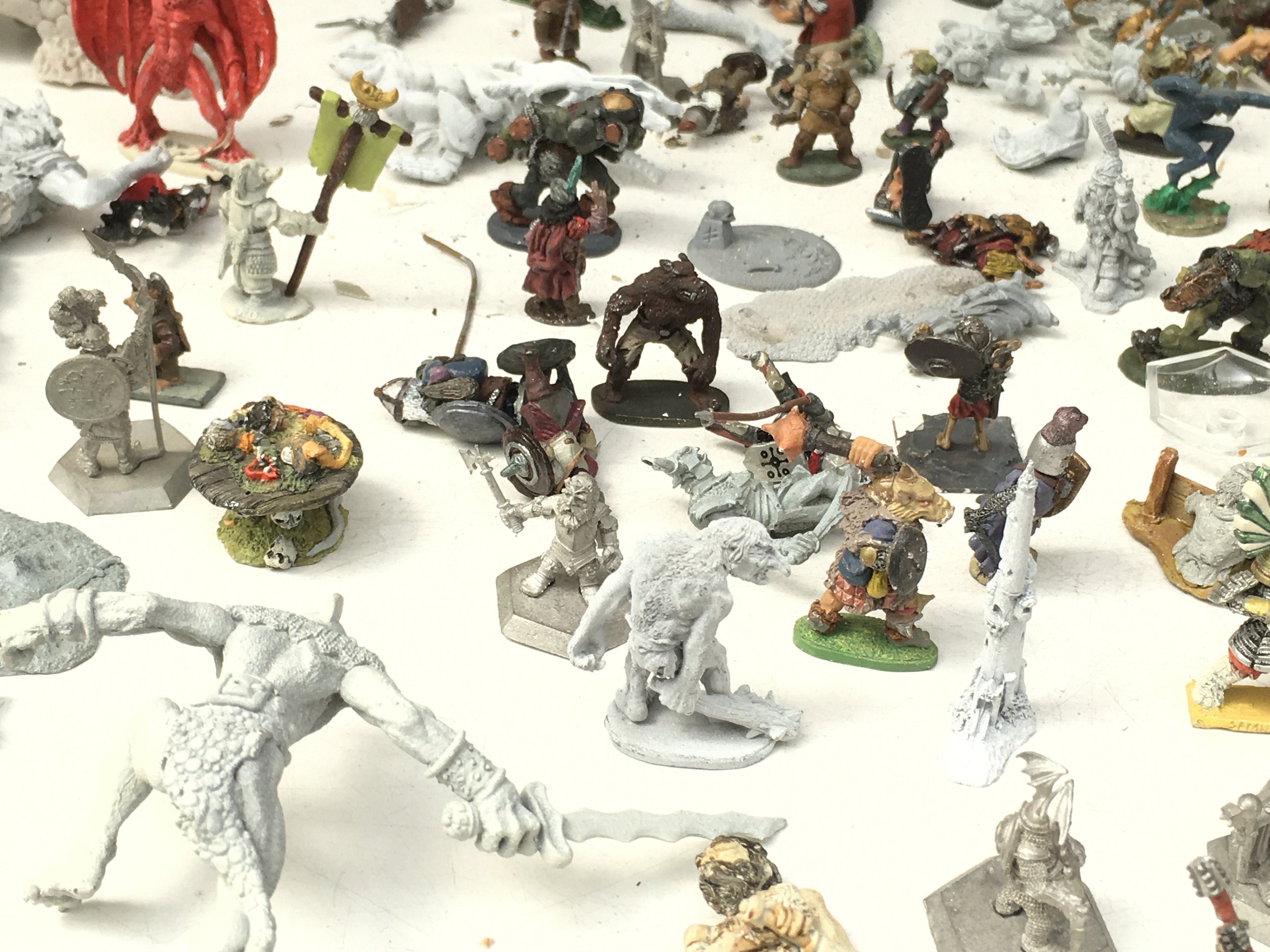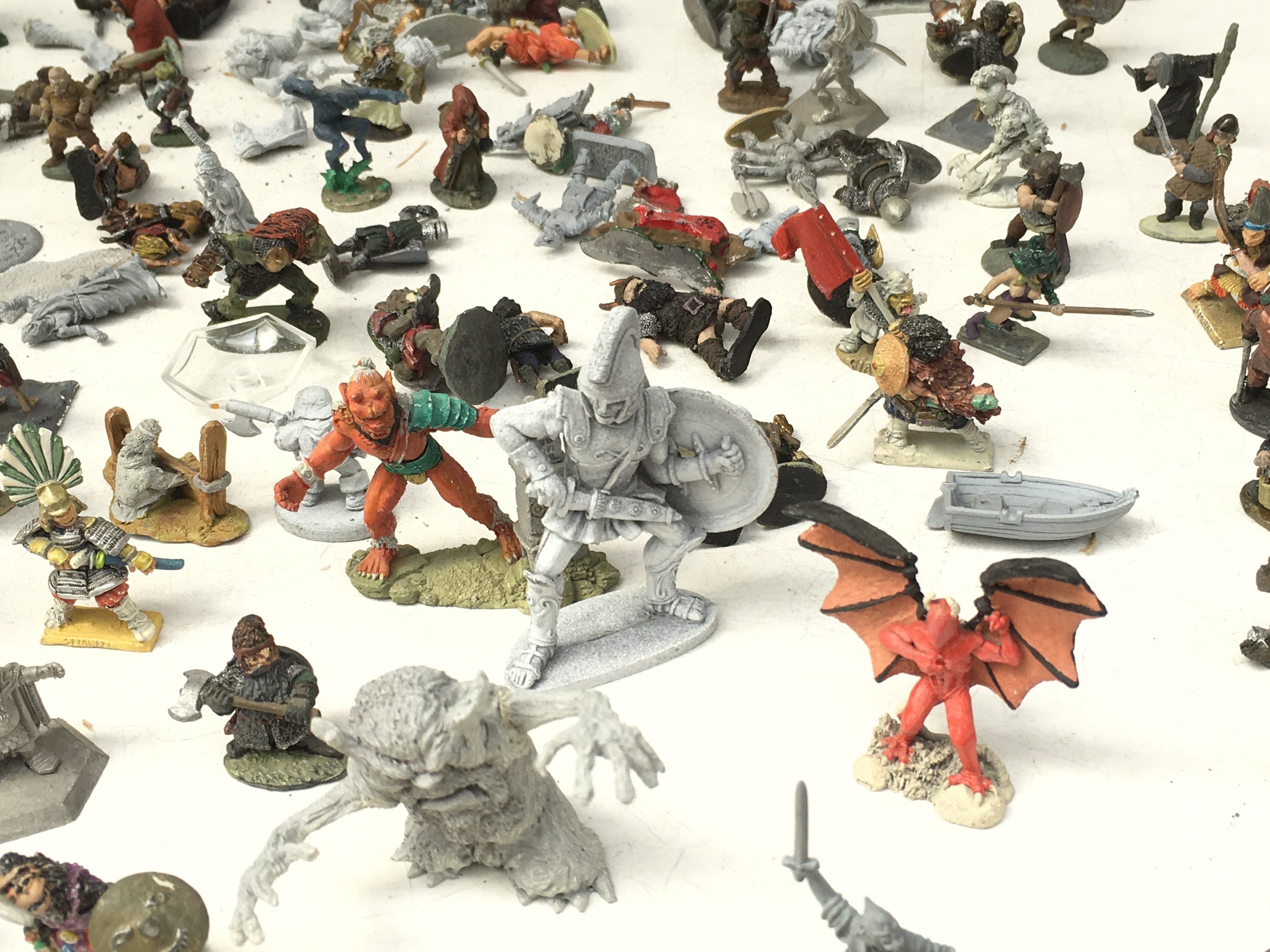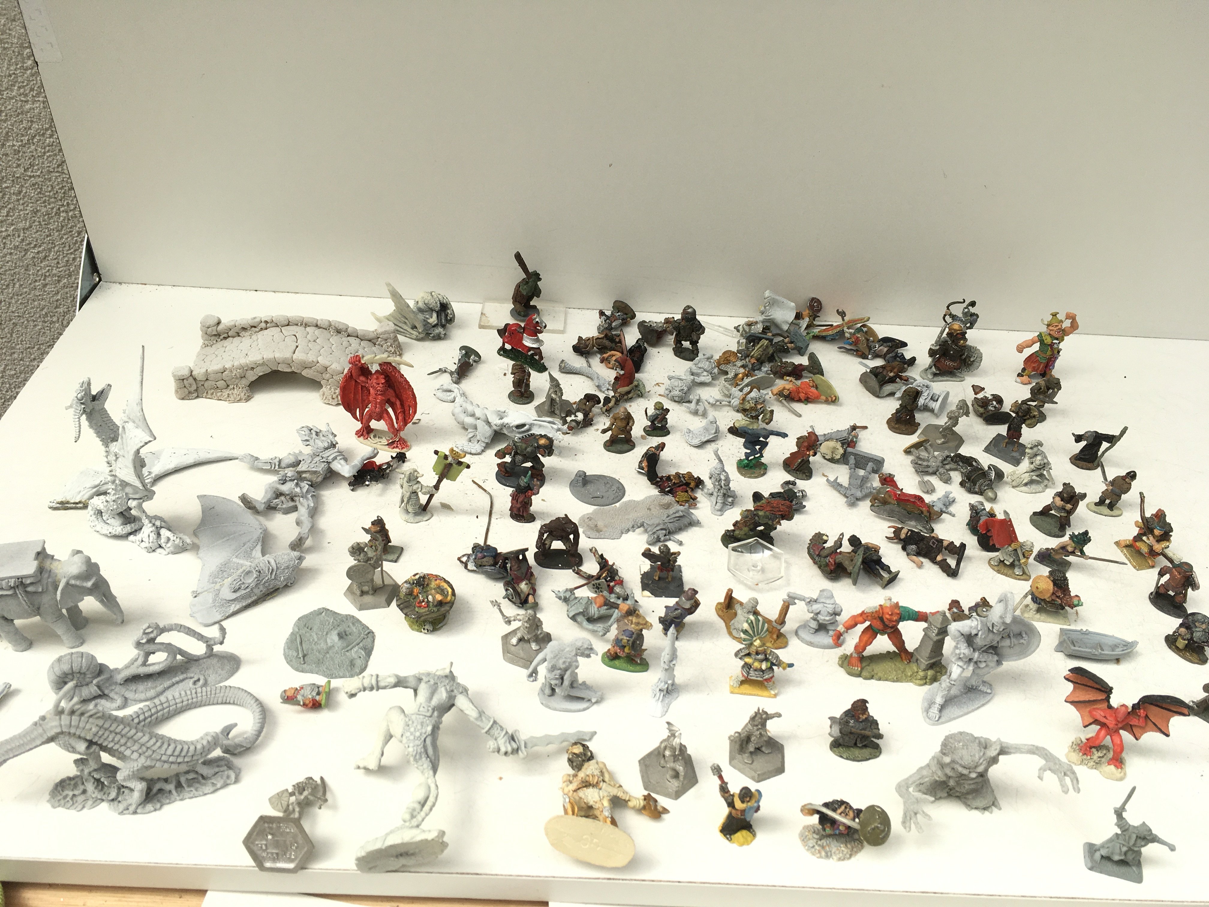 A box containing approximately 100 metal figures and accessories from a warhammer collection. Mostly painted. Made by Grenadier and others