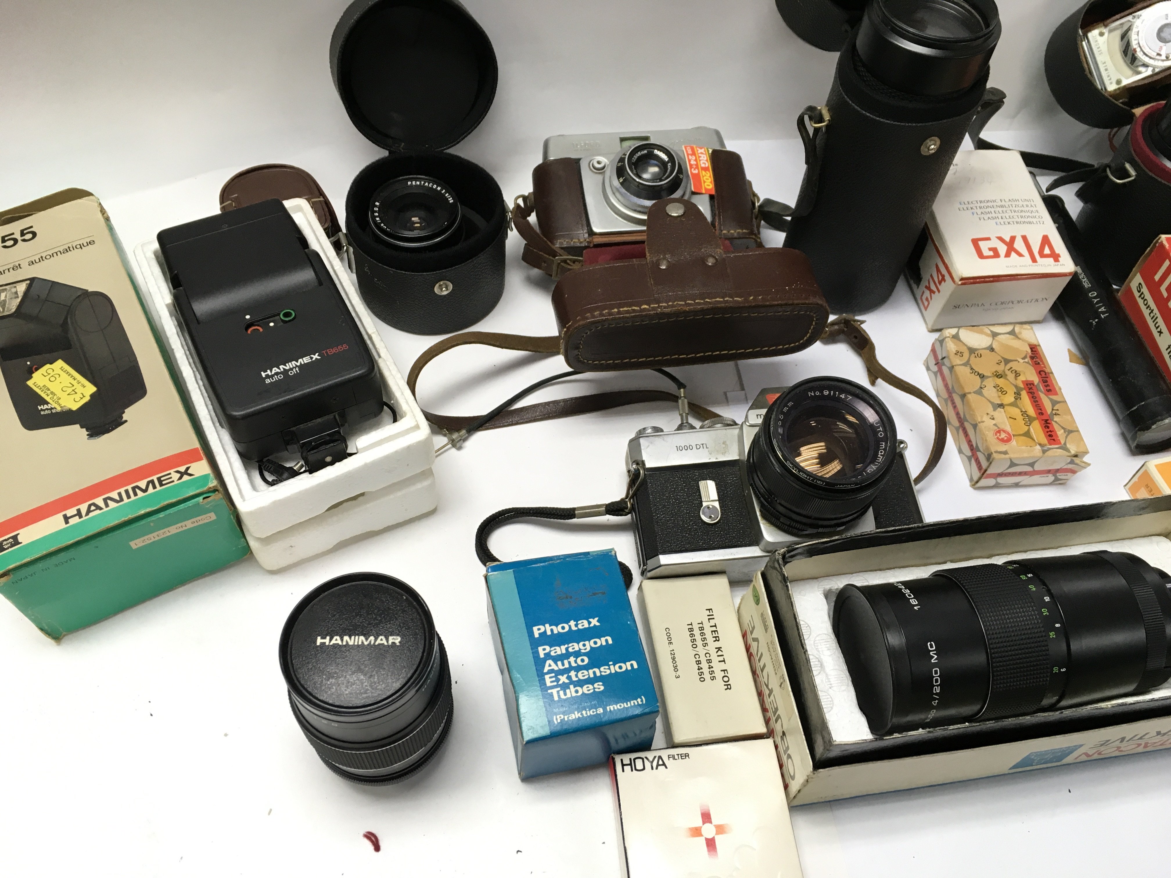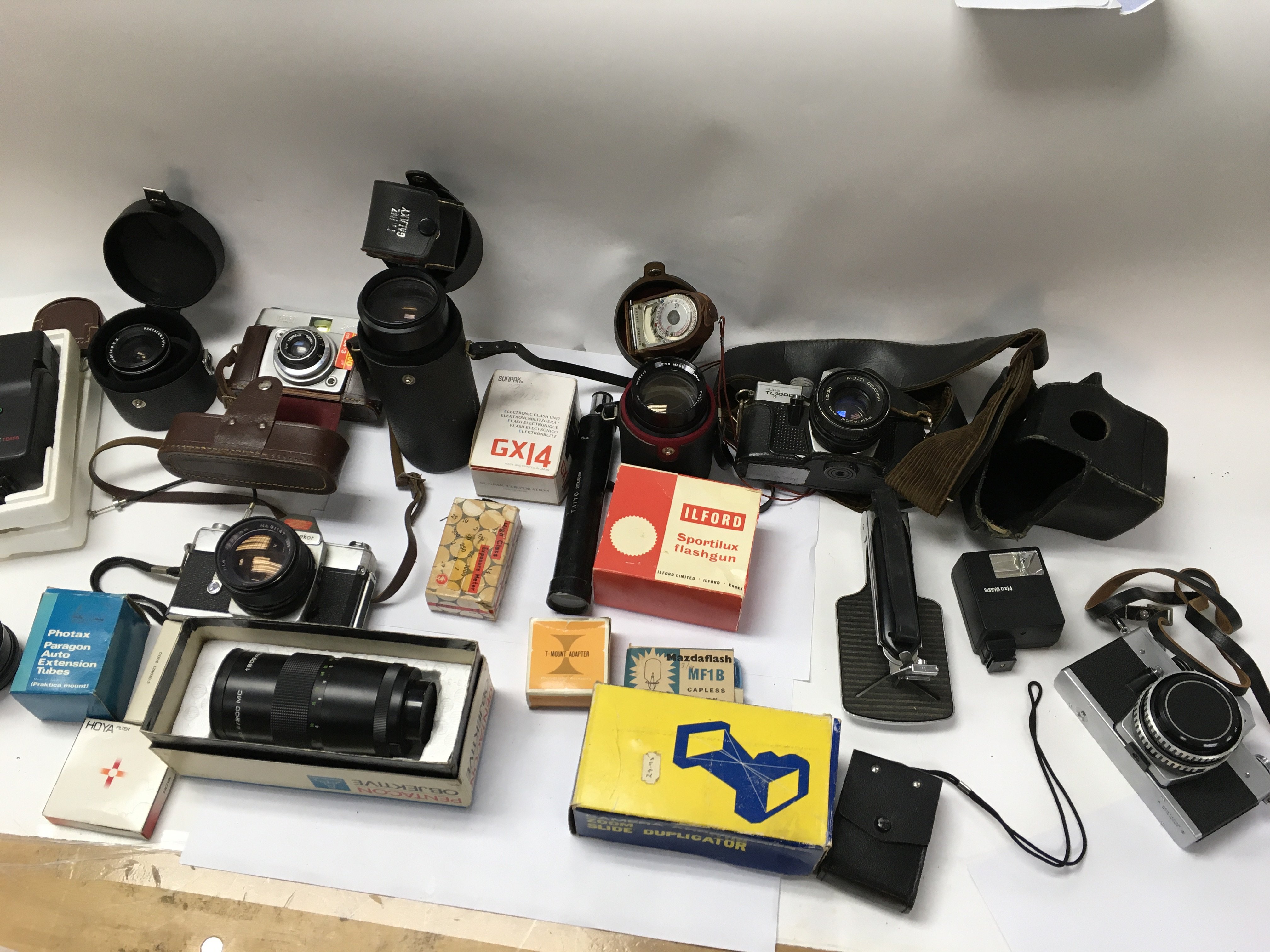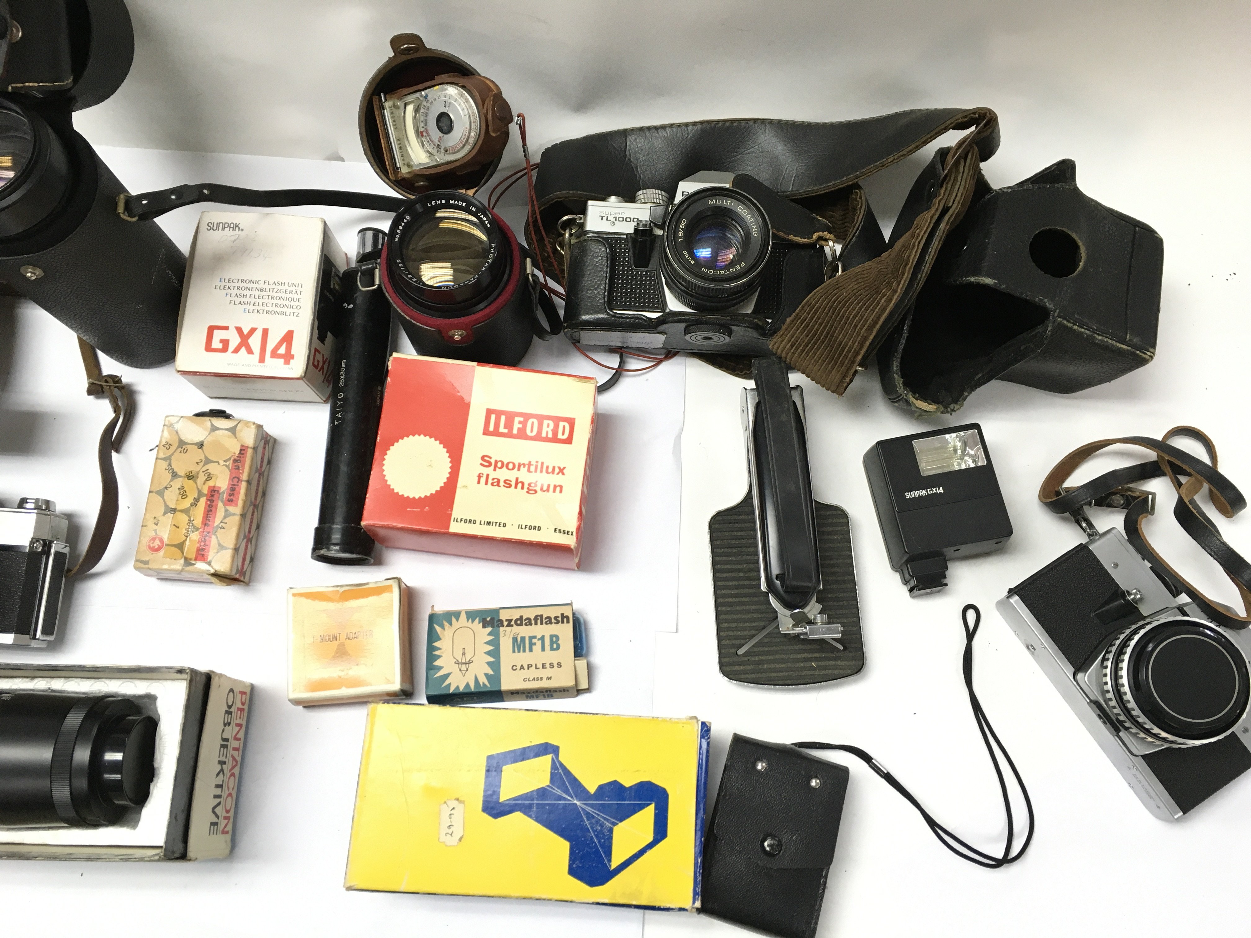 A collection of camera equipment including zoom lenses and other accessories.