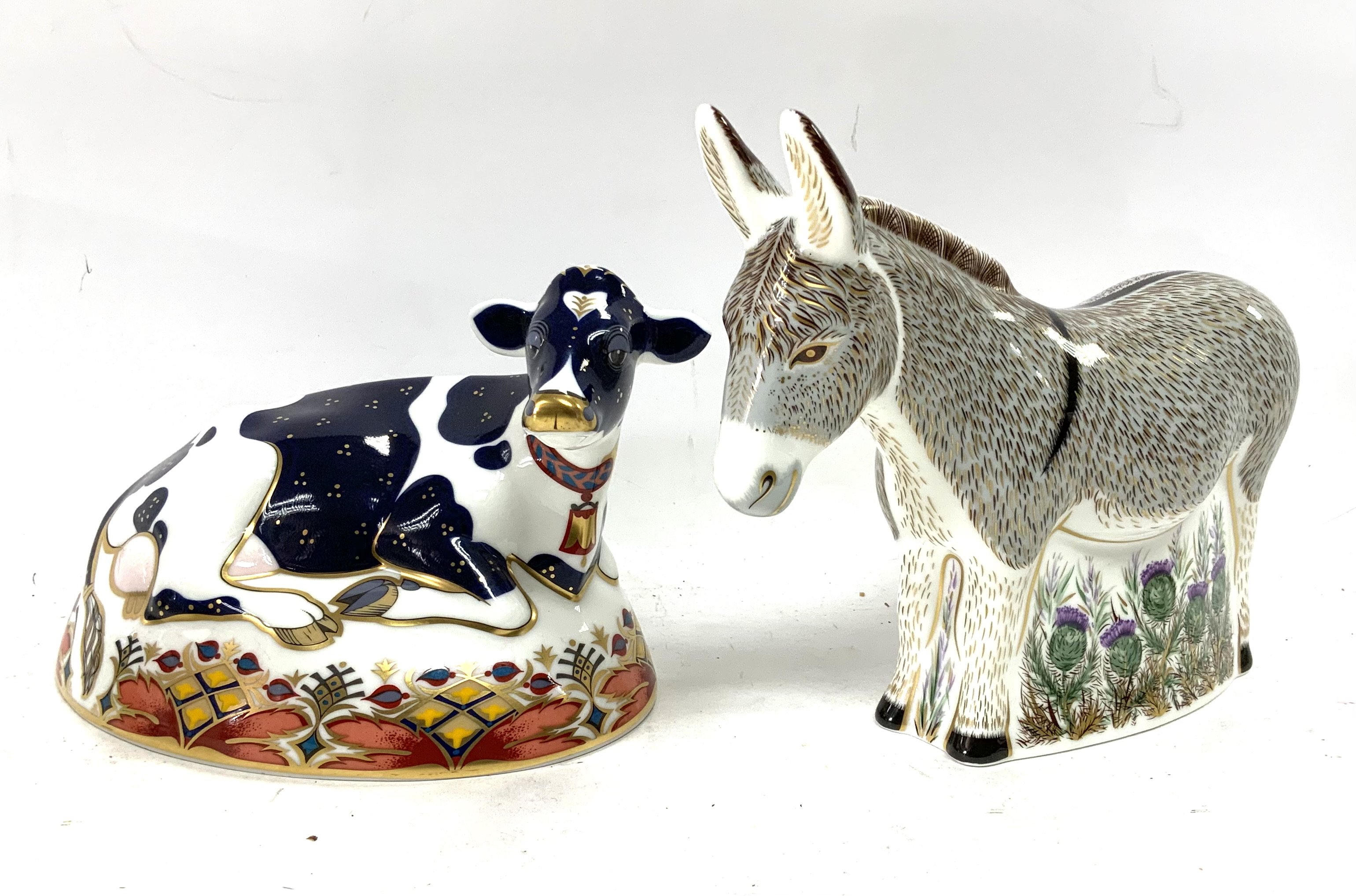 A Royal Crown Derby figure of a Donkey together with Royal Crown Derby Frisian Cow, Buttercup. (Postage Catagory D, not avaliable in house).