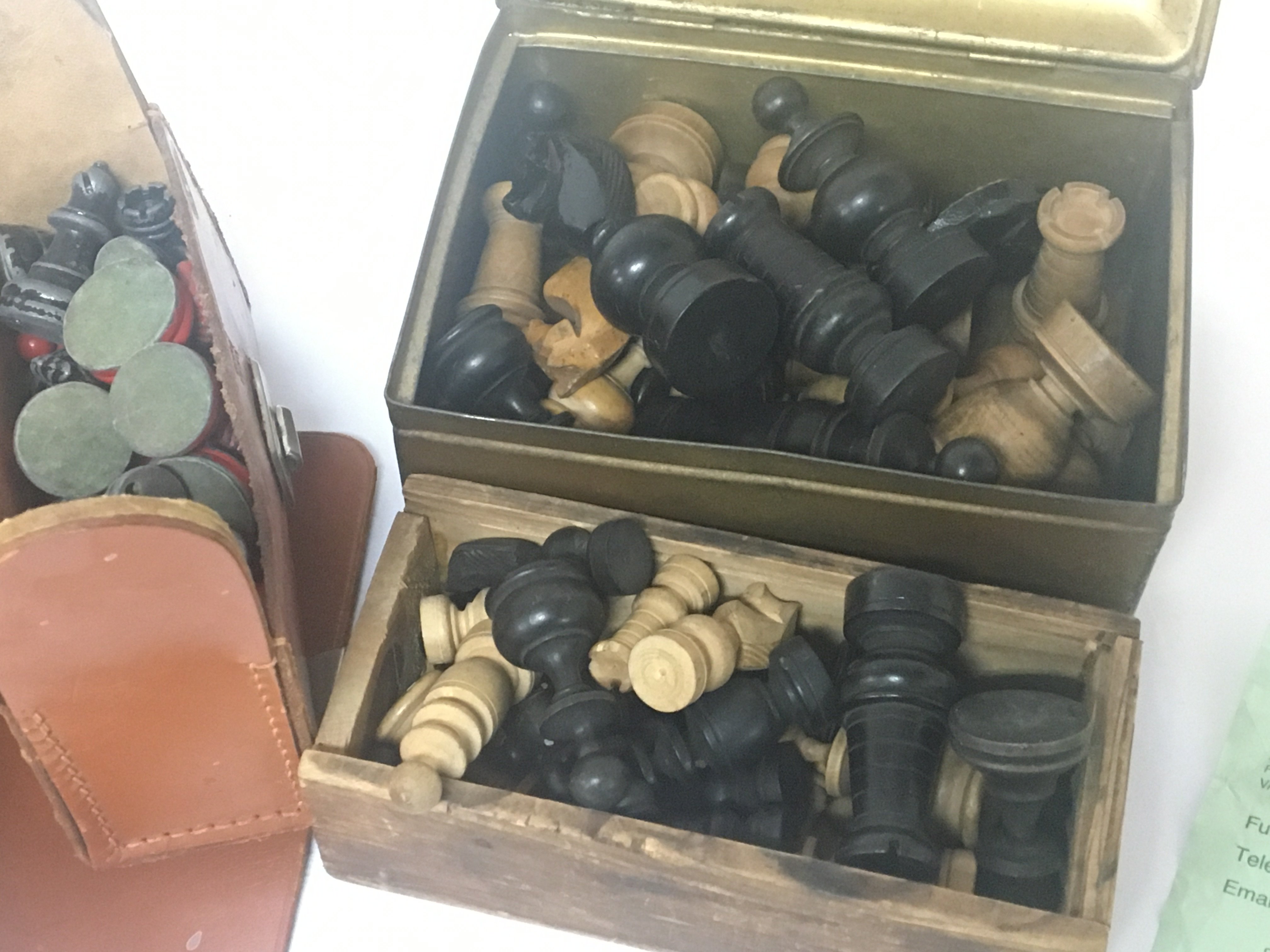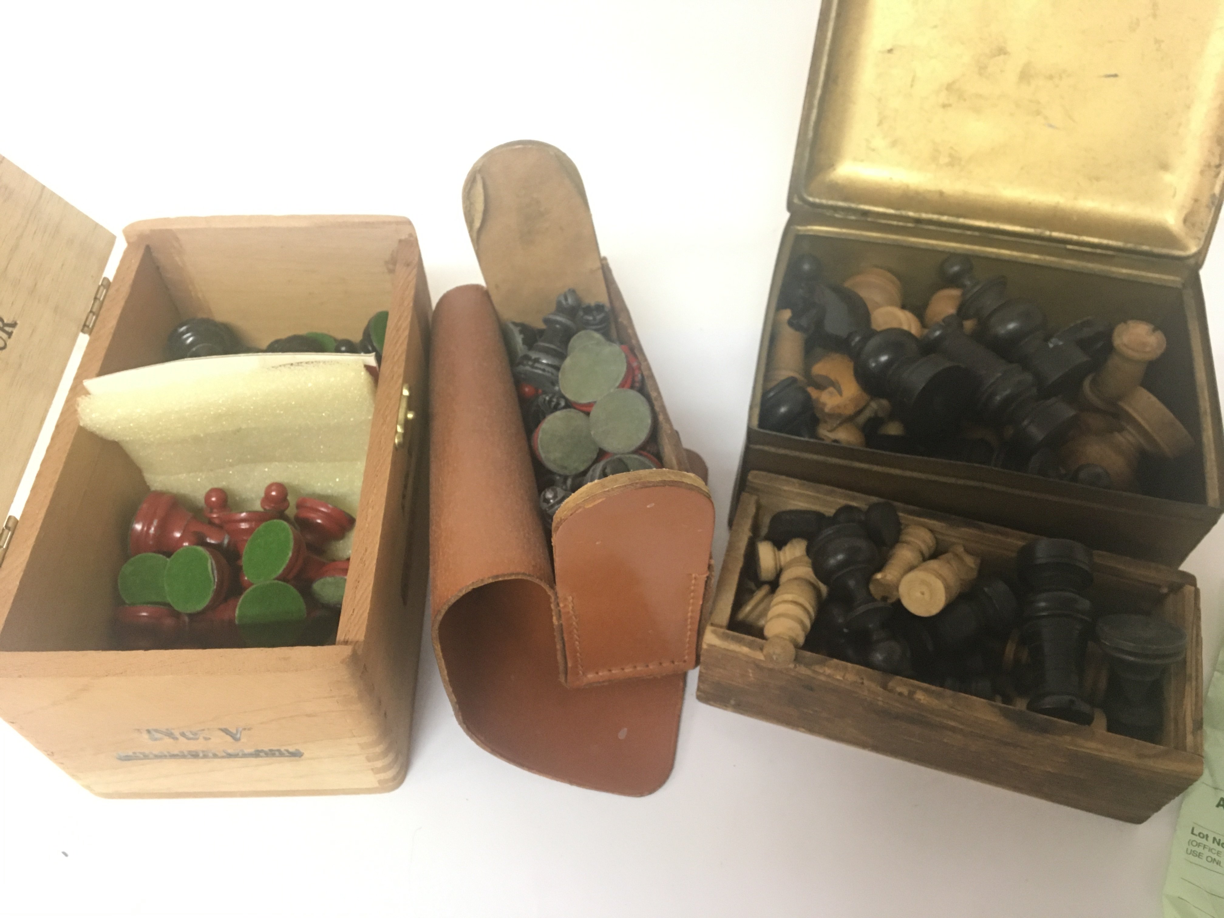 A collection of turned wood chess pieces and painted metal chess pieces.