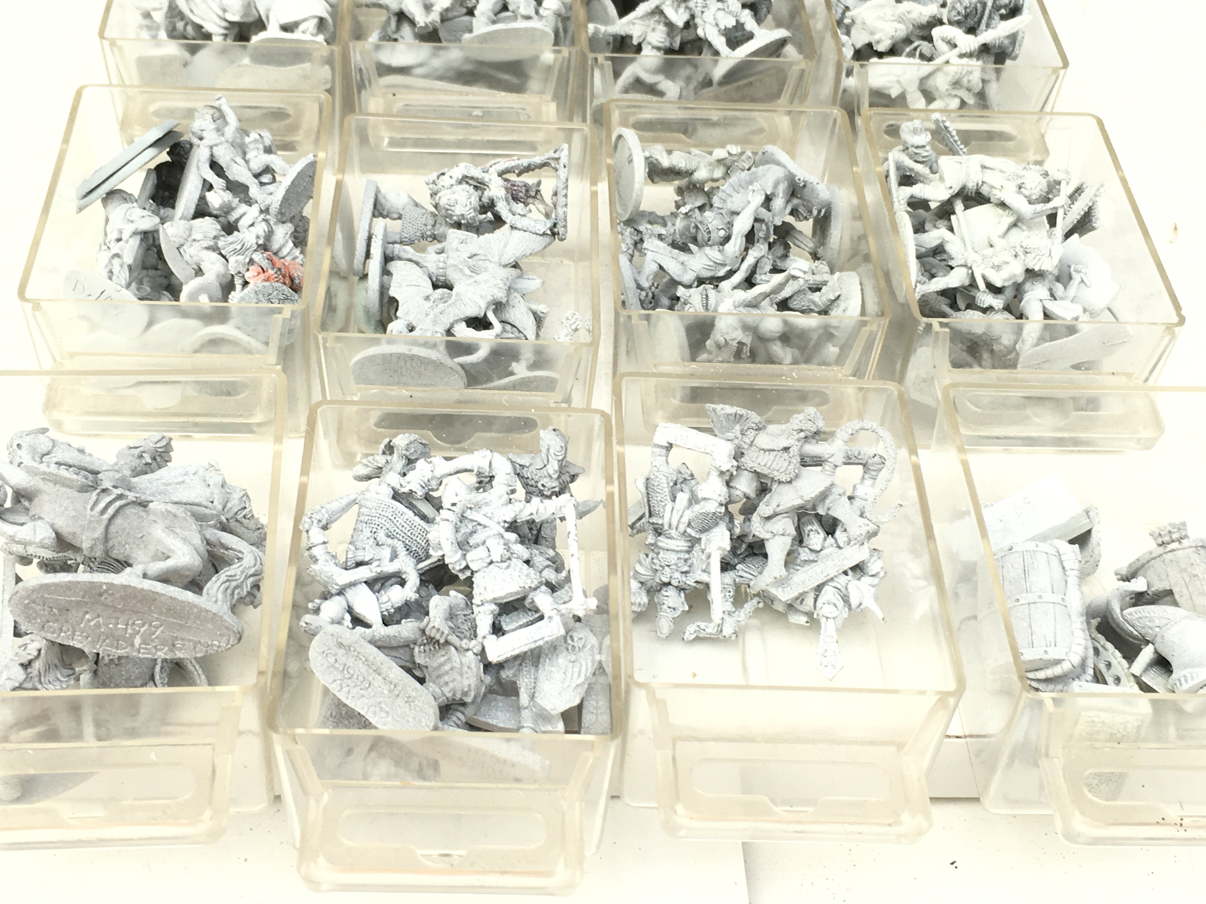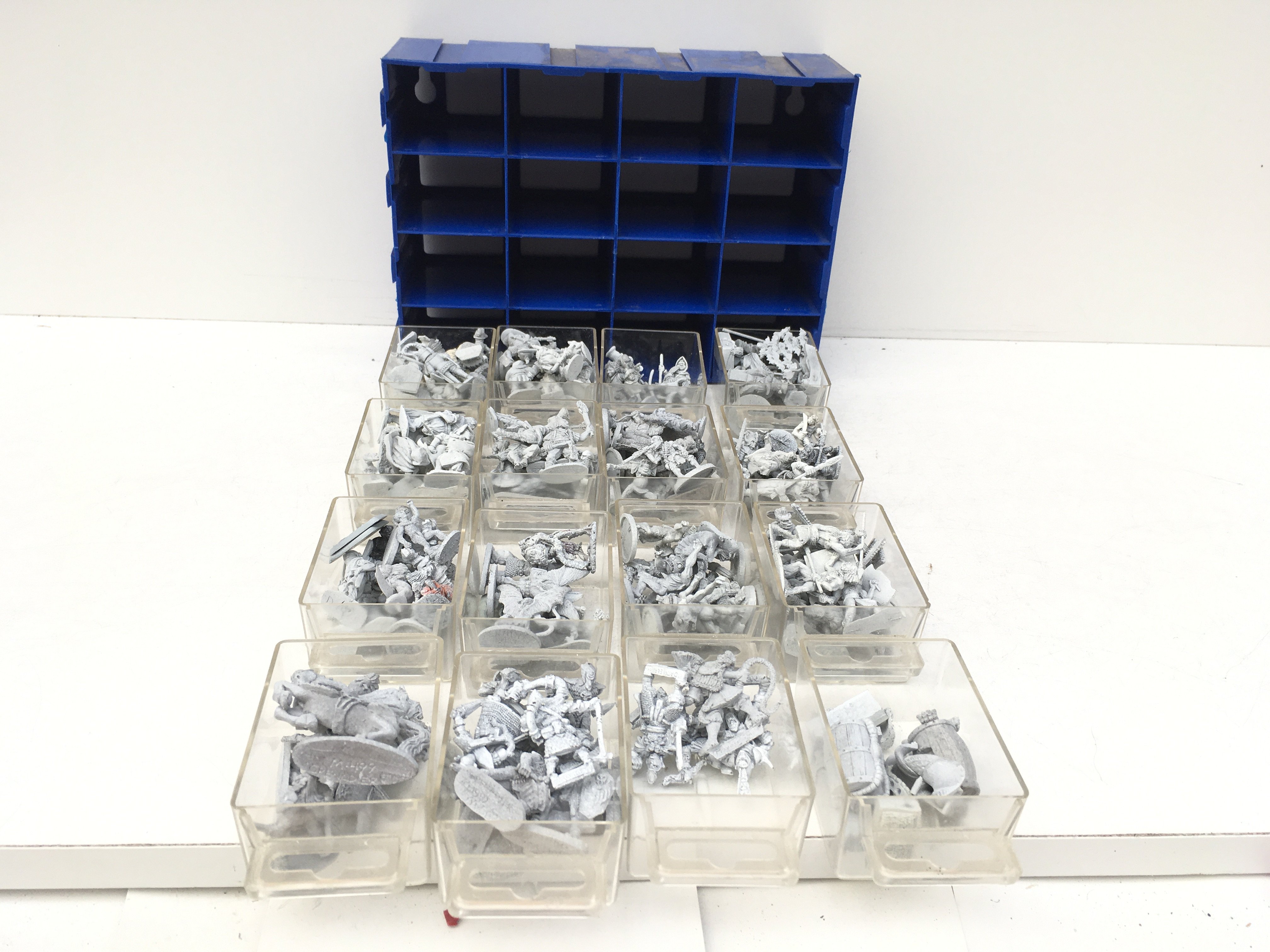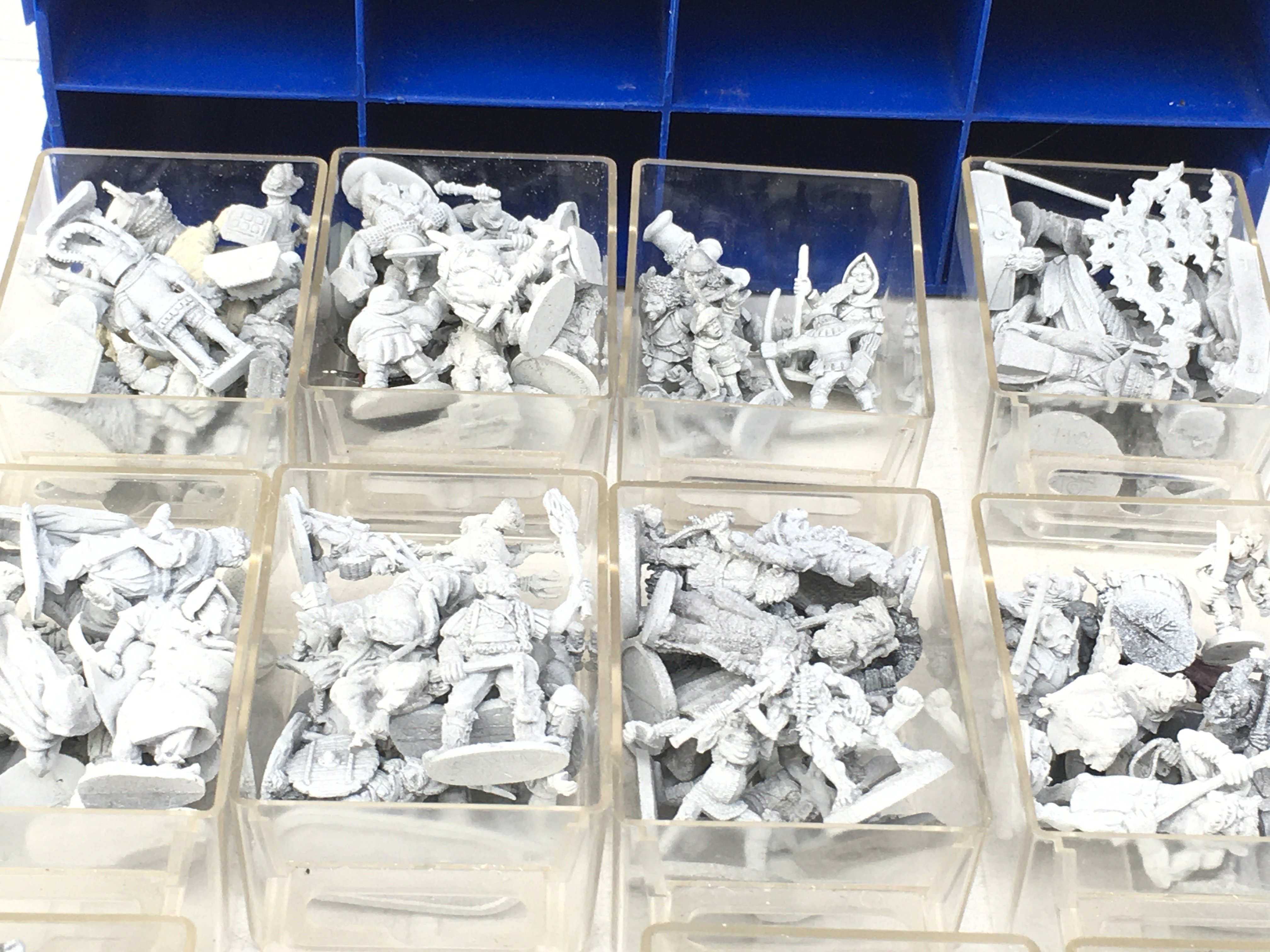 A 12 drawer storage unit containing metal model figures from a warhammer collection. Unpainted. Made by Grenadier and others.
