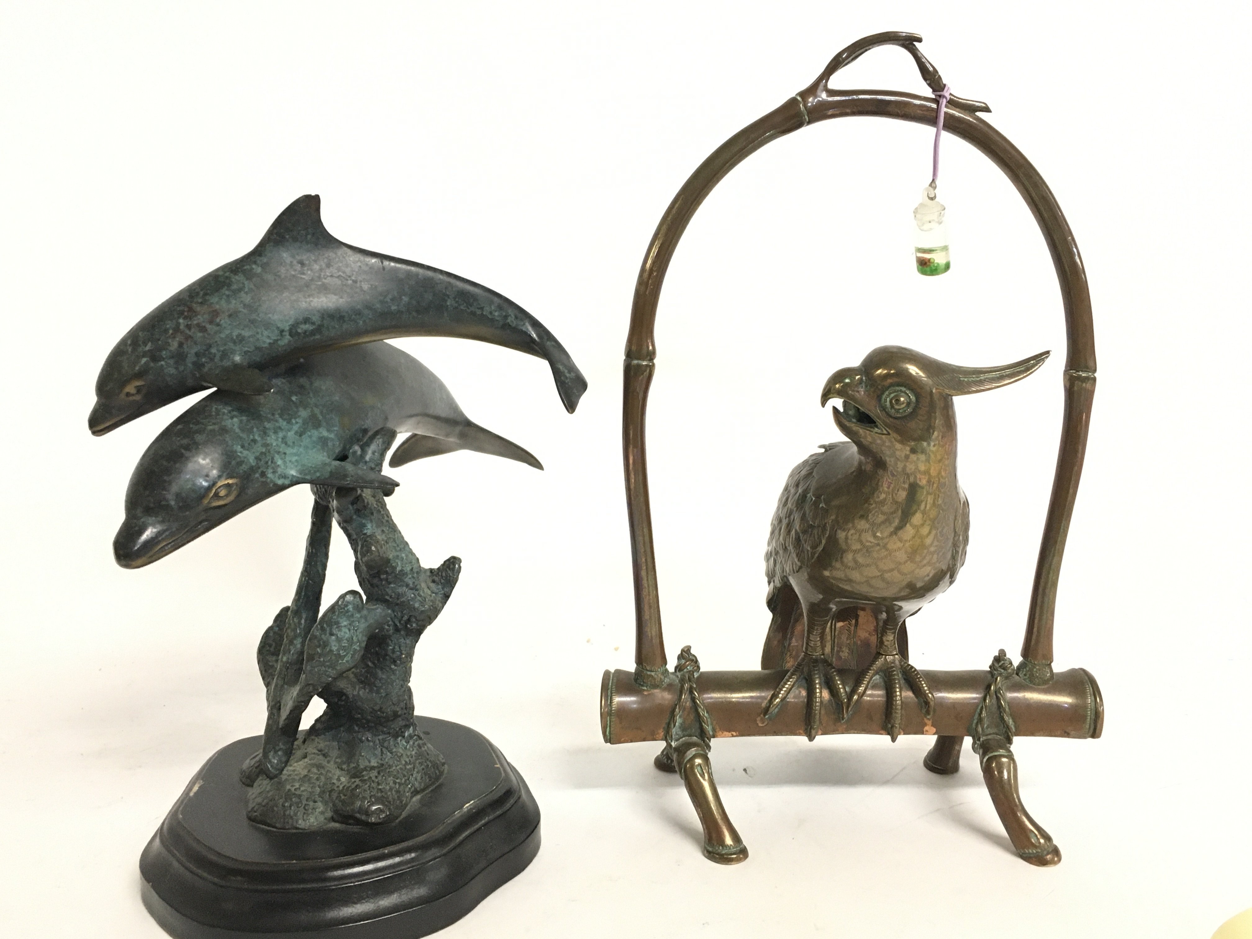A copper parrot figure and a bronze dolphin figure group. Postage catC