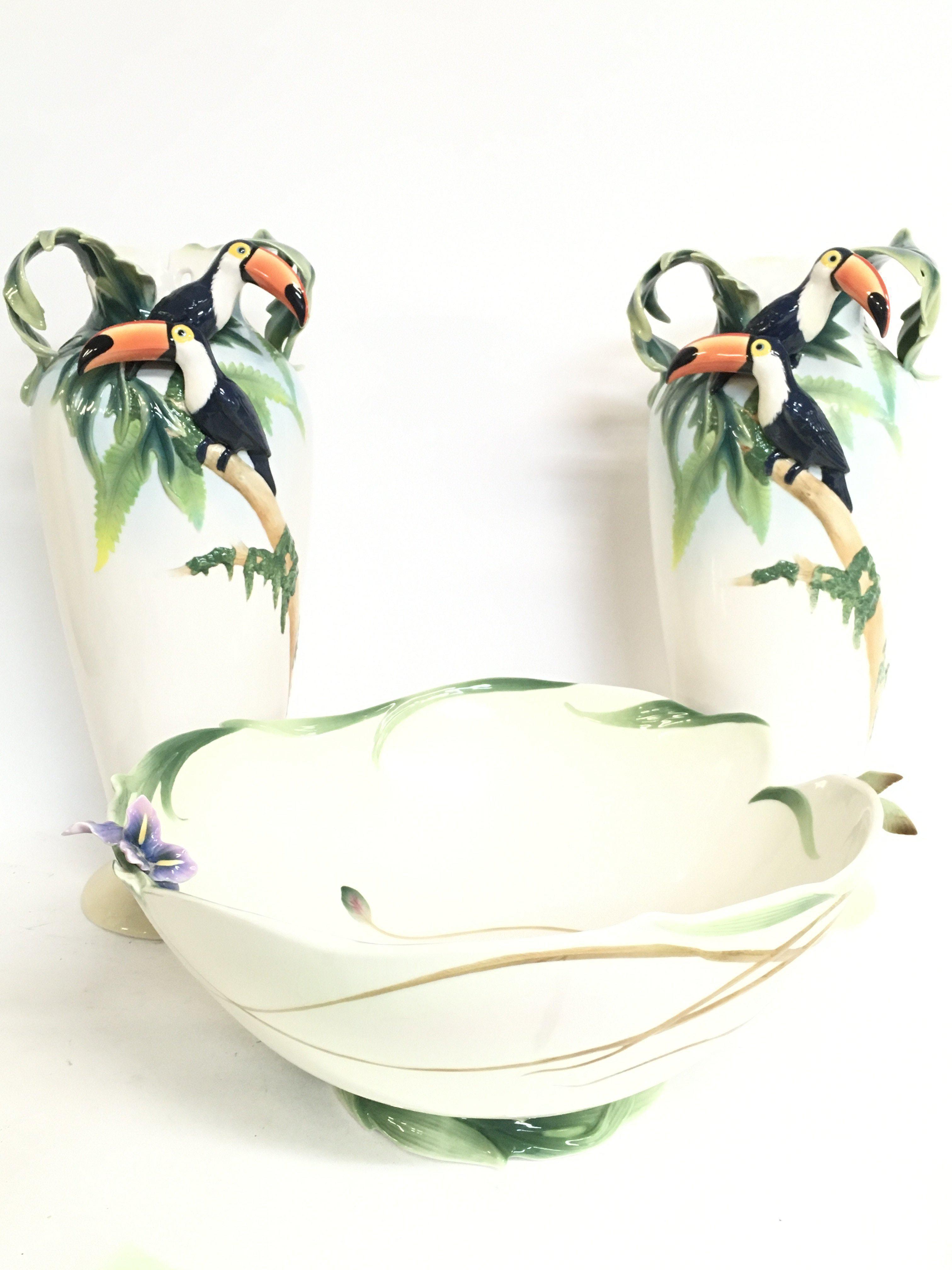 Two large Franz porcelain Toucan vases (42cm tall) and a floral design Franz Hummingbird bowl (35cm in diameter) , this lot cannot be posted