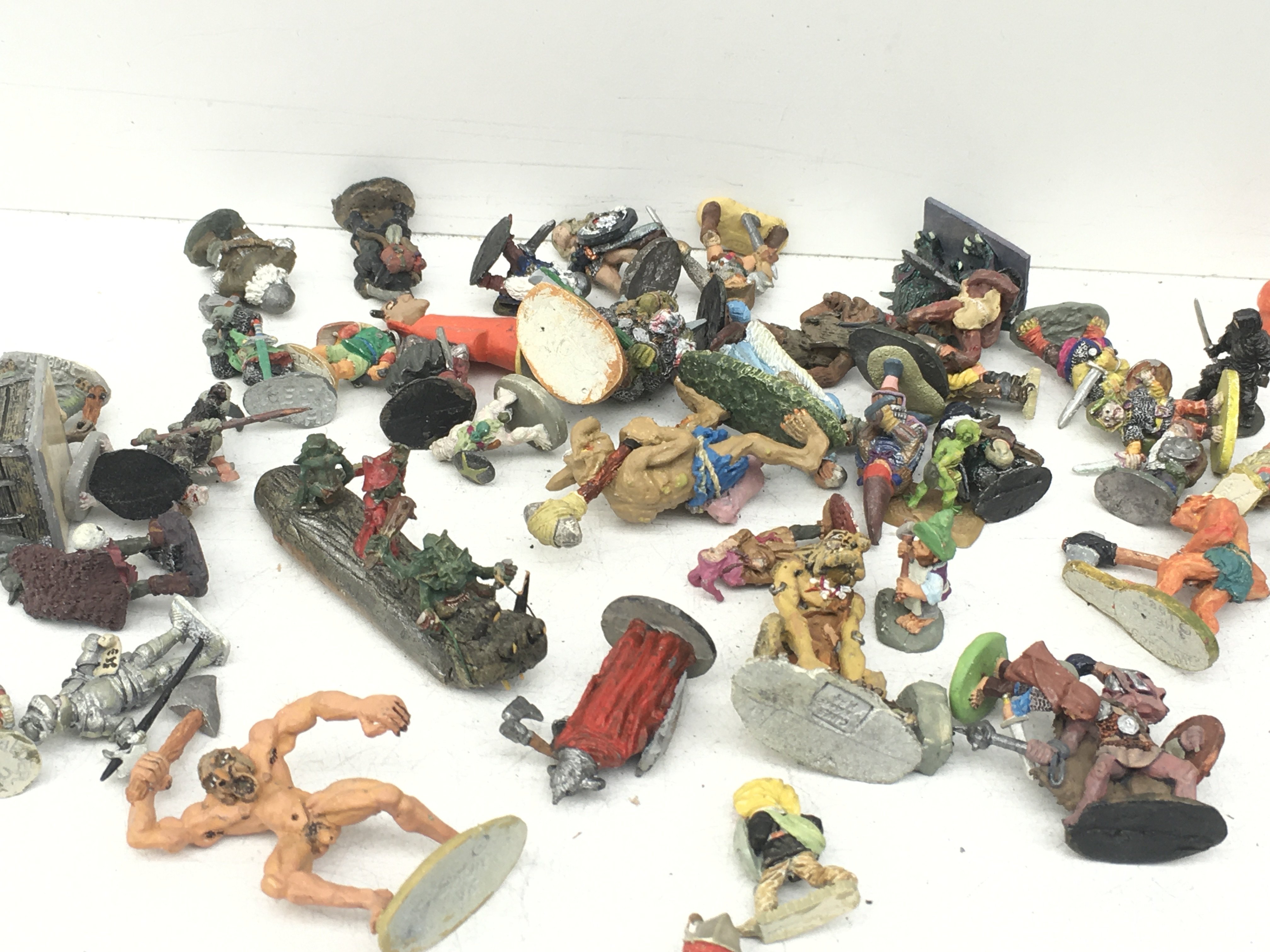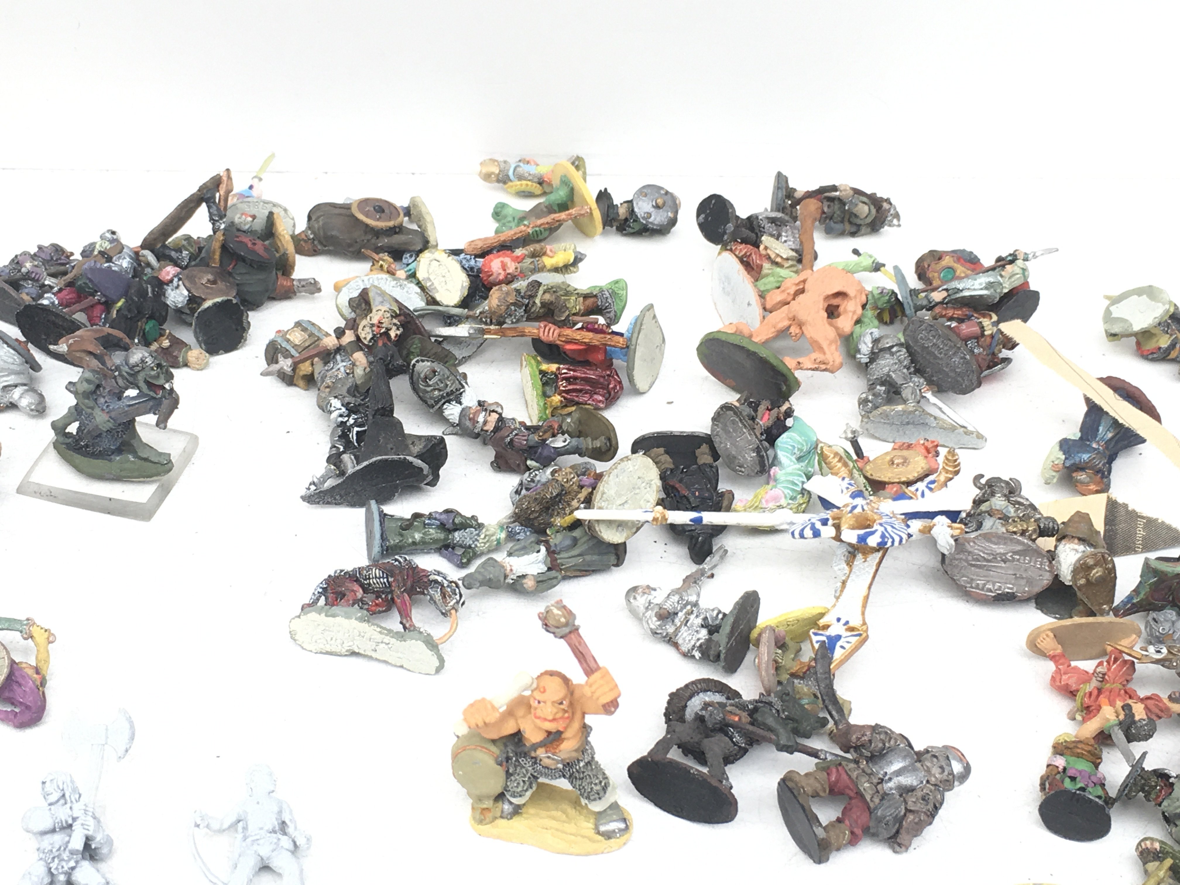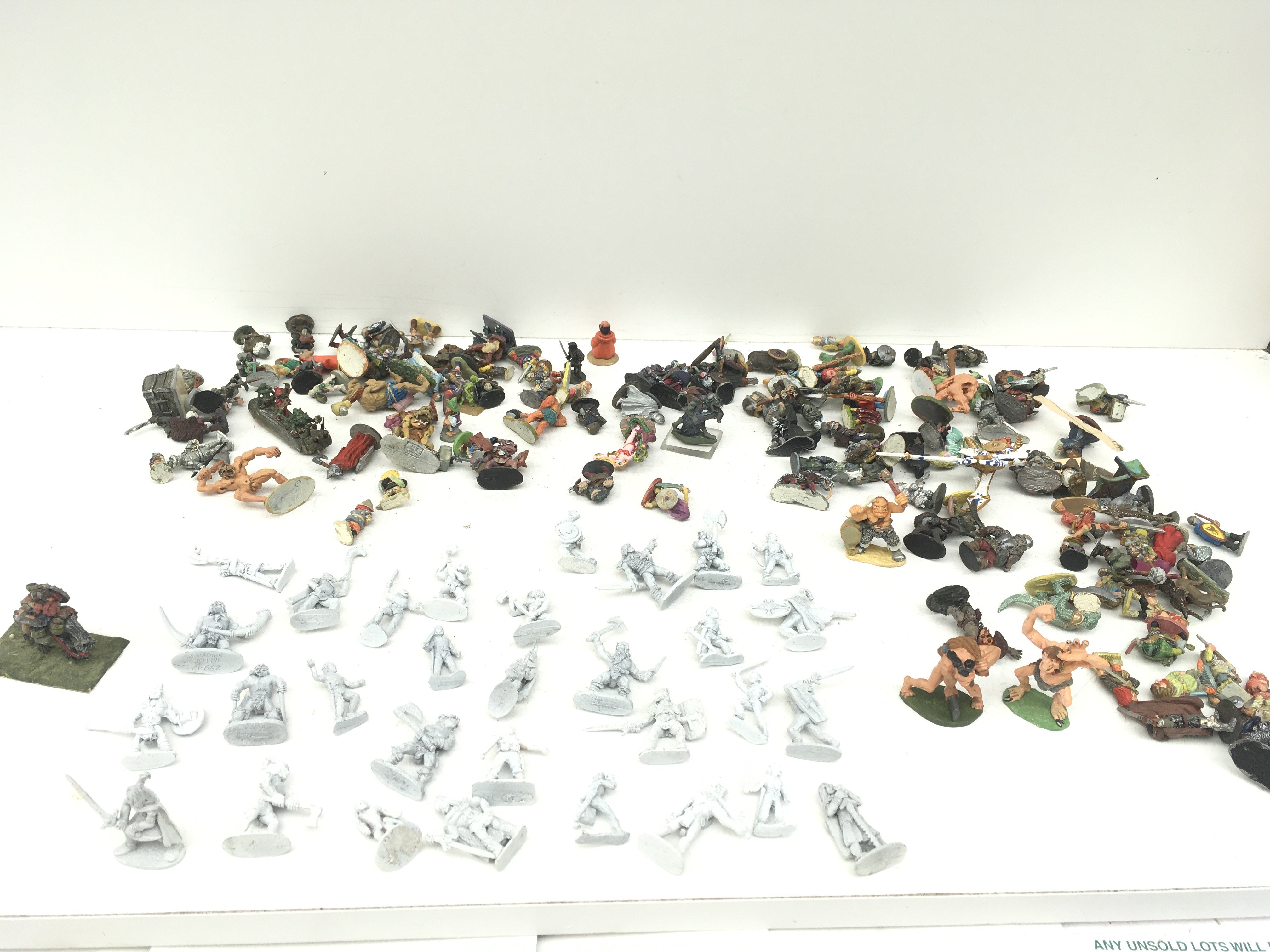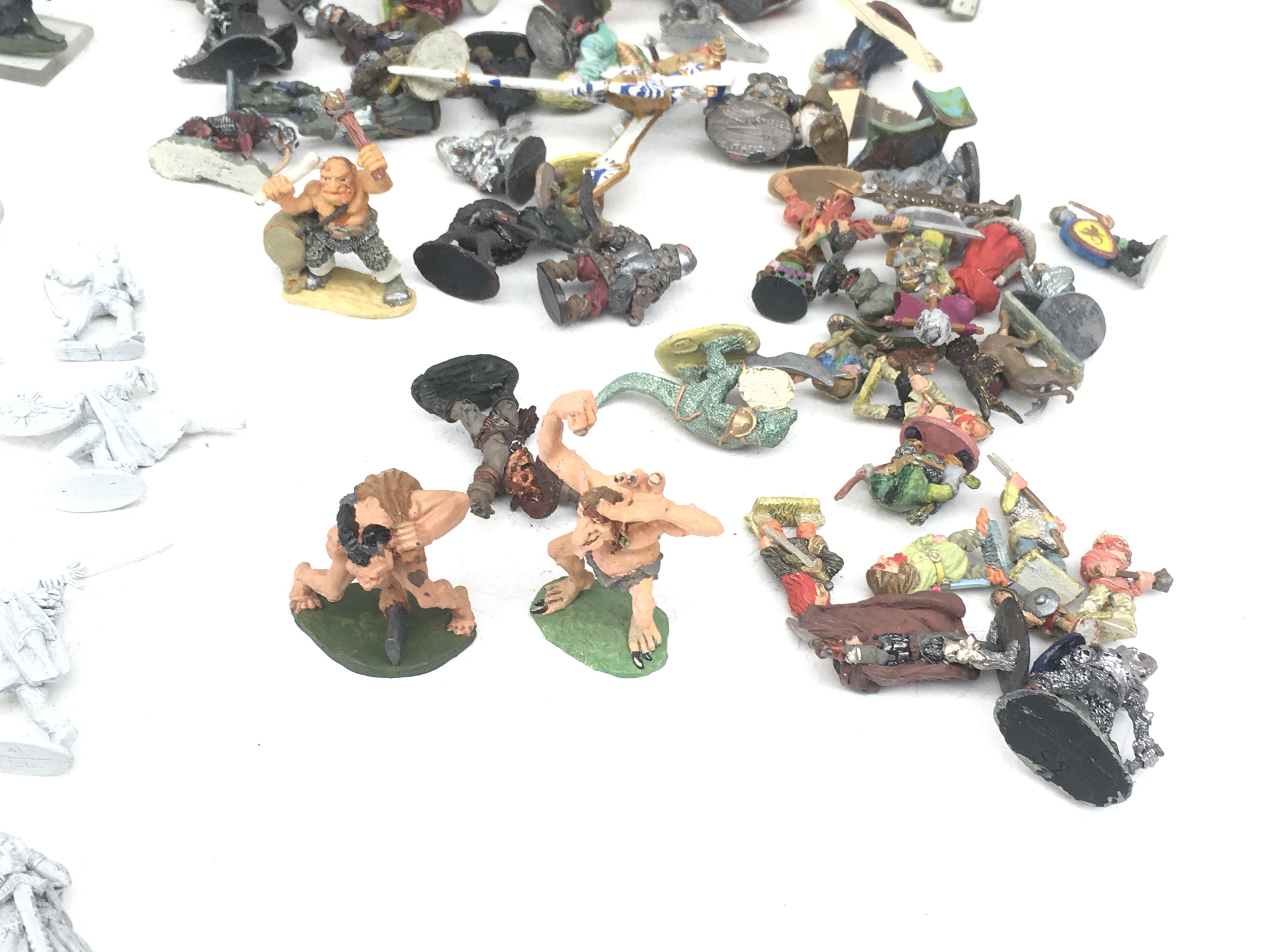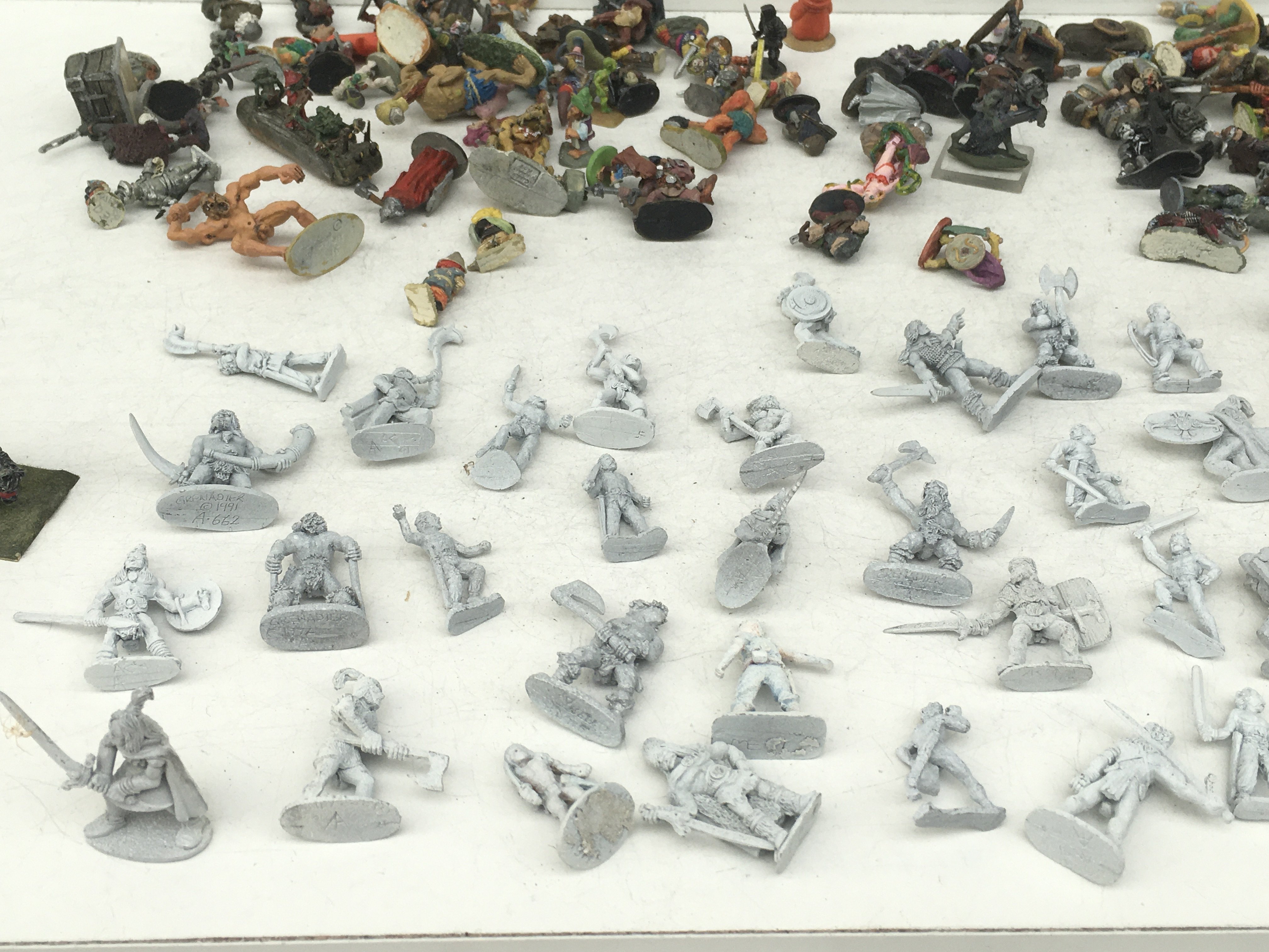 A box containing in excess of 100 mainly painted metal figures from a warhammer collection. Made by Grenadier and others