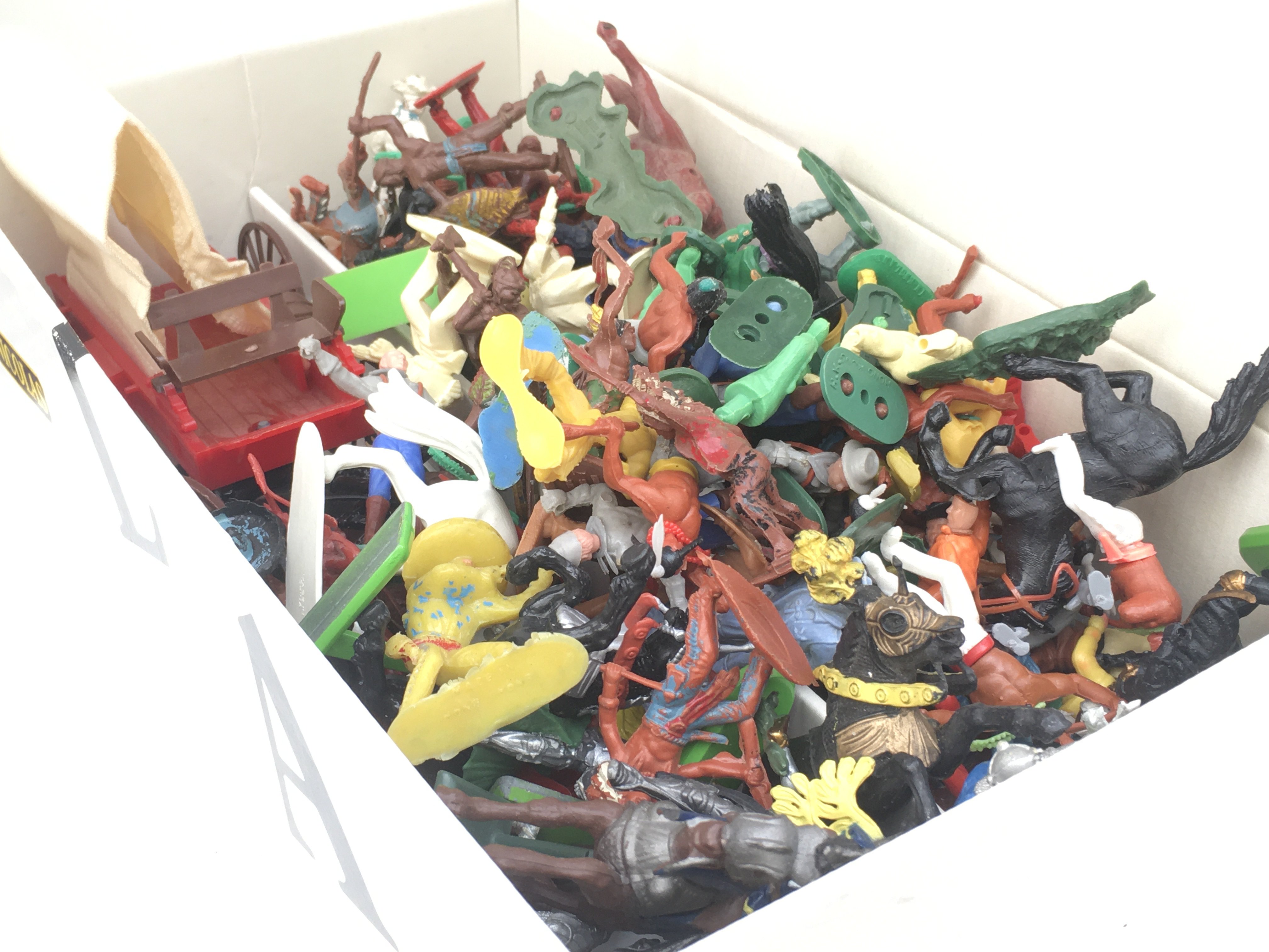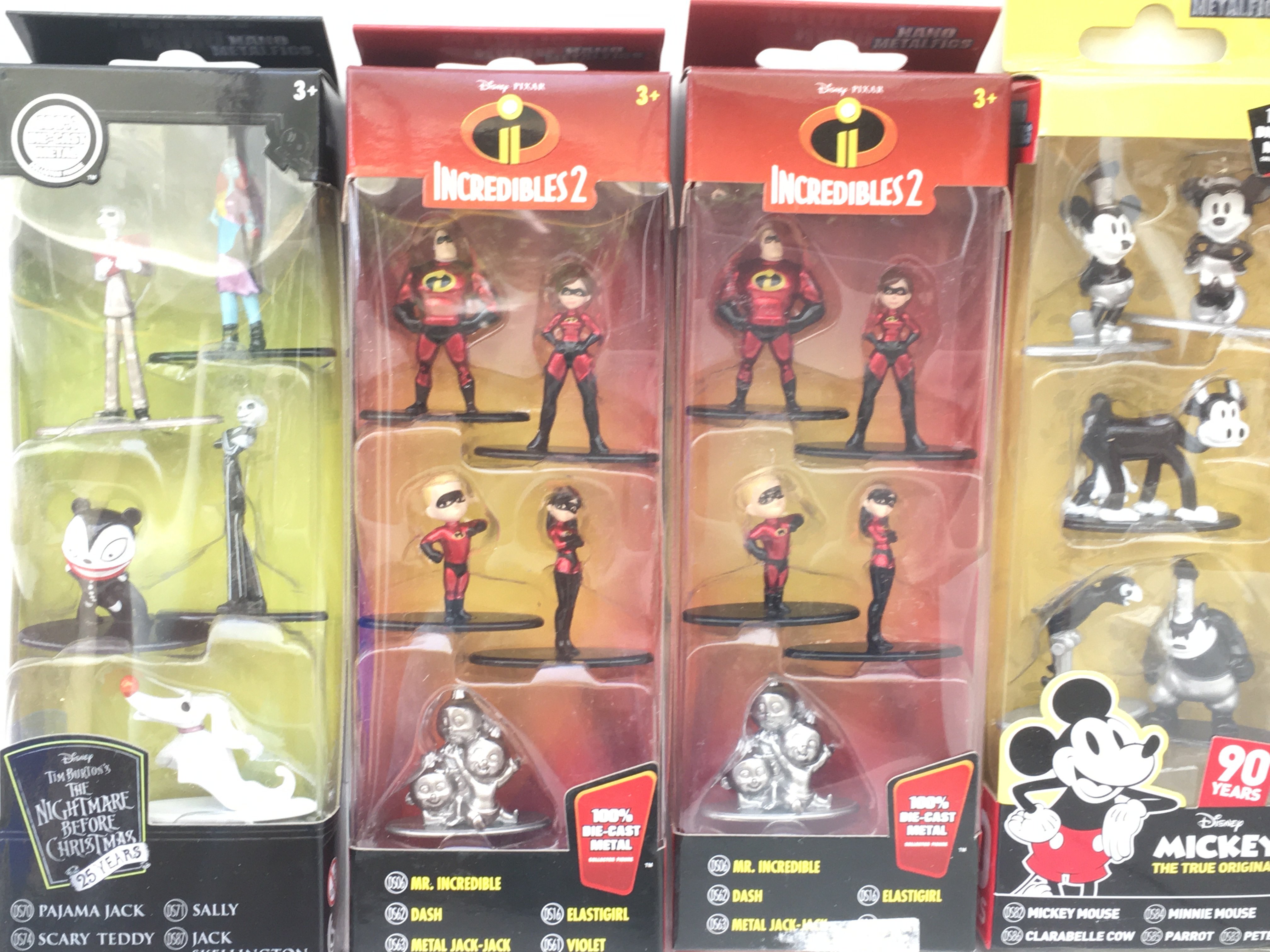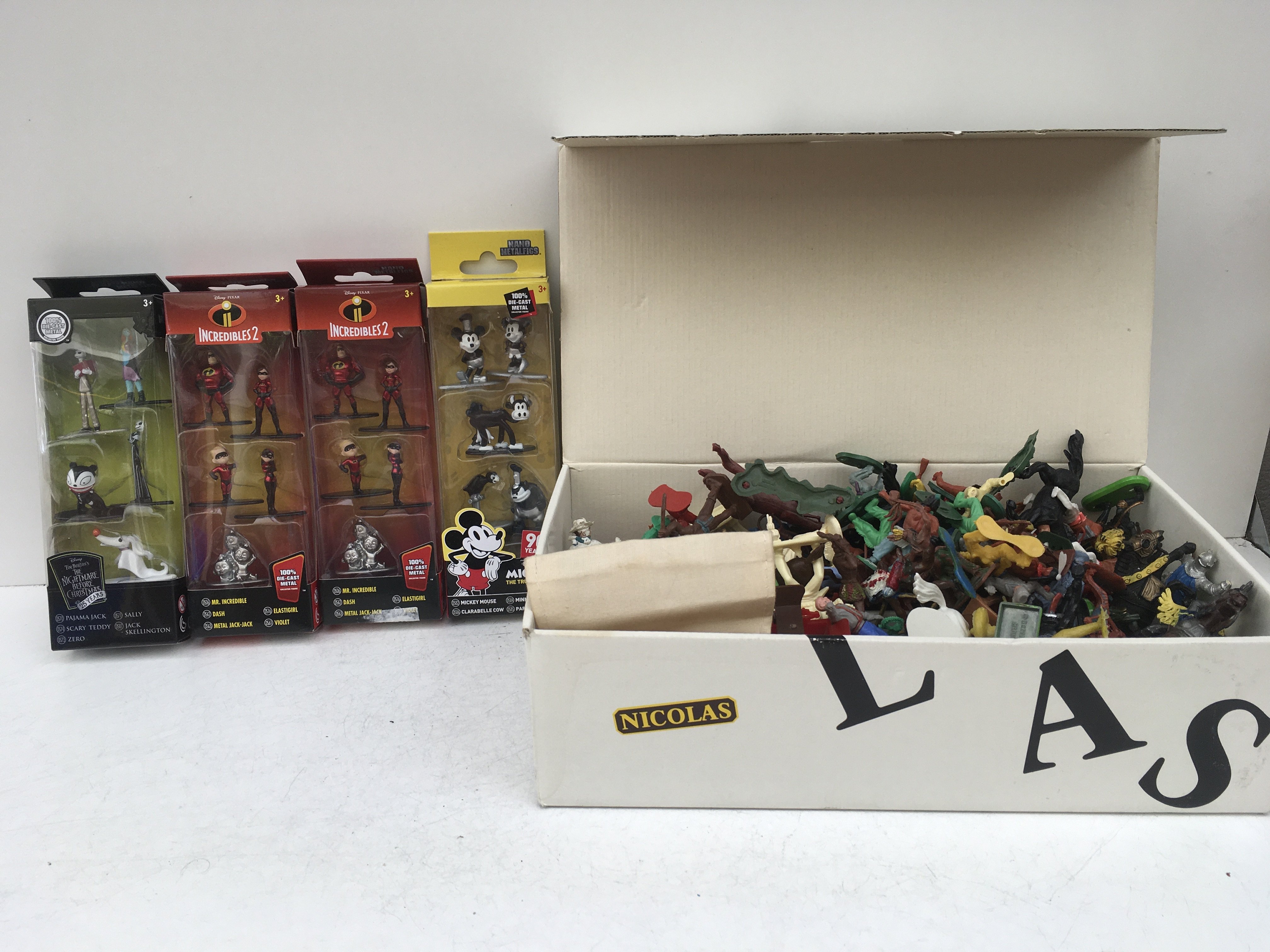 Four sets of Disney die cast minatures featuring INCREDIBLES 2..NIGHTMARE BEFORE CHRISTMAS..MICKEY.. Also a box containing plastic models comprising cowboys and Indians..Knights ..horses..a covered wagon.. some by Britains.